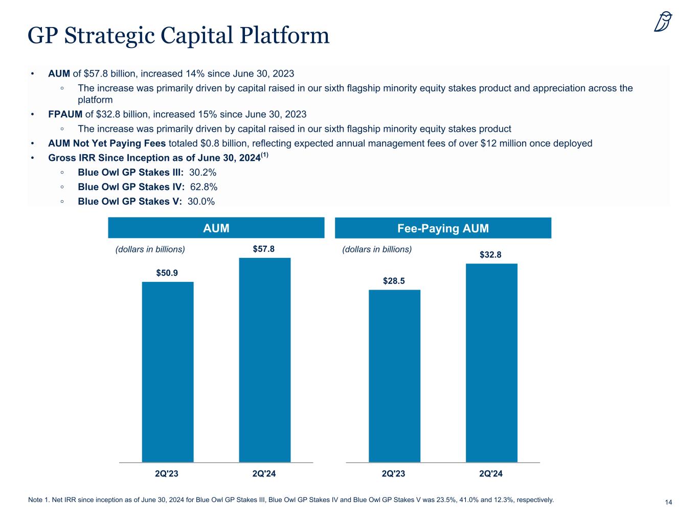 13 Credit Platform • AUM of $95.1 billion, increased 29% since June 30, 2023 ◦ The increase was primarily driven by capital raised in products from the diversified, technology and first lien lending strategies, and change in debt in products from the diversified lending strategy • FPAUM of $63.7 billion, increased 22% since June 30, 2023 ◦ The increase was primarily driven by capital raised in products from the diversified and technology lending strategies and deployment across the platform • Direct Originations during the quarter were $18.7 billion with net deployment of $7.2 billion ◦ Direct Originations for the last twelve months were $40.2 billion with net deployment of $15.5 billion • AUM Not Yet Paying Fees totaled $10.9 billion, reflecting expected annual management fees over $148 million once deployed • Direct Lending Gross Returns(1) of 3.0% for 2Q'24 and 16.4% over the last twelve months ended 2Q'24 AUM (dollars in billions) (dollars in billions) Fee-Paying AUM Note 1. Gross and net returns are represented by a composite comprised of Credit products within the direct lending investment strategies reported in the Blue Owl quarterly report on Form 10-Q for the quarter ended March 31, 2024. The composite excludes products that have launched within the last two years as such information is generally not meaningful. The net returns for aforementioned Credit products were 2.2% for 2Q'24 and 12.4% over the last twelve months ended 2Q'24. $73.8 $95.1 2Q'23 2Q'24 $52.1 $63.7 2Q'23 2Q'24