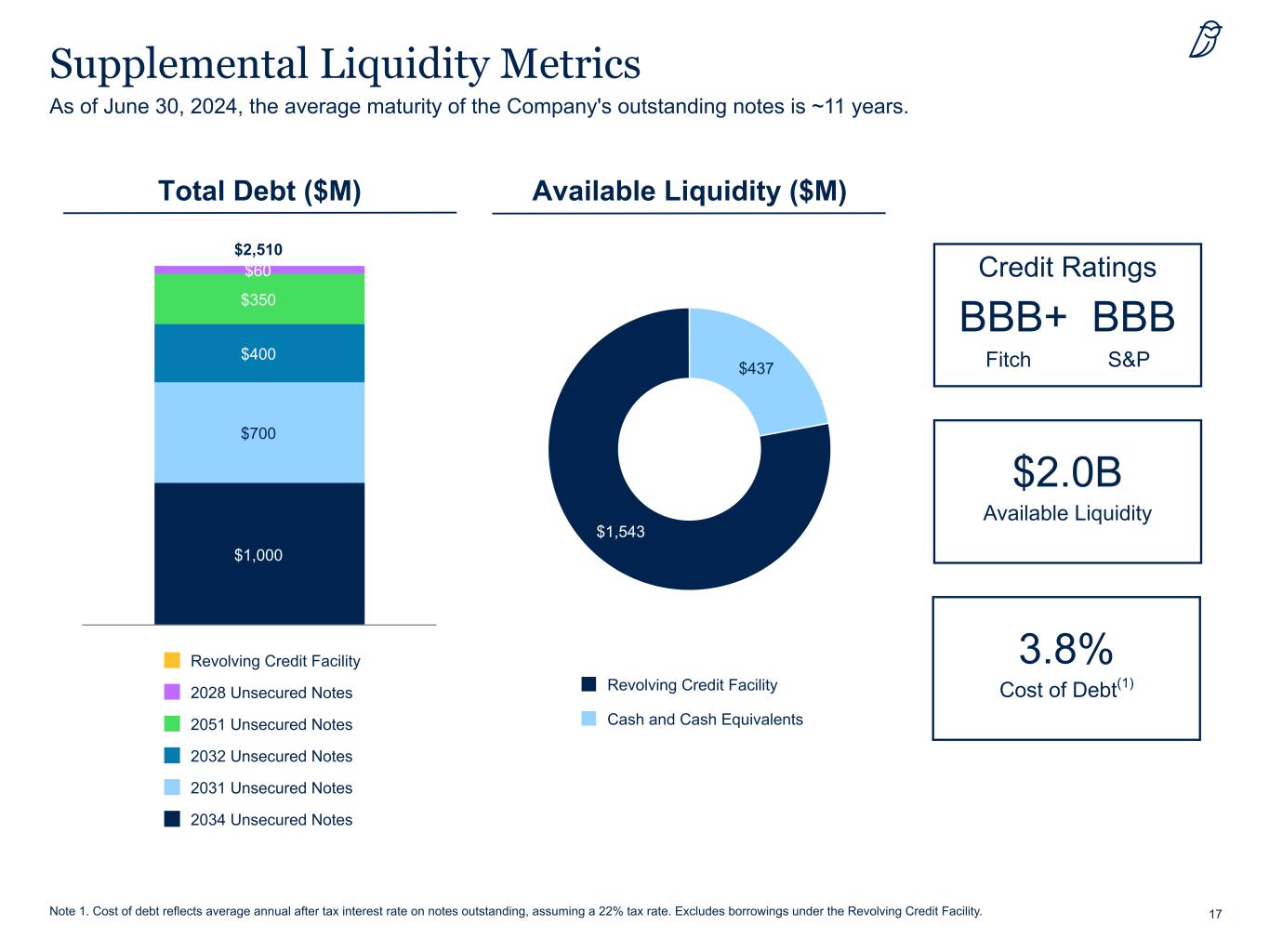 17 As of June 30, 2024, the average maturity of the Company's outstanding notes is ~11 years. Note 1. Cost of debt reflects average annual after tax interest rate on notes outstanding, assuming a 22% tax rate. Excludes borrowings under the Revolving Credit Facility. Supplemental Liquidity Metrics Credit Ratings BBB+ BBB Fitch S&P Total Debt ($M) Available Liquidity ($M) 3.8% Cost of Debt(1) $759 $437 $1,543 Revolving Credit Facility Cash and Cash Equivalents $2,510 $1,000 $700 $400 $350 $60 Revolving Credit Facility 2028 Unsecured Notes 2051 Unsecured Notes 2032 Unsecured Notes 2031 Unsecured Notes 2034 Unsecured Notes $2.0B Available Liquidity