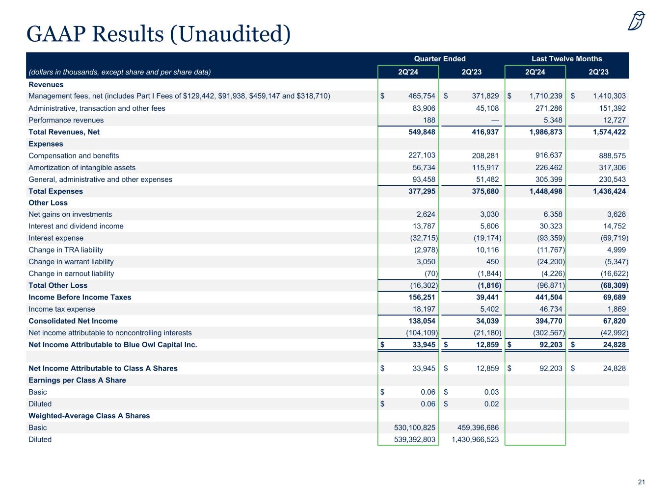 22 Quarter Ended (dollars in thousands, except per share data) 2Q'24 1Q'24 4Q'23 3Q'23 2Q'23 GAAP Revenues Management Fees, Net $ 465,754 $ 447,898 $ 410,578 $ 386,009 $ 371,829 Administrative, Transaction and Other Fees 83,906 63,397 80,342 43,641 45,108 Performance Revenues 188 2,045 3,115 — — GAAP Revenues 549,848 513,340 494,035 429,650 416,937 GAAP Expenses Compensation and Benefits 227,103 224,791 250,767 213,976 208,281 Amortization of Intangible Assets 56,734 56,195 56,809 56,724 115,917 General, Administrative and Other Expenses 93,458 76,748 69,708 65,485 51,482 GAAP Expenses 377,295 357,734 377,284 336,185 375,680 GAAP Results GAAP Net Income Attributable to Blue Owl Capital Inc. 33,945 25,091 18,058 15,109 12,859 Earnings per Class A Share Basic $ 0.06 $ 0.05 $ 0.04 $ 0.03 $ 0.03 Diluted $ 0.06 $ 0.04 $ 0.03 $ 0.03 $ 0.02 GAAP Results Summary (Unaudited)