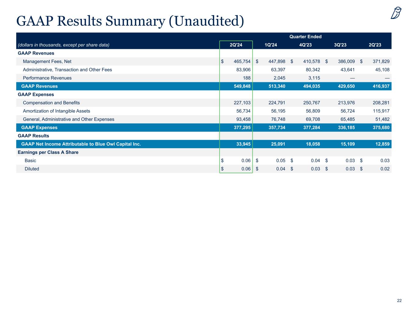 21 GAAP Results (Unaudited) Quarter Ended Last Twelve Months (dollars in thousands, except share and per share data) 2Q'24 2Q'23 2Q'24 2Q'23 Revenues Management fees, net (includes Part I Fees of $129,442, $91,938, $459,147 and $318,710) $ 465,754 $ 371,829 $ 1,710,239 $ 1,410,303 Administrative, transaction and other fees 83,906 45,108 271,286 151,392 Performance revenues 188 — 5,348 12,727 Total Revenues, Net 549,848 416,937 1,986,873 1,574,422 Expenses Compensation and benefits 227,103 208,281 916,637 888,575 Amortization of intangible assets 56,734 115,917 226,462 317,306 General, administrative and other expenses 93,458 51,482 305,399 230,543 Total Expenses 377,295 375,680 1,448,498 1,436,424 Other Loss Net gains on investments 2,624 3,030 6,358 3,628 Interest and dividend income 13,787 5,606 30,323 14,752 Interest expense (32,715) (19,174) (93,359) (69,719) Change in TRA liability (2,978) 10,116 (11,767) 4,999 Change in warrant liability 3,050 450 (24,200) (5,347) Change in earnout liability (70) (1,844) (4,226) (16,622) Total Other Loss (16,302) (1,816) (96,871) (68,309) Income Before Income Taxes 156,251 39,441 441,504 69,689 Income tax expense 18,197 5,402 46,734 1,869 Consolidated Net Income 138,054 34,039 394,770 67,820 Net income attributable to noncontrolling interests (104,109) (21,180) (302,567) (42,992) Net Income Attributable to Blue Owl Capital Inc. $ 33,945 $ 12,859 $ 92,203 $ 24,828 Net Income Attributable to Class A Shares $ 33,945 $ 12,859 $ 92,203 $ 24,828 Earnings per Class A Share Basic $ 0.06 $ 0.03 Diluted $ 0.06 $ 0.02 Weighted-Average Class A Shares Basic 530,100,825 459,396,686 Diluted 539,392,803 1,430,966,523