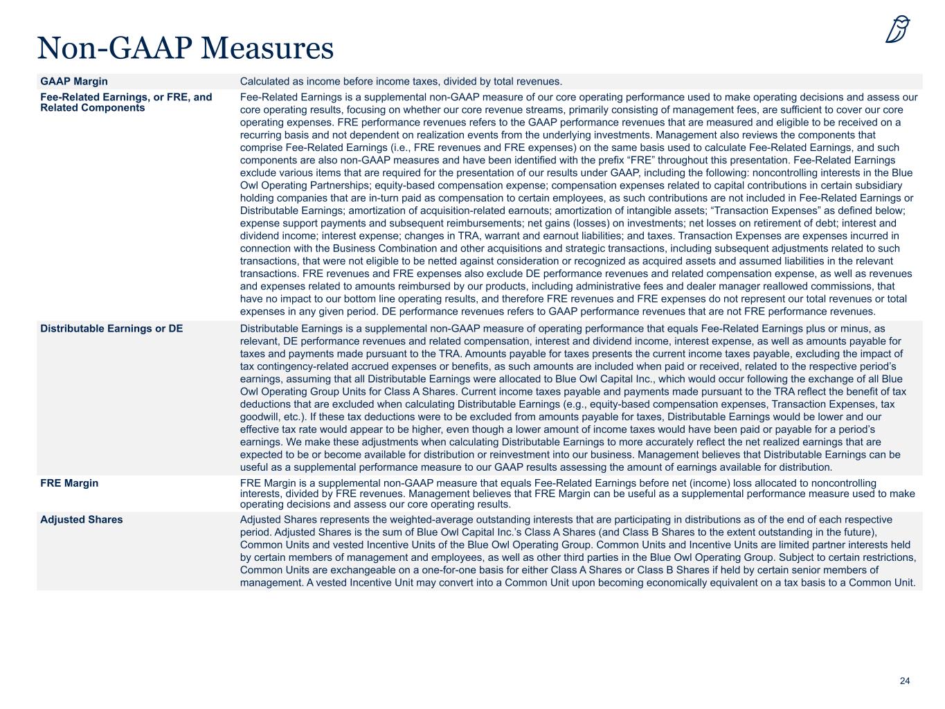 24 Non-GAAP Measures GAAP Margin Calculated as income before income taxes, divided by total revenues. Fee-Related Earnings, or FRE, and Related Components Fee-Related Earnings is a supplemental non-GAAP measure of our core operating performance used to make operating decisions and assess our core operating results, focusing on whether our core revenue streams, primarily consisting of management fees, are sufficient to cover our core operating expenses. FRE performance revenues refers to the GAAP performance revenues that are measured and eligible to be received on a recurring basis and not dependent on realization events from the underlying investments. Management also reviews the components that comprise Fee-Related Earnings (i.e., FRE revenues and FRE expenses) on the same basis used to calculate Fee-Related Earnings, and such components are also non-GAAP measures and have been identified with the prefix “FRE” throughout this presentation. Fee-Related Earnings exclude various items that are required for the presentation of our results under GAAP, including the following: noncontrolling interests in the Blue Owl Operating Partnerships; equity-based compensation expense; compensation expenses related to capital contributions in certain subsidiary holding companies that are in-turn paid as compensation to certain employees, as such contributions are not included in Fee-Related Earnings or Distributable Earnings; amortization of acquisition-related earnouts; amortization of intangible assets; “Transaction Expenses” as defined below; expense support payments and subsequent reimbursements; net gains (losses) on investments; net losses on retirement of debt; interest and dividend income; interest expense; changes in TRA, warrant and earnout liabilities; and taxes. Transaction Expenses are expenses incurred in connection with the Business Combination and other acquisitions and strategic transactions, including subsequent adjustments related to such transactions, that were not eligible to be netted against consideration or recognized as acquired assets and assumed liabilities in the relevant transactions. FRE revenues and FRE expenses also exclude DE performance revenues and related compensation expense, as well as revenues and expenses related to amounts reimbursed by our products, including administrative fees and dealer manager reallowed commissions, that have no impact to our bottom line operating results, and therefore FRE revenues and FRE expenses do not represent our total revenues or total expenses in any given period. DE performance revenues refers to GAAP performance revenues that are not FRE performance revenues. Distributable Earnings or DE Distributable Earnings is a supplemental non-GAAP measure of operating performance that equals Fee-Related Earnings plus or minus, as relevant, DE performance revenues and related compensation, interest and dividend income, interest expense, as well as amounts payable for taxes and payments made pursuant to the TRA. Amounts payable for taxes presents the current income taxes payable, excluding the impact of tax contingency-related accrued expenses or benefits, as such amounts are included when paid or received, related to the respective period’s earnings, assuming that all Distributable Earnings were allocated to Blue Owl Capital Inc., which would occur following the exchange of all Blue Owl Operating Group Units for Class A Shares. Current income taxes payable and payments made pursuant to the TRA reflect the benefit of tax deductions that are excluded when calculating Distributable Earnings (e.g., equity-based compensation expenses, Transaction Expenses, tax goodwill, etc.). If these tax deductions were to be excluded from amounts payable for taxes, Distributable Earnings would be lower and our effective tax rate would appear to be higher, even though a lower amount of income taxes would have been paid or payable for a period’s earnings. We make these adjustments when calculating Distributable Earnings to more accurately reflect the net realized earnings that are expected to be or become available for distribution or reinvestment into our business. Management believes that Distributable Earnings can be useful as a supplemental performance measure to our GAAP results assessing the amount of earnings available for distribution. FRE Margin FRE Margin is a supplemental non-GAAP measure that equals Fee-Related Earnings before net (income) loss allocated to noncontrolling interests, divided by FRE revenues. Management believes that FRE Margin can be useful as a supplemental performance measure used to make operating decisions and assess our core operating results. Adjusted Shares Adjusted Shares represents the weighted-average outstanding interests that are participating in distributions as of the end of each respective period. Adjusted Shares is the sum of Blue Owl Capital Inc.’s Class A Shares (and Class B Shares to the extent outstanding in the future), Common Units and vested Incentive Units of the Blue Owl Operating Group. Common Units and Incentive Units are limited partner interests held by certain members of management and employees, as well as other third parties in the Blue Owl Operating Group. Subject to certain restrictions, Common Units are exchangeable on a one-for-one basis for either Class A Shares or Class B Shares if held by certain senior members of management. A vested Incentive Unit may convert into a Common Unit upon becoming economically equivalent on a tax basis to a Common Unit.