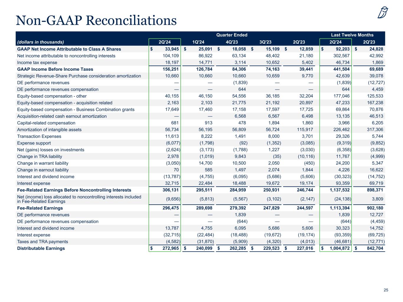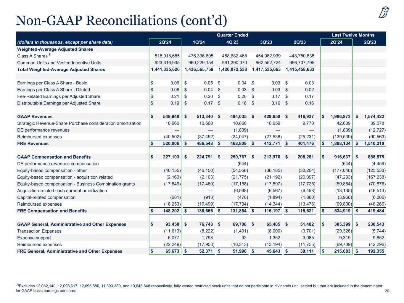 25 Non-GAAP Reconciliations Quarter Ended Last Twelve Months (dollars in thousands) 2Q'24 1Q'24 4Q'23 3Q'23 2Q'23 2Q'24 2Q'23 GAAP Net Income Attributable to Class A Shares $ 33,945 $ 25,091 $ 18,058 $ 15,109 $ 12,859 $ 92,203 $ 24,828 Net income attributable to noncontrolling interests 104,109 86,922 63,134 48,402 21,180 302,567 42,992 Income tax expense 18,197 14,771 3,114 10,652 5,402 46,734 1,869 GAAP Income Before Income Taxes 156,251 126,784 84,306 74,163 39,441 441,504 69,689 Strategic Revenue-Share Purchase consideration amortization 10,660 10,660 10,660 10,659 9,770 42,639 39,078 DE performance revenues — — (1,839) — — (1,839) (12,727) DE performance revenues compensation — — 644 — — 644 4,459 Equity-based compensation - other 40,155 46,150 54,556 36,185 32,204 177,046 125,533 Equity-based compensation - acquisition related 2,163 2,103 21,775 21,192 20,897 47,233 167,238 Equity-based compensation - Business Combination grants 17,649 17,460 17,158 17,597 17,725 69,864 70,876 Acquisition-related cash earnout amortization — — 6,568 6,567 6,498 13,135 46,513 Capital-related compensation 681 913 478 1,894 1,860 3,966 6,205 Amortization of intangible assets 56,734 56,195 56,809 56,724 115,917 226,462 317,306 Transaction Expenses 11,613 8,222 1,491 8,000 3,701 29,326 5,744 Expense support (6,077) (1,798) (92) (1,352) (3,085) (9,319) (9,852) Net (gains) losses on investments (2,624) (3,173) (1,788) 1,227 (3,030) (6,358) (3,628) Change in TRA liability 2,978 (1,019) 9,843 (35) (10,116) 11,767 (4,999) Change in warrant liability (3,050) 14,700 10,500 2,050 (450) 24,200 5,347 Change in earnout liability 70 585 1,497 2,074 1,844 4,226 16,622 Interest and dividend income (13,787) (4,755) (6,095) (5,686) (5,606) (30,323) (14,752) Interest expense 32,715 22,484 18,488 19,672 19,174 93,359 69,719 Fee-Related Earnings Before Noncontrolling Interests 306,131 295,511 284,959 250,931 246,744 1,137,532 898,371 Net (income) loss allocated to noncontrolling interests included in Fee-Related Earnings (9,656) (5,813) (5,567) (3,102) (2,147) (24,138) 3,809 Fee-Related Earnings 296,475 289,698 279,392 247,829 244,597 1,113,394 902,180 DE performance revenues — — 1,839 — — 1,839 12,727 DE performance revenues compensation — — (644) — — (644) (4,459) Interest and dividend income 13,787 4,755 6,095 5,686 5,606 30,323 14,752 Interest expense (32,715) (22,484) (18,488) (19,672) (19,174) (93,359) (69,725) Taxes and TRA payments (4,582) (31,870) (5,909) (4,320) (4,013) (46,681) (12,771) Distributable Earnings $ 272,965 $ 240,099 $ 262,285 $ 229,523 $ 227,016 $ 1,004,872 $ 842,704