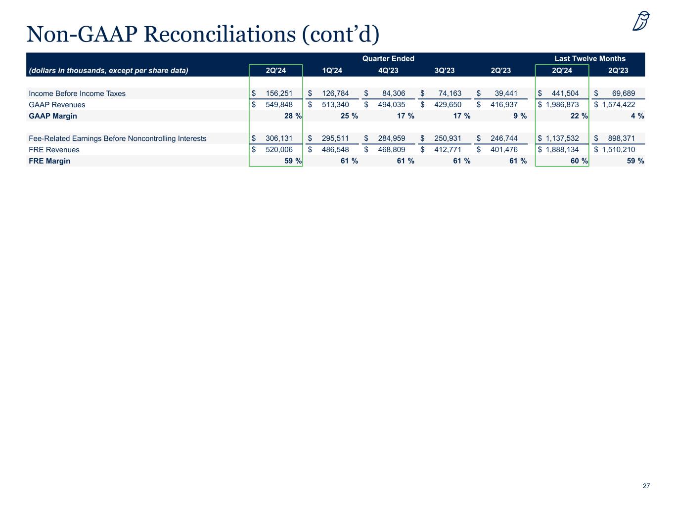 26 Non-GAAP Reconciliations (cont’d) Quarter Ended Last Twelve Months (dollars in thousands, except per share data) 2Q'24 1Q'24 4Q'23 3Q'23 2Q'23 2Q'24 2Q'23 Weighted-Average Adjusted Shares Class A Shares(1) 518,018,685 476,336,605 458,682,468 454,982,939 448,750,838 Common Units and Vested Incentive Units 923,316,935 960,229,154 961,390,070 962,552,724 966,707,795 Total Weighted-Average Adjusted Shares 1,441,335,620 1,436,565,759 1,420,072,538 1,417,535,663 1,415,458,633 Earnings per Class A Share - Basic $ 0.06 $ 0.05 $ 0.04 $ 0.03 $ 0.03 Earnings per Class A Share - Diluted $ 0.06 $ 0.04 $ 0.03 $ 0.03 $ 0.02 Fee-Related Earnings per Adjusted Share $ 0.21 $ 0.20 $ 0.20 $ 0.17 $ 0.17 Distributable Earnings per Adjusted Share $ 0.19 $ 0.17 $ 0.18 $ 0.16 $ 0.16 GAAP Revenues $ 549,848 $ 513,340 $ 494,035 $ 429,650 $ 416,937 $ 1,986,873 $ 1,574,422 Strategic Revenue-Share Purchase consideration amortization 10,660 10,660 10,660 10,659 9,770 42,639 39,078 DE performance revenues — — (1,839) — — (1,839) (12,727) Reimbursed expenses (40,502) (37,452) (34,047) (27,538) (25,231) (139,539) (90,563) FRE Revenues $ 520,006 $ 486,548 $ 468,809 $ 412,771 $ 401,476 $ 1,888,134 $ 1,510,210 GAAP Compensation and Benefits $ 227,103 $ 224,791 $ 250,767 $ 213,976 $ 208,281 $ 916,637 $ 888,575 DE performance revenues compensation — — (644) — — (644) (4,459) Equity-based compensation - other (40,155) (46,150) (54,556) (36,185) (32,204) (177,046) (125,533) Equity-based compensation - acquisition related (2,163) (2,103) (21,775) (21,192) (20,897) (47,233) (167,238) Equity-based compensation - Business Combination grants (17,649) (17,460) (17,158) (17,597) (17,725) (69,864) (70,876) Acquisition-related cash earnout amortization — — (6,568) (6,567) (6,498) (13,135) (46,513) Capital-related compensation (681) (913) (478) (1,894) (1,860) (3,966) (6,206) Reimbursed expenses (18,253) (19,499) (17,734) (14,344) (13,476) (69,830) (48,266) FRE Compensation and Benefits $ 148,202 $ 138,666 $ 131,854 $ 116,197 $ 115,621 $ 534,919 $ 419,484 GAAP General, Administrative and Other Expenses $ 93,458 $ 76,748 $ 69,708 $ 65,485 $ 51,482 $ 305,399 $ 230,543 Transaction Expenses (11,613) (8,222) (1,491) (8,000) (3,701) (29,326) (5,744) Expense support 6,077 1,798 92 1,352 3,085 9,319 9,852 Reimbursed expenses (22,249) (17,953) (16,313) (13,194) (11,755) (69,709) (42,296) FRE General, Administrative and Other Expenses $ 65,673 $ 52,371 $ 51,996 $ 45,643 $ 39,111 $ 215,683 $ 192,355 (1)Excludes 12,082,140, 12,098,617, 12,095,880, 11,393,389, and 10,645,848 respectively, fully vested restricted stock units that do not participate in dividends until settled but that are included in the denominator for GAAP basic earnings per share.
