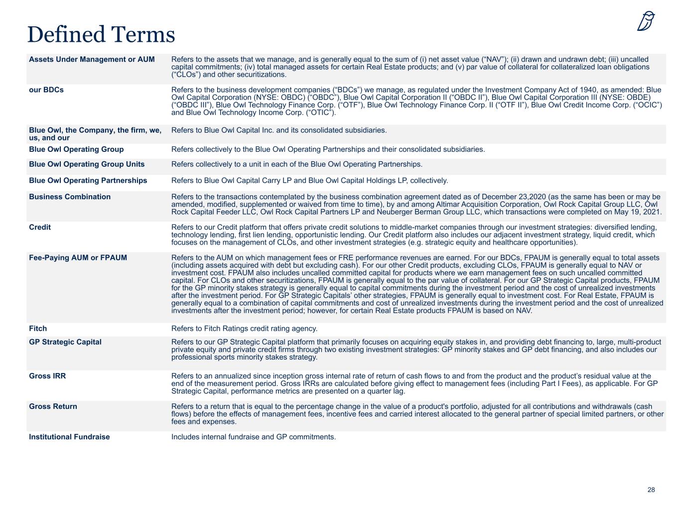 28 Defined Terms Assets Under Management or AUM Refers to the assets that we manage, and is generally equal to the sum of (i) net asset value (“NAV”); (ii) drawn and undrawn debt; (iii) uncalled capital commitments; (iv) total managed assets for certain Real Estate products; and (v) par value of collateral for collateralized loan obligations (“CLOs”) and other securitizations. our BDCs Refers to the business development companies (“BDCs”) we manage, as regulated under the Investment Company Act of 1940, as amended: Blue Owl Capital Corporation (NYSE: OBDC) (“OBDC”), Blue Owl Capital Corporation II (“OBDC II”), Blue Owl Capital Corporation III (NYSE: OBDE) (“OBDC III”), Blue Owl Technology Finance Corp. (“OTF”), Blue Owl Technology Finance Corp. II (“OTF II”), Blue Owl Credit Income Corp. (“OCIC”) and Blue Owl Technology Income Corp. (“OTIC”). Blue Owl, the Company, the firm, we, us, and our Refers to Blue Owl Capital Inc. and its consolidated subsidiaries. Blue Owl Operating Group Refers collectively to the Blue Owl Operating Partnerships and their consolidated subsidiaries. Blue Owl Operating Group Units Refers collectively to a unit in each of the Blue Owl Operating Partnerships. Blue Owl Operating Partnerships Refers to Blue Owl Capital Carry LP and Blue Owl Capital Holdings LP, collectively. Business Combination Refers to the transactions contemplated by the business combination agreement dated as of December 23,2020 (as the same has been or may be amended, modified, supplemented or waived from time to time), by and among Altimar Acquisition Corporation, Owl Rock Capital Group LLC, Owl Rock Capital Feeder LLC, Owl Rock Capital Partners LP and Neuberger Berman Group LLC, which transactions were completed on May 19, 2021. Credit Refers to our Credit platform that offers private credit solutions to middle-market companies through our investment strategies: diversified lending, technology lending, first lien lending, opportunistic lending. Our Credit platform also includes our adjacent investment strategy, liquid credit, which focuses on the management of CLOs, and other investment strategies (e.g. strategic equity and healthcare opportunities). Fee-Paying AUM or FPAUM Refers to the AUM on which management fees or FRE performance revenues are earned. For our BDCs, FPAUM is generally equal to total assets (including assets acquired with debt but excluding cash). For our other Credit products, excluding CLOs, FPAUM is generally equal to NAV or investment cost. FPAUM also includes uncalled committed capital for products where we earn management fees on such uncalled committed capital. For CLOs and other securitizations, FPAUM is generally equal to the par value of collateral. For our GP Strategic Capital products, FPAUM for the GP minority stakes strategy is generally equal to capital commitments during the investment period and the cost of unrealized investments after the investment period. For GP Strategic Capitals’ other strategies, FPAUM is generally equal to investment cost. For Real Estate, FPAUM is generally equal to a combination of capital commitments and cost of unrealized investments during the investment period and the cost of unrealized investments after the investment period; however, for certain Real Estate products FPAUM is based on NAV. Fitch Refers to Fitch Ratings credit rating agency. GP Strategic Capital Refers to our GP Strategic Capital platform that primarily focuses on acquiring equity stakes in, and providing debt financing to, large, multi-product private equity and private credit firms through two existing investment strategies: GP minority stakes and GP debt financing, and also includes our professional sports minority stakes strategy. Gross IRR Refers to an annualized since inception gross internal rate of return of cash flows to and from the product and the product’s residual value at the end of the measurement period. Gross IRRs are calculated before giving effect to management fees (including Part I Fees), as applicable. For GP Strategic Capital, performance metrics are presented on a quarter lag. Gross Return Refers to a return that is equal to the percentage change in the value of a product's portfolio, adjusted for all contributions and withdrawals (cash flows) before the effects of management fees, incentive fees and carried interest allocated to the general partner of special limited partners, or other fees and expenses. Institutional Fundraise Includes internal fundraise and GP commitments.