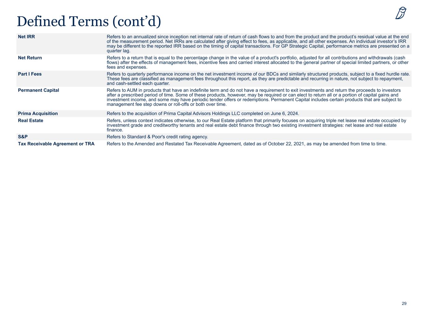 29 Defined Terms (cont’d) Net IRR Refers to an annualized since inception net internal rate of return of cash flows to and from the product and the product’s residual value at the end of the measurement period. Net IRRs are calculated after giving effect to fees, as applicable, and all other expenses. An individual investor’s IRR may be different to the reported IRR based on the timing of capital transactions. For GP Strategic Capital, performance metrics are presented on a quarter lag. Net Return Refers to a return that is equal to the percentage change in the value of a product's portfolio, adjusted for all contributions and withdrawals (cash flows) after the effects of management fees, incentive fees and carried interest allocated to the general partner of special limited partners, or other fees and expenses. Part I Fees Refers to quarterly performance income on the net investment income of our BDCs and similarly structured products, subject to a fixed hurdle rate. These fees are classified as management fees throughout this report, as they are predictable and recurring in nature, not subject to repayment, and cash-settled each quarter. Permanent Capital Refers to AUM in products that have an indefinite term and do not have a requirement to exit investments and return the proceeds to investors after a prescribed period of time. Some of these products, however, may be required or can elect to return all or a portion of capital gains and investment income, and some may have periodic tender offers or redemptions. Permanent Capital includes certain products that are subject to management fee step downs or roll-offs or both over time. Prima Acquisition Refers to the acquisition of Prima Capital Advisors Holdings LLC completed on June 6, 2024. Real Estate Refers, unless context indicates otherwise, to our Real Estate platform that primarily focuses on acquiring triple net lease real estate occupied by investment grade and creditworthy tenants and real estate debt finance through two existing investment strategies: net lease and real estate finance. S&P Refers to Standard & Poor's credit rating agency. Tax Receivable Agreement or TRA Refers to the Amended and Restated Tax Receivable Agreement, dated as of October 22, 2021, as may be amended from time to time.