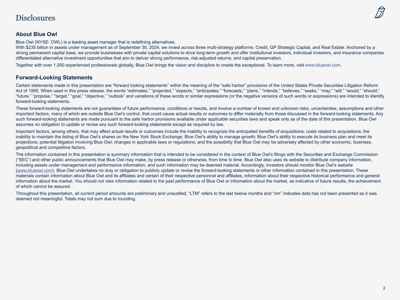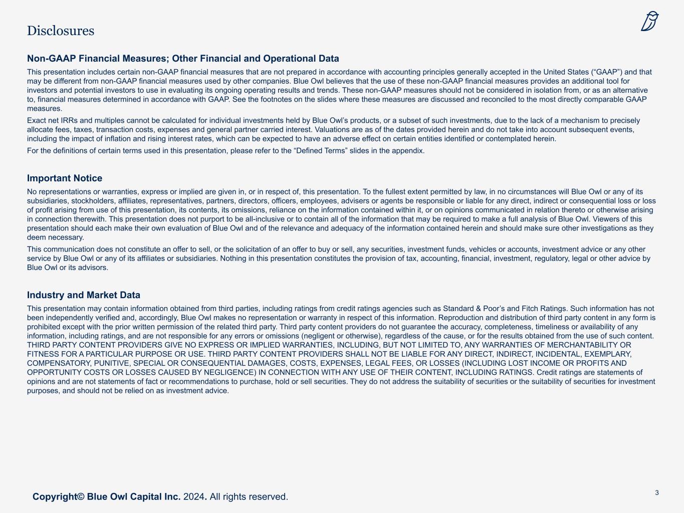2 About Blue Owl Blue Owl (NYSE: OWL) is a leading asset manager that is redefining alternatives. With $235 billion in assets under management as of September 30, 2024, we invest across three multi-strategy platforms: Credit, GP Strategic Capital, and Real Estate. Anchored by a strong permanent capital base, we provide businesses with private capital solutions to drive long-term growth and offer institutional investors, individual investors, and insurance companies differentiated alternative investment opportunities that aim to deliver strong performance, risk-adjusted returns, and capital preservation. Together with over 1,050 experienced professionals globally, Blue Owl brings the vision and discipline to create the exceptional. To learn more, visit www.blueowl.com. Forward-Looking Statements Certain statements made in this presentation are “forward looking statements” within the meaning of the “safe harbor” provisions of the United States Private Securities Litigation Reform Act of 1995. When used in this press release, the words “estimates,” “projected,” “expects,” “anticipates,” “forecasts,” “plans,” “intends,” “believes,” “seeks,” “may,” “will,” “would,” “should,” “future,” “propose,” “target,” “goal,” “objective,” “outlook” and variations of these words or similar expressions (or the negative versions of such words or expressions) are intended to identify forward-looking statements. These forward-looking statements are not guarantees of future performance, conditions or results, and involve a number of known and unknown risks, uncertainties, assumptions and other important factors, many of which are outside Blue Owl’s control, that could cause actual results or outcomes to differ materially from those discussed in the forward-looking statements. Any such forward-looking statements are made pursuant to the safe harbor provisions available under applicable securities laws and speak only as of the date of this presentation. Blue Owl assumes no obligation to update or revise any such forward-looking statements except as required by law. Important factors, among others, that may affect actual results or outcomes include the inability to recognize the anticipated benefits of acquisitions; costs related to acquisitions; the inability to maintain the listing of Blue Owl’s shares on the New York Stock Exchange; Blue Owl’s ability to manage growth; Blue Owl’s ability to execute its business plan and meet its projections; potential litigation involving Blue Owl; changes in applicable laws or regulations; and the possibility that Blue Owl may be adversely affected by other economic, business, geopolitical and competitive factors. The information contained in this presentation is summary information that is intended to be considered in the context of Blue Owl’s filings with the Securities and Exchange Commission (“SEC”) and other public announcements that Blue Owl may make, by press release or otherwise, from time to time. Blue Owl also uses its website to distribute company information, including assets under management and performance information, and such information may be deemed material. Accordingly, investors should monitor Blue Owl’s website (www.blueowl.com). Blue Owl undertakes no duty or obligation to publicly update or revise the forward-looking statements or other information contained in this presentation. These materials contain information about Blue Owl and its affiliates and certain of their respective personnel and affiliates, information about their respective historical performance and general information about the market. You should not view information related to the past performance of Blue Owl or information about the market, as indicative of future results, the achievement of which cannot be assured. Throughout this presentation, all current period amounts are preliminary and unaudited, “LTM” refers to the last twelve months and “nm” indicates data has not been presented as it was deemed not meaningful. Totals may not sum due to rounding. Disclosures