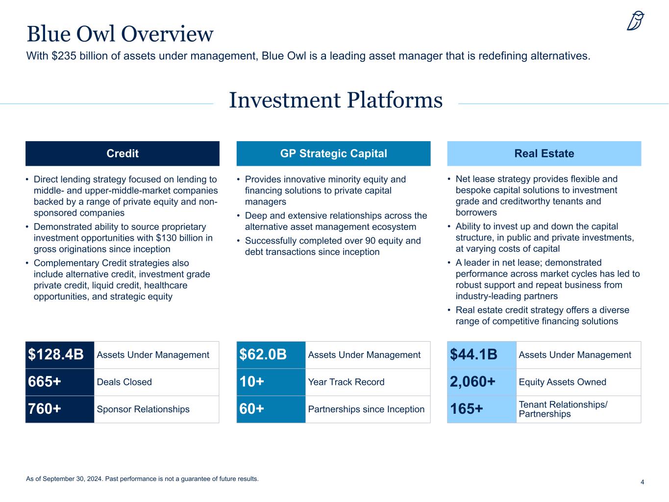 3 Disclosures Non-GAAP Financial Measures; Other Financial and Operational Data This presentation includes certain non-GAAP financial measures that are not prepared in accordance with accounting principles generally accepted in the United States (“GAAP”) and that may be different from non-GAAP financial measures used by other companies. Blue Owl believes that the use of these non-GAAP financial measures provides an additional tool for investors and potential investors to use in evaluating its ongoing operating results and trends. These non-GAAP measures should not be considered in isolation from, or as an alternative to, financial measures determined in accordance with GAAP. See the footnotes on the slides where these measures are discussed and reconciled to the most directly comparable GAAP measures. Exact net IRRs and multiples cannot be calculated for individual investments held by Blue Owl’s products, or a subset of such investments, due to the lack of a mechanism to precisely allocate fees, taxes, transaction costs, expenses and general partner carried interest. Valuations are as of the dates provided herein and do not take into account subsequent events, including the impact of inflation and rising interest rates, which can be expected to have an adverse effect on certain entities identified or contemplated herein. For the definitions of certain terms used in this presentation, please refer to the “Defined Terms” slides in the appendix. Important Notice No representations or warranties, express or implied are given in, or in respect of, this presentation. To the fullest extent permitted by law, in no circumstances will Blue Owl or any of its subsidiaries, stockholders, affiliates, representatives, partners, directors, officers, employees, advisers or agents be responsible or liable for any direct, indirect or consequential loss or loss of profit arising from use of this presentation, its contents, its omissions, reliance on the information contained within it, or on opinions communicated in relation thereto or otherwise arising in connection therewith. This presentation does not purport to be all-inclusive or to contain all of the information that may be required to make a full analysis of Blue Owl. Viewers of this presentation should each make their own evaluation of Blue Owl and of the relevance and adequacy of the information contained herein and should make sure other investigations as they deem necessary. This communication does not constitute an offer to sell, or the solicitation of an offer to buy or sell, any securities, investment funds, vehicles or accounts, investment advice or any other service by Blue Owl or any of its affiliates or subsidiaries. Nothing in this presentation constitutes the provision of tax, accounting, financial, investment, regulatory, legal or other advice by Blue Owl or its advisors. Industry and Market Data This presentation may contain information obtained from third parties, including ratings from credit ratings agencies such as Standard & Poor’s and Fitch Ratings. Such information has not been independently verified and, accordingly, Blue Owl makes no representation or warranty in respect of this information. Reproduction and distribution of third party content in any form is prohibited except with the prior written permission of the related third party. Third party content providers do not guarantee the accuracy, completeness, timeliness or availability of any information, including ratings, and are not responsible for any errors or omissions (negligent or otherwise), regardless of the cause, or for the results obtained from the use of such content. THIRD PARTY CONTENT PROVIDERS GIVE NO EXPRESS OR IMPLIED WARRANTIES, INCLUDING, BUT NOT LIMITED TO, ANY WARRANTIES OF MERCHANTABILITY OR FITNESS FOR A PARTICULAR PURPOSE OR USE. THIRD PARTY CONTENT PROVIDERS SHALL NOT BE LIABLE FOR ANY DIRECT, INDIRECT, INCIDENTAL, EXEMPLARY, COMPENSATORY, PUNITIVE, SPECIAL OR CONSEQUENTIAL DAMAGES, COSTS, EXPENSES, LEGAL FEES, OR LOSSES (INCLUDING LOST INCOME OR PROFITS AND OPPORTUNITY COSTS OR LOSSES CAUSED BY NEGLIGENCE) IN CONNECTION WITH ANY USE OF THEIR CONTENT, INCLUDING RATINGS. Credit ratings are statements of opinions and are not statements of fact or recommendations to purchase, hold or sell securities. They do not address the suitability of securities or the suitability of securities for investment purposes, and should not be relied on as investment advice. Copyright© Blue Owl Capital Inc. 2024. All rights reserved.