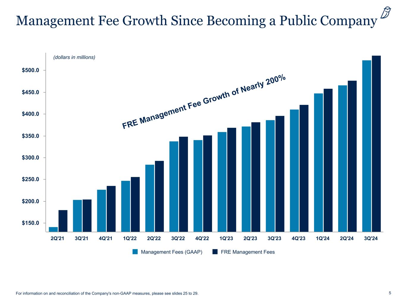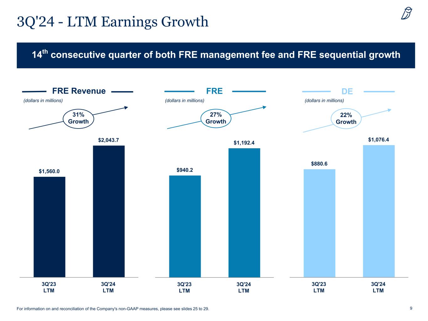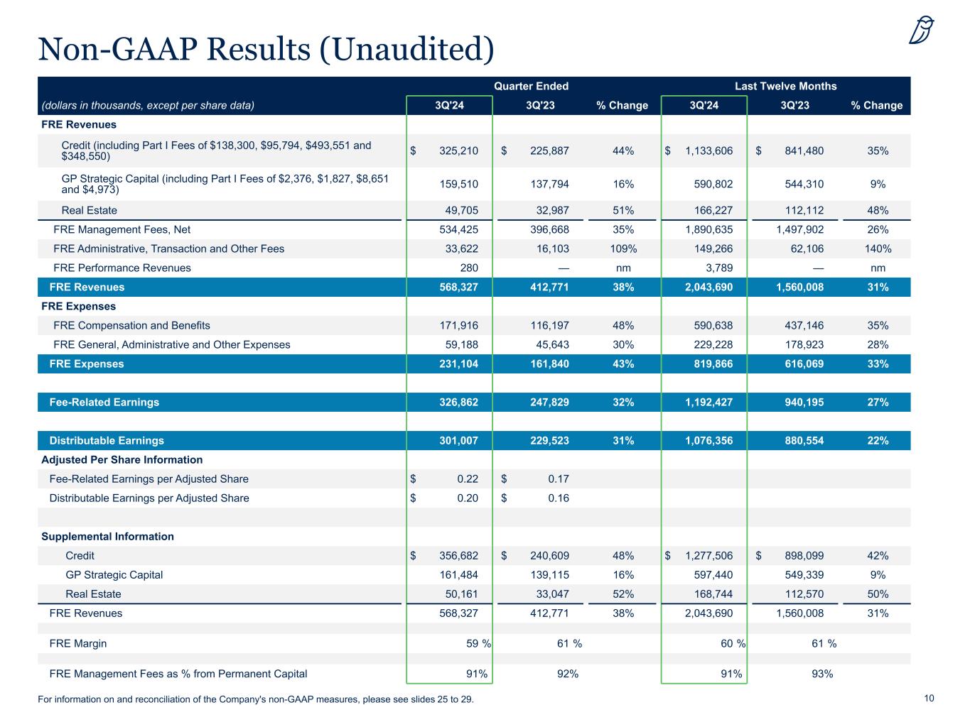 24 Quarter Ended (dollars in thousands, except per share data) 3Q'24 2Q'24 1Q'24 4Q'23 3Q'23 FRE Revenues FRE Management Fees, Net $ 534,425 $ 476,414 $ 458,558 $ 421,238 $ 396,668 FRE Administrative, Transaction and Other Fees 33,622 43,404 25,945 46,295 16,103 FRE Performance Revenues 280 188 2,045 1,276 — FRE Revenues 568,327 520,006 486,548 468,809 412,771 FRE Expenses FRE Compensation and Benefits 171,916 148,202 138,666 131,854 116,197 FRE General, Administrative and Other Expenses 59,188 65,673 52,371 51,996 45,643 FRE Expenses 231,104 213,875 191,037 183,850 161,840 Fee-Related Earnings 326,862 296,475 289,698 279,392 247,829 Distributable Earnings 301,007 272,965 240,099 262,285 229,523 Adjusted Per Share Information Fee-Related Earnings per Adjusted Share $ 0.22 $ 0.21 $ 0.20 $ 0.20 $ 0.17 Distributable Earnings per Adjusted Share $ 0.20 $ 0.19 $ 0.17 $ 0.18 $ 0.16 Non-GAAP Results Summary (Unaudited) For information on and reconciliation of the Company's non-GAAP measures, please see slides 25 to 29.