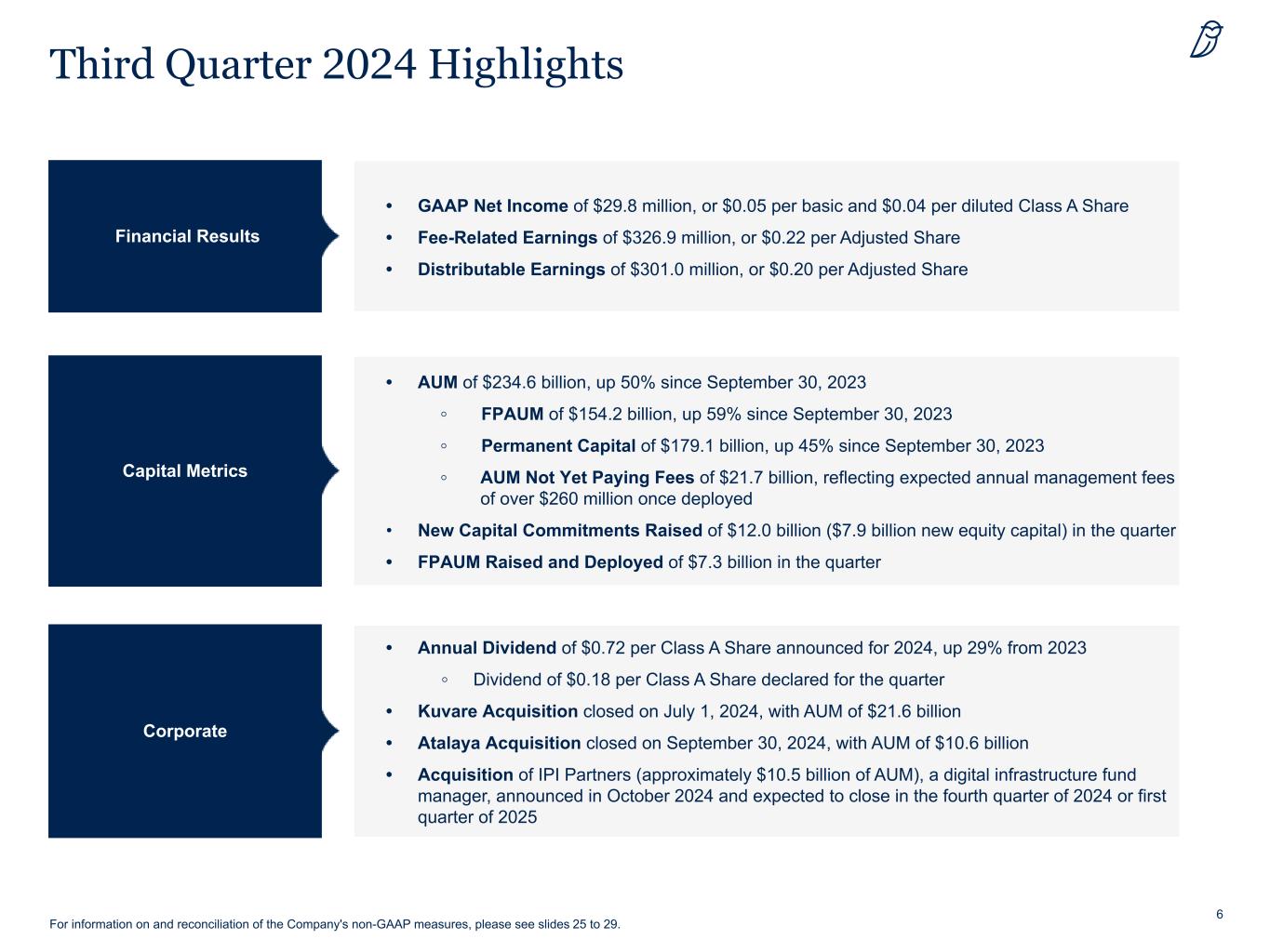 6 Third Quarter 2024 Highlights Financial Results • GAAP Net Income of $29.8 million, or $0.05 per basic and $0.04 per diluted Class A Share • Fee-Related Earnings of $326.9 million, or $0.22 per Adjusted Share • Distributable Earnings of $301.0 million, or $0.20 per Adjusted Share Capital Metrics • AUM of $234.6 billion, up 50% since September 30, 2023 ◦ FPAUM of $154.2 billion, up 59% since September 30, 2023 ◦ Permanent Capital of $179.1 billion, up 45% since September 30, 2023 ◦ AUM Not Yet Paying Fees of $21.7 billion, reflecting expected annual management fees of over $260 million once deployed • New Capital Commitments Raised of $12.0 billion ($7.9 billion new equity capital) in the quarter • FPAUM Raised and Deployed of $7.3 billion in the quarter Corporate For information on and reconciliation of the Company's non-GAAP measures, please see slides 25 to 29. • Annual Dividend of $0.72 per Class A Share announced for 2024, up 29% from 2023 ◦ Dividend of $0.18 per Class A Share declared for the quarter • Kuvare Acquisition closed on July 1, 2024, with AUM of $21.6 billion • Atalaya Acquisition closed on September 30, 2024, with AUM of $10.6 billion • Acquisition of IPI Partners (approximately $10.5 billion of AUM), a digital infrastructure fund manager, announced in October 2024 and expected to close in the fourth quarter of 2024 or first quarter of 2025