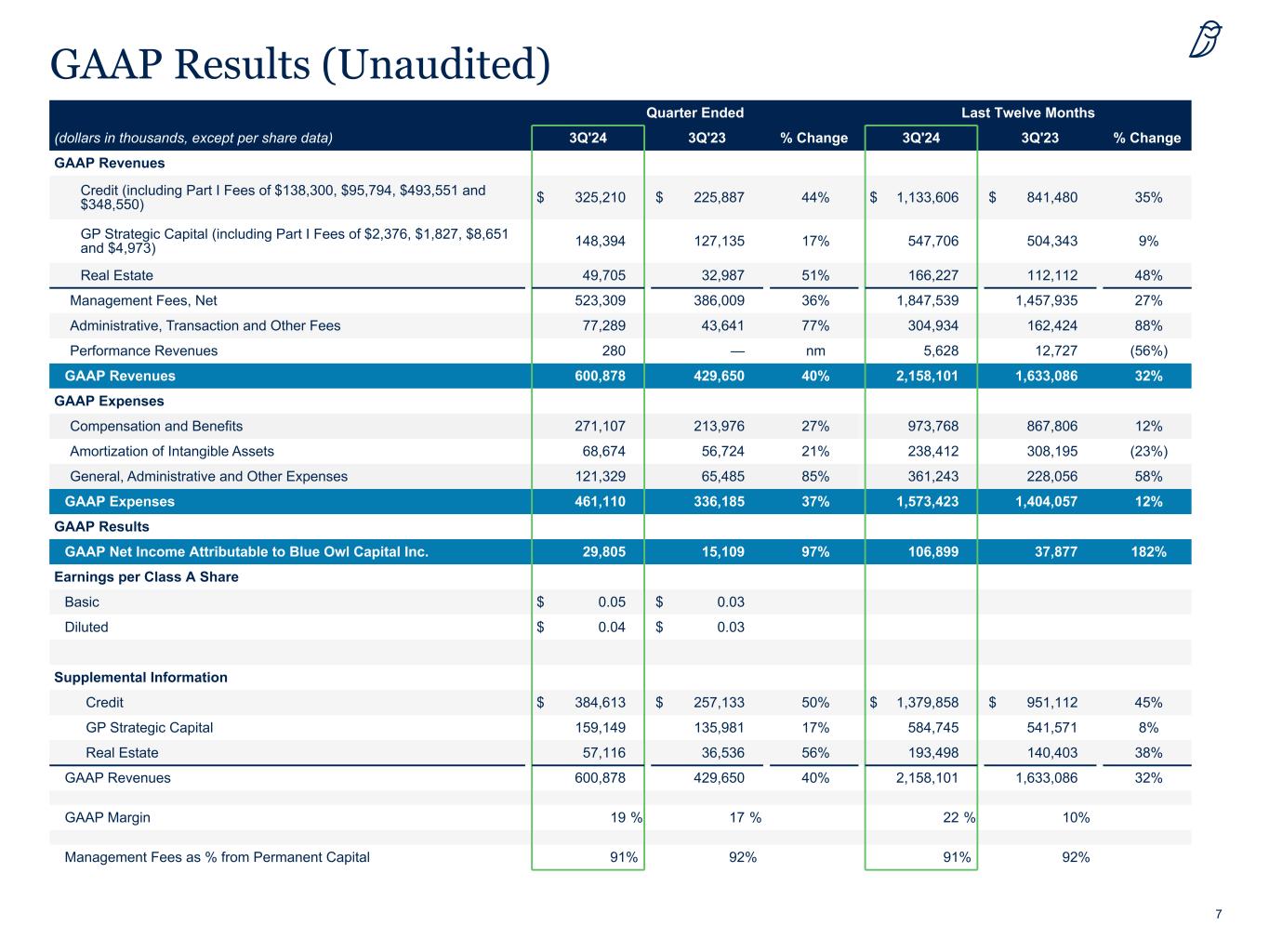 23 Quarter Ended (dollars in thousands, except per share data) 3Q'24 2Q'24 1Q'24 4Q'23 3Q'23 GAAP Revenues Management Fees, Net $ 523,309 $ 465,754 $ 447,898 $ 410,578 $ 386,009 Administrative, Transaction and Other Fees 77,289 83,906 63,397 80,342 43,641 Performance Revenues 280 188 2,045 3,115 — GAAP Revenues 600,878 549,848 513,340 494,035 429,650 GAAP Expenses Compensation and Benefits 271,107 227,103 224,791 250,767 213,976 Amortization of Intangible Assets 68,674 56,734 56,195 56,809 56,724 General, Administrative and Other Expenses 121,329 93,458 76,748 69,708 65,485 GAAP Expenses 461,110 377,295 357,734 377,284 336,185 GAAP Results GAAP Net Income Attributable to Blue Owl Capital Inc. 29,805 33,945 25,091 18,058 15,109 Earnings per Class A Share Basic $ 0.05 $ 0.06 $ 0.05 $ 0.04 $ 0.03 Diluted $ 0.04 $ 0.06 $ 0.04 $ 0.03 $ 0.03 GAAP Results Summary (Unaudited)