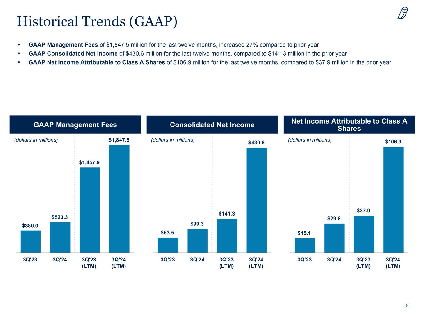 7 GAAP Results (Unaudited) Quarter Ended Last Twelve Months (dollars in thousands, except per share data) 3Q'24 3Q'23 % Change 3Q'24 3Q'23 % Change GAAP Revenues Credit (including Part I Fees of $138,300, $95,794, $493,551 and $348,550) $ 325,210 $ 225,887 44% $ 1,133,606 $ 841,480 35% GP Strategic Capital (including Part I Fees of $2,376, $1,827, $8,651 and $4,973) 148,394 127,135 17% 547,706 504,343 9% Real Estate 49,705 32,987 51% 166,227 112,112 48% Management Fees, Net 523,309 386,009 36% 1,847,539 1,457,935 27% Administrative, Transaction and Other Fees 77,289 43,641 77% 304,934 162,424 88% Performance Revenues 280 — nm 5,628 12,727 (56%) GAAP Revenues 600,878 429,650 40% 2,158,101 1,633,086 32% GAAP Expenses Compensation and Benefits 271,107 213,976 27% 973,768 867,806 12% Amortization of Intangible Assets 68,674 56,724 21% 238,412 308,195 (23%) General, Administrative and Other Expenses 121,329 65,485 85% 361,243 228,056 58% GAAP Expenses 461,110 336,185 37% 1,573,423 1,404,057 12% GAAP Results GAAP Net Income Attributable to Blue Owl Capital Inc. 29,805 15,109 97% 106,899 37,877 182% Earnings per Class A Share Basic $ 0.05 $ 0.03 Diluted $ 0.04 $ 0.03 Supplemental Information Credit $ 384,613 $ 257,133 50% $ 1,379,858 $ 951,112 45% GP Strategic Capital 159,149 135,981 17% 584,745 541,571 8% Real Estate 57,116 36,536 56% 193,498 140,403 38% GAAP Revenues 600,878 429,650 40% 2,158,101 1,633,086 32% GAAP Margin 19 % 17 % 22 % 10% Management Fees as % from Permanent Capital 91% 92% 91% 92%