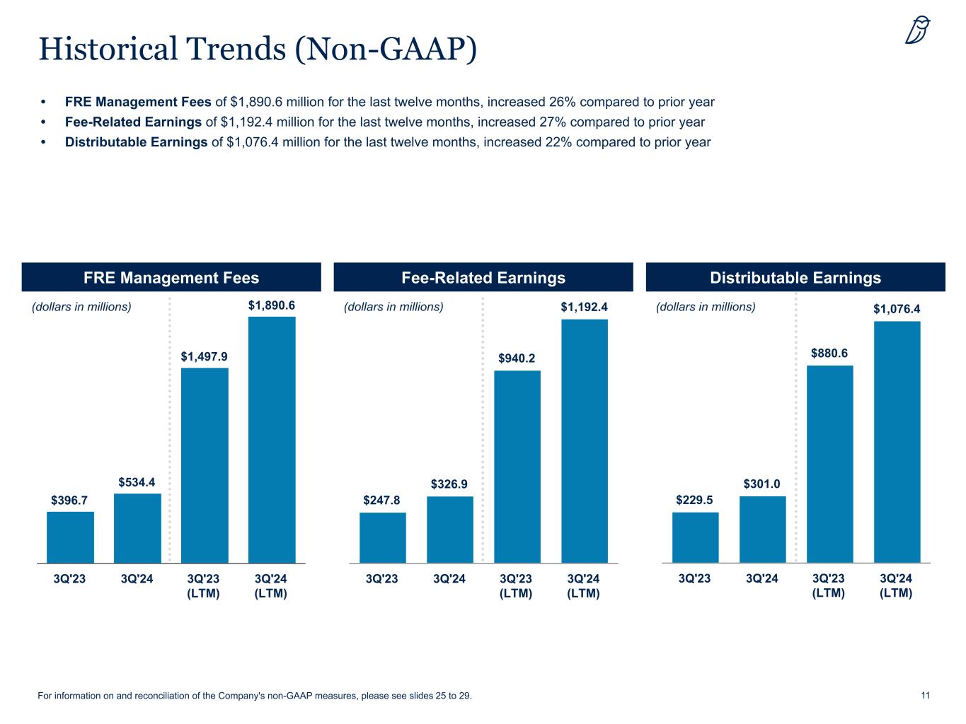 10 Non-GAAP Results (Unaudited) For information on and reconciliation of the Company's non-GAAP measures, please see slides 25 to 29. Quarter Ended Last Twelve Months (dollars in thousands, except per share data) 3Q'24 3Q'23 % Change 3Q'24 3Q'23 % Change FRE Revenues Credit (including Part I Fees of $138,300, $95,794, $493,551 and $348,550) $ 325,210 $ 225,887 44% $ 1,133,606 $ 841,480 35% GP Strategic Capital (including Part I Fees of $2,376, $1,827, $8,651 and $4,973) 159,510 137,794 16% 590,802 544,310 9% Real Estate 49,705 32,987 51% 166,227 112,112 48% FRE Management Fees, Net 534,425 396,668 35% 1,890,635 1,497,902 26% FRE Administrative, Transaction and Other Fees 33,622 16,103 109% 149,266 62,106 140% FRE Performance Revenues 280 — nm 3,789 — nm FRE Revenues 568,327 412,771 38% 2,043,690 1,560,008 31% FRE Expenses FRE Compensation and Benefits 171,916 116,197 48% 590,638 437,146 35% FRE General, Administrative and Other Expenses 59,188 45,643 30% 229,228 178,923 28% FRE Expenses 231,104 161,840 43% 819,866 616,069 33% Fee-Related Earnings 326,862 247,829 32% 1,192,427 940,195 27% Distributable Earnings 301,007 229,523 31% 1,076,356 880,554 22% Adjusted Per Share Information Fee-Related Earnings per Adjusted Share $ 0.22 $ 0.17 Distributable Earnings per Adjusted Share $ 0.20 $ 0.16 Supplemental Information Credit $ 356,682 $ 240,609 48% $ 1,277,506 $ 898,099 42% GP Strategic Capital 161,484 139,115 16% 597,440 549,339 9% Real Estate 50,161 33,047 52% 168,744 112,570 50% FRE Revenues 568,327 412,771 38% 2,043,690 1,560,008 31% FRE Margin 59 % 61 % 60 % 61 % FRE Management Fees as % from Permanent Capital 91% 92% 91% 93%