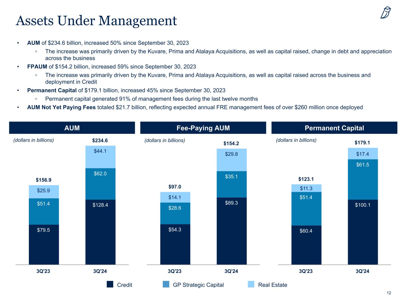 11 Historical Trends (Non-GAAP) • FRE Management Fees of $1,890.6 million for the last twelve months, increased 26% compared to prior year • Fee-Related Earnings of $1,192.4 million for the last twelve months, increased 27% compared to prior year • Distributable Earnings of $1,076.4 million for the last twelve months, increased 22% compared to prior year FRE Management Fees Distributable EarningsFee-Related Earnings (dollars in millions) (dollars in millions) (dollars in millions) $229.5 $301.0 $880.6 $1,076.4 3Q'23 3Q'24 3Q'23 (LTM) 3Q'24 (LTM) $247.8 $326.9 $940.2 $1,192.4 3Q'23 3Q'24 3Q'23 (LTM) 3Q'24 (LTM) $396.7 $534.4 $1,497.9 $1,890.6 3Q'23 3Q'24 3Q'23 (LTM) 3Q'24 (LTM) For information on and reconciliation of the Company's non-GAAP measures, please see slides 25 to 29.