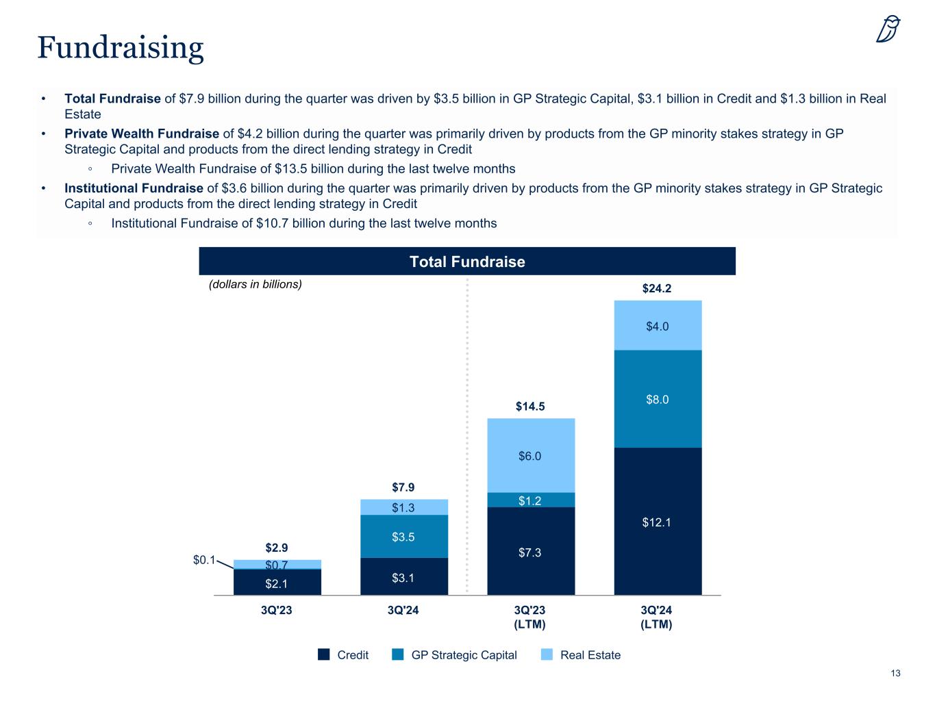 13 Fundraising • Total Fundraise of $7.9 billion during the quarter was driven by $3.5 billion in GP Strategic Capital, $3.1 billion in Credit and $1.3 billion in Real Estate • Private Wealth Fundraise of $4.2 billion during the quarter was primarily driven by products from the GP minority stakes strategy in GP Strategic Capital and products from the direct lending strategy in Credit ◦ Private Wealth Fundraise of $13.5 billion during the last twelve months • Institutional Fundraise of $3.6 billion during the quarter was primarily driven by products from the GP minority stakes strategy in GP Strategic Capital and products from the direct lending strategy in Credit ◦ Institutional Fundraise of $10.7 billion during the last twelve months Total Fundraise (dollars in billions) $2.9 $7.9 $14.5 $24.2 $2.1 $3.1 $7.3 $12.1 $3.5 $1.2 $8.0 $0.7 $1.3 $6.0 $4.0 Credit GP Strategic Capital Real Estate 3Q'23 3Q'24 3Q'23 (LTM) 3Q'24 (LTM) $0.1