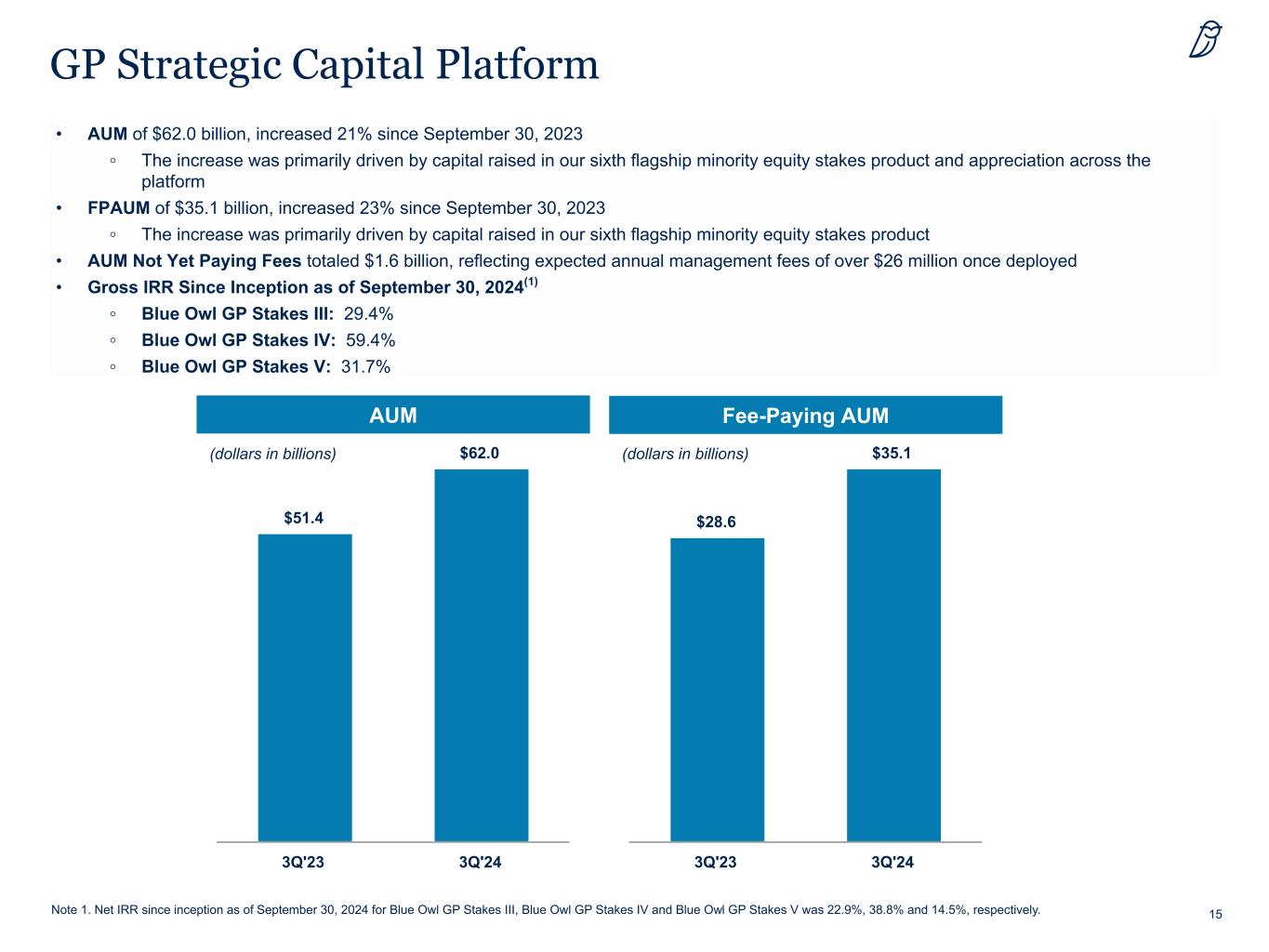 14 Credit Platform • AUM of $128.4 billion, increased 62% since September 30, 2023 ◦ The increase was primarily driven by the Kuvare and Atalaya Acquisitions, as well as capital raised and change in debt in products from the direct lending strategy. • FPAUM of $89.3 billion, increased 64% since September 30, 2023 ◦ The increase was primarily driven by the Kuvare and Atalaya Acquisitions, as well as capital raised in products from the direct lending strategy and deployment across the platform • Direct Originations during the quarter were $10.9 billion with net deployment of $4.3 billion ◦ Direct Originations for the last twelve months were $46.7 billion with net deployment of $17.7 billion • AUM Not Yet Paying Fees totaled $15.3 billion, reflecting expected annual management fees over $193 million once deployed • Direct Lending Gross Returns(1) of 3.3% for 3Q'24 and 15.2% over the last twelve months ended 3Q'24 AUM (dollars in billions) (dollars in billions) Fee-Paying AUM Note 1. Gross and net returns are represented by a composite comprised of Credit products within the direct lending investment strategies reported in the Blue Owl quarterly report on Form 10-Q for the quarter ended June 30, 2024. The composite excludes products that have launched within the last two years as such information is generally not meaningful. The net returns for aforementioned Credit products were 2.4% for 3Q'24 and 11.2% over the last twelve months ended 3Q'24. $79.5 $128.4 3Q'23 3Q'24 $54.3 $89.3 3Q'23 3Q'24