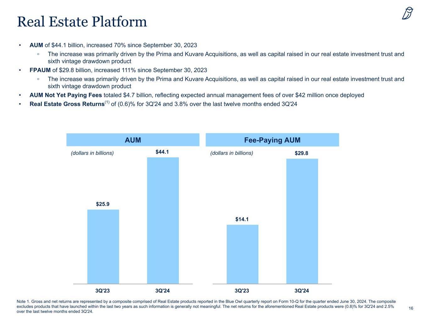 15Note 1. Net IRR since inception as of September 30, 2024 for Blue Owl GP Stakes III, Blue Owl GP Stakes IV and Blue Owl GP Stakes V was 22.9%, 38.8% and 14.5%, respectively. GP Strategic Capital Platform • AUM of $62.0 billion, increased 21% since September 30, 2023 ◦ The increase was primarily driven by capital raised in our sixth flagship minority equity stakes product and appreciation across the platform • FPAUM of $35.1 billion, increased 23% since September 30, 2023 ◦ The increase was primarily driven by capital raised in our sixth flagship minority equity stakes product • AUM Not Yet Paying Fees totaled $1.6 billion, reflecting expected annual management fees of over $26 million once deployed • Gross IRR Since Inception as of September 30, 2024(1) ◦ Blue Owl GP Stakes III: 29.4% ◦ Blue Owl GP Stakes IV: 59.4% ◦ Blue Owl GP Stakes V: 31.7% AUM Fee-Paying AUM $51.4 $62.0 3Q'23 3Q'24 $28.6 $35.1 3Q'23 3Q'24 (dollars in billions)(dollars in billions)