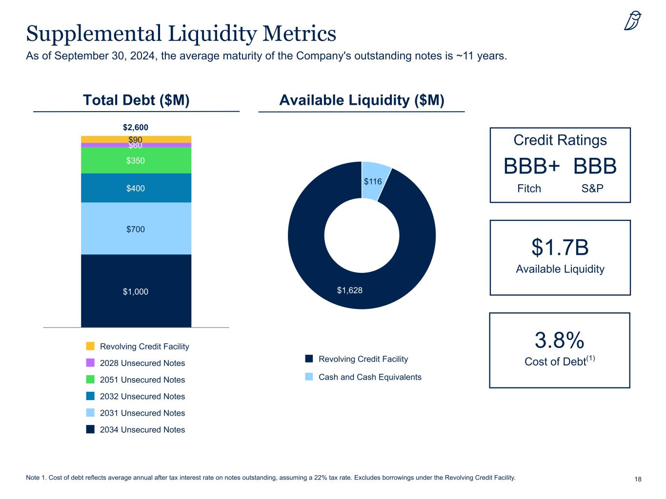 18 As of September 30, 2024, the average maturity of the Company's outstanding notes is ~11 years. Note 1. Cost of debt reflects average annual after tax interest rate on notes outstanding, assuming a 22% tax rate. Excludes borrowings under the Revolving Credit Facility. Supplemental Liquidity Metrics Credit Ratings BBB+ BBB Fitch S&P Total Debt ($M) Available Liquidity ($M) 3.8% Cost of Debt(1) $759 $116 $1,628 Revolving Credit Facility Cash and Cash Equivalents $2,600 $1,000 $700 $400 $350 $60 $90 Revolving Credit Facility 2028 Unsecured Notes 2051 Unsecured Notes 2032 Unsecured Notes 2031 Unsecured Notes 2034 Unsecured Notes $1.7B Available Liquidity