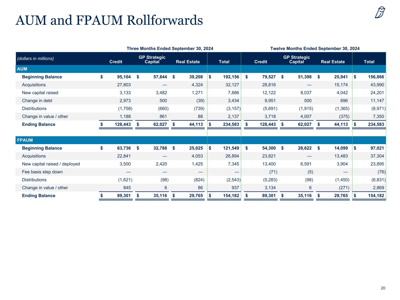 20 AUM and FPAUM Rollforwards Three Months Ended September 30, 2024 Twelve Months Ended September 30, 2024 (dollars in millions) Credit GP Strategic Capital Real Estate Total Credit GP Strategic Capital Real Estate Total AUM Beginning Balance $ 95,104 $ 57,844 $ 39,208 $ 192,156 $ 79,527 $ 51,398 $ 25,941 $ 156,866 Acquisitions 27,803 — 4,324 32,127 28,816 — 15,174 43,990 New capital raised 3,133 3,482 1,271 7,886 12,122 8,037 4,042 24,201 Change in debt 2,973 500 (39) 3,434 9,951 500 696 11,147 Distributions (1,758) (660) (739) (3,157) (5,691) (1,915) (1,365) (8,971) Change in value / other 1,188 861 88 2,137 3,718 4,007 (375) 7,350 Ending Balance $ 128,443 $ 62,027 $ 44,113 $ 234,583 $ 128,443 $ 62,027 $ 44,113 $ 234,583 FPAUM Beginning Balance $ 63,736 $ 32,788 $ 25,025 $ 121,549 $ 54,300 $ 28,622 $ 14,099 $ 97,021 Acquisitions 22,841 — 4,053 26,894 23,821 — 13,483 37,304 New capital raised / deployed 3,500 2,420 1,425 7,345 13,400 6,591 3,904 23,895 Fee basis step down — — — — (71) (5) — (76) Distributions (1,621) (98) (824) (2,543) (5,283) (98) (1,450) (6,831) Change in value / other 845 6 86 937 3,134 6 (271) 2,869 Ending Balance $ 89,301 $ 35,116 $ 29,765 $ 154,182 $ 89,301 $ 35,116 $ 29,765 $ 154,182