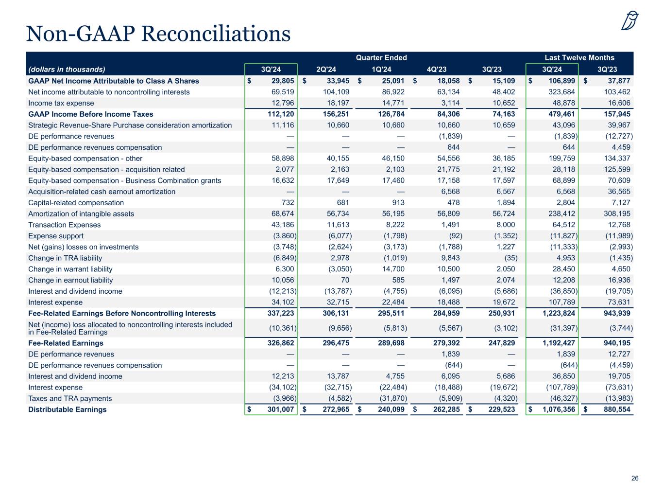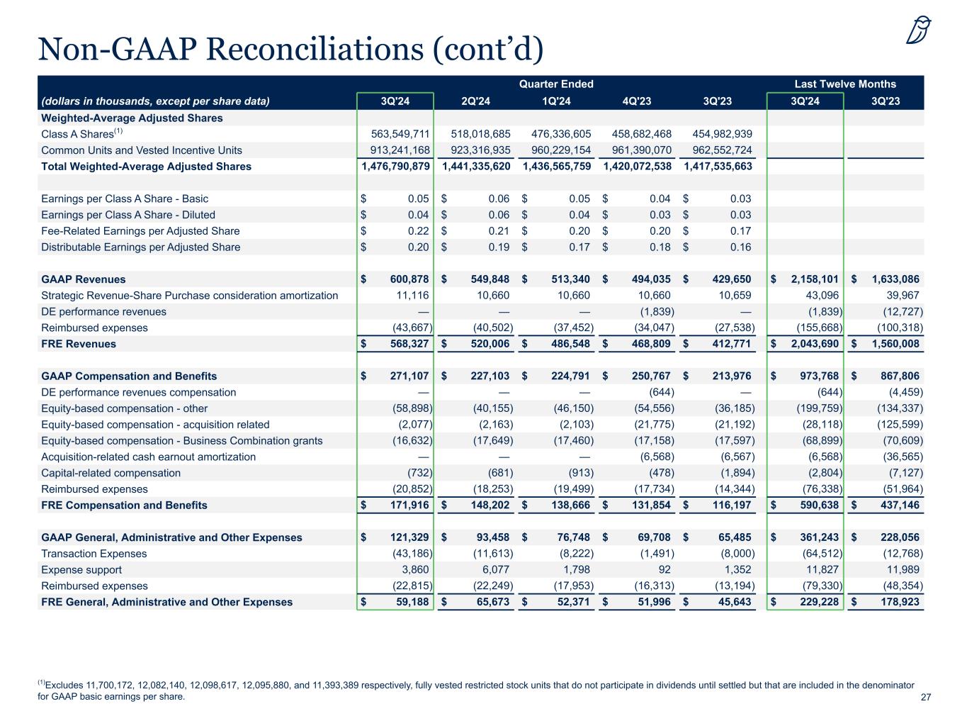 26 Non-GAAP Reconciliations Quarter Ended Last Twelve Months (dollars in thousands) 3Q'24 2Q'24 1Q'24 4Q'23 3Q'23 3Q'24 3Q'23 GAAP Net Income Attributable to Class A Shares $ 29,805 $ 33,945 $ 25,091 $ 18,058 $ 15,109 $ 106,899 $ 37,877 Net income attributable to noncontrolling interests 69,519 104,109 86,922 63,134 48,402 323,684 103,462 Income tax expense 12,796 18,197 14,771 3,114 10,652 48,878 16,606 GAAP Income Before Income Taxes 112,120 156,251 126,784 84,306 74,163 479,461 157,945 Strategic Revenue-Share Purchase consideration amortization 11,116 10,660 10,660 10,660 10,659 43,096 39,967 DE performance revenues — — — (1,839) — (1,839) (12,727) DE performance revenues compensation — — — 644 — 644 4,459 Equity-based compensation - other 58,898 40,155 46,150 54,556 36,185 199,759 134,337 Equity-based compensation - acquisition related 2,077 2,163 2,103 21,775 21,192 28,118 125,599 Equity-based compensation - Business Combination grants 16,632 17,649 17,460 17,158 17,597 68,899 70,609 Acquisition-related cash earnout amortization — — — 6,568 6,567 6,568 36,565 Capital-related compensation 732 681 913 478 1,894 2,804 7,127 Amortization of intangible assets 68,674 56,734 56,195 56,809 56,724 238,412 308,195 Transaction Expenses 43,186 11,613 8,222 1,491 8,000 64,512 12,768 Expense support (3,860) (6,077) (1,798) (92) (1,352) (11,827) (11,989) Net (gains) losses on investments (3,748) (2,624) (3,173) (1,788) 1,227 (11,333) (2,993) Change in TRA liability (6,849) 2,978 (1,019) 9,843 (35) 4,953 (1,435) Change in warrant liability 6,300 (3,050) 14,700 10,500 2,050 28,450 4,650 Change in earnout liability 10,056 70 585 1,497 2,074 12,208 16,936 Interest and dividend income (12,213) (13,787) (4,755) (6,095) (5,686) (36,850) (19,705) Interest expense 34,102 32,715 22,484 18,488 19,672 107,789 73,631 Fee-Related Earnings Before Noncontrolling Interests 337,223 306,131 295,511 284,959 250,931 1,223,824 943,939 Net (income) loss allocated to noncontrolling interests included in Fee-Related Earnings (10,361) (9,656) (5,813) (5,567) (3,102) (31,397) (3,744) Fee-Related Earnings 326,862 296,475 289,698 279,392 247,829 1,192,427 940,195 DE performance revenues — — — 1,839 — 1,839 12,727 DE performance revenues compensation — — — (644) — (644) (4,459) Interest and dividend income 12,213 13,787 4,755 6,095 5,686 36,850 19,705 Interest expense (34,102) (32,715) (22,484) (18,488) (19,672) (107,789) (73,631) Taxes and TRA payments (3,966) (4,582) (31,870) (5,909) (4,320) (46,327) (13,983) Distributable Earnings $ 301,007 $ 272,965 $ 240,099 $ 262,285 $ 229,523 $ 1,076,356 $ 880,554