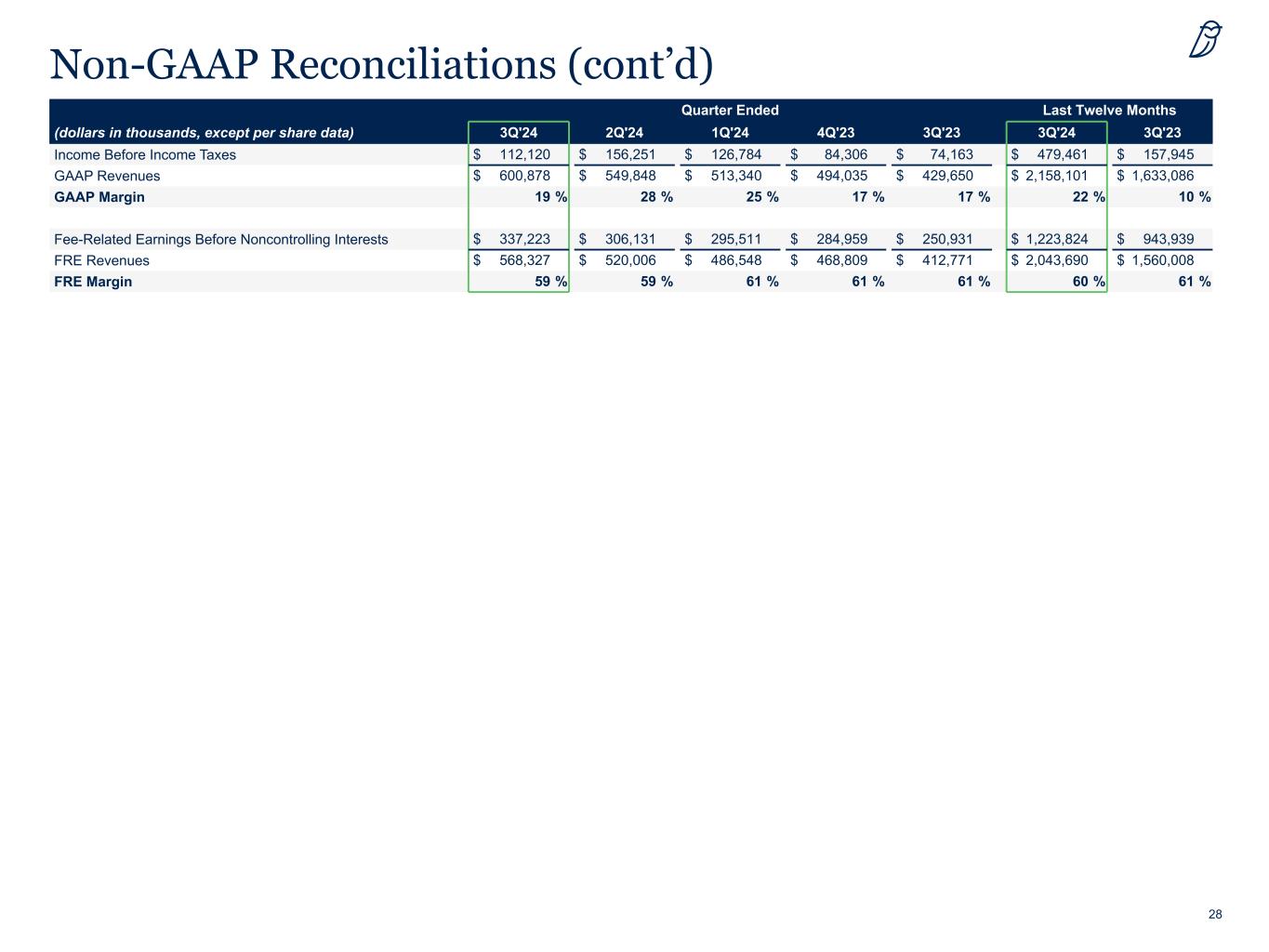 27 Non-GAAP Reconciliations (cont’d) Quarter Ended Last Twelve Months (dollars in thousands, except per share data) 3Q'24 2Q'24 1Q'24 4Q'23 3Q'23 3Q'24 3Q'23 Weighted-Average Adjusted Shares Class A Shares(1) 563,549,711 518,018,685 476,336,605 458,682,468 454,982,939 Common Units and Vested Incentive Units 913,241,168 923,316,935 960,229,154 961,390,070 962,552,724 Total Weighted-Average Adjusted Shares 1,476,790,879 1,441,335,620 1,436,565,759 1,420,072,538 1,417,535,663 Earnings per Class A Share - Basic $ 0.05 $ 0.06 $ 0.05 $ 0.04 $ 0.03 Earnings per Class A Share - Diluted $ 0.04 $ 0.06 $ 0.04 $ 0.03 $ 0.03 Fee-Related Earnings per Adjusted Share $ 0.22 $ 0.21 $ 0.20 $ 0.20 $ 0.17 Distributable Earnings per Adjusted Share $ 0.20 $ 0.19 $ 0.17 $ 0.18 $ 0.16 GAAP Revenues $ 600,878 $ 549,848 $ 513,340 $ 494,035 $ 429,650 $ 2,158,101 $ 1,633,086 Strategic Revenue-Share Purchase consideration amortization 11,116 10,660 10,660 10,660 10,659 43,096 39,967 DE performance revenues — — — (1,839) — (1,839) (12,727) Reimbursed expenses (43,667) (40,502) (37,452) (34,047) (27,538) (155,668) (100,318) FRE Revenues $ 568,327 $ 520,006 $ 486,548 $ 468,809 $ 412,771 $ 2,043,690 $ 1,560,008 GAAP Compensation and Benefits $ 271,107 $ 227,103 $ 224,791 $ 250,767 $ 213,976 $ 973,768 $ 867,806 DE performance revenues compensation — — — (644) — (644) (4,459) Equity-based compensation - other (58,898) (40,155) (46,150) (54,556) (36,185) (199,759) (134,337) Equity-based compensation - acquisition related (2,077) (2,163) (2,103) (21,775) (21,192) (28,118) (125,599) Equity-based compensation - Business Combination grants (16,632) (17,649) (17,460) (17,158) (17,597) (68,899) (70,609) Acquisition-related cash earnout amortization — — — (6,568) (6,567) (6,568) (36,565) Capital-related compensation (732) (681) (913) (478) (1,894) (2,804) (7,127) Reimbursed expenses (20,852) (18,253) (19,499) (17,734) (14,344) (76,338) (51,964) FRE Compensation and Benefits $ 171,916 $ 148,202 $ 138,666 $ 131,854 $ 116,197 $ 590,638 $ 437,146 GAAP General, Administrative and Other Expenses $ 121,329 $ 93,458 $ 76,748 $ 69,708 $ 65,485 $ 361,243 $ 228,056 Transaction Expenses (43,186) (11,613) (8,222) (1,491) (8,000) (64,512) (12,768) Expense support 3,860 6,077 1,798 92 1,352 11,827 11,989 Reimbursed expenses (22,815) (22,249) (17,953) (16,313) (13,194) (79,330) (48,354) FRE General, Administrative and Other Expenses $ 59,188 $ 65,673 $ 52,371 $ 51,996 $ 45,643 $ 229,228 $ 178,923 (1)Excludes 11,700,172, 12,082,140, 12,098,617, 12,095,880, and 11,393,389 respectively, fully vested restricted stock units that do not participate in dividends until settled but that are included in the denominator for GAAP basic earnings per share.