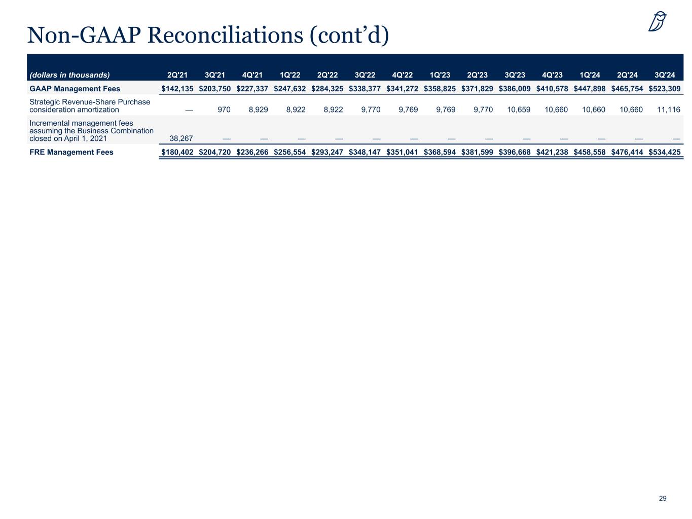 28 Non-GAAP Reconciliations (cont’d) Quarter Ended Last Twelve Months (dollars in thousands, except per share data) 3Q'24 2Q'24 1Q'24 4Q'23 3Q'23 3Q'24 3Q'23 Income Before Income Taxes $ 112,120 $ 156,251 $ 126,784 $ 84,306 $ 74,163 $ 479,461 $ 157,945 GAAP Revenues $ 600,878 $ 549,848 $ 513,340 $ 494,035 $ 429,650 $ 2,158,101 $ 1,633,086 GAAP Margin 19 % 28 % 25 % 17 % 17 % 22 % 10 % Fee-Related Earnings Before Noncontrolling Interests $ 337,223 $ 306,131 $ 295,511 $ 284,959 $ 250,931 $ 1,223,824 $ 943,939 FRE Revenues $ 568,327 $ 520,006 $ 486,548 $ 468,809 $ 412,771 $ 2,043,690 $ 1,560,008 FRE Margin 59 % 59 % 61 % 61 % 61 % 60 % 61 %