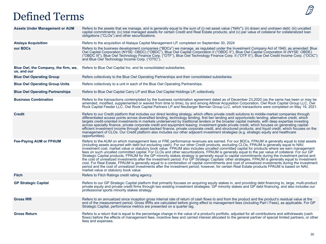 30 Defined Terms Assets Under Management or AUM Refers to the assets that we manage, and is generally equal to the sum of (i) net asset value (“NAV”); (ii) drawn and undrawn debt; (iii) uncalled capital commitments; (iv) total managed assets for certain Credit and Real Estate products; and (v) par value of collateral for collateralized loan obligations (“CLOs”) and other securitizations. Atalaya Acquisition Refers to the acquisition of Atalaya Capital Management LP, completed on September 30, 2024 our BDCs Refers to the business development companies (“BDCs”) we manage, as regulated under the Investment Company Act of 1940, as amended: Blue Owl Capital Corporation (NYSE: OBDC) (“OBDC”), Blue Owl Capital Corporation II (“OBDC II”), Blue Owl Capital Corporation III (NYSE: OBDE) (“OBDC III”), Blue Owl Technology Finance Corp. (“OTF”), Blue Owl Technology Finance Corp. II (“OTF II”), Blue Owl Credit Income Corp. (“OCIC”) and Blue Owl Technology Income Corp. (“OTIC”). Blue Owl, the Company, the firm, we, us, and our Refers to Blue Owl Capital Inc. and its consolidated subsidiaries. Blue Owl Operating Group Refers collectively to the Blue Owl Operating Partnerships and their consolidated subsidiaries. Blue Owl Operating Group Units Refers collectively to a unit in each of the Blue Owl Operating Partnerships. Blue Owl Operating Partnerships Refers to Blue Owl Capital Carry LP and Blue Owl Capital Holdings LP, collectively. Business Combination Refers to the transactions contemplated by the business combination agreement dated as of December 23,2020 (as the same has been or may be amended, modified, supplemented or waived from time to time), by and among Altimar Acquisition Corporation, Owl Rock Capital Group LLC, Owl Rock Capital Feeder LLC, Owl Rock Capital Partners LP and Neuberger Berman Group LLC, which transactions were completed on May 19, 2021. Credit Refers to our Credit platform that includes our direct lending strategy, which offers private credit solutions to middle-market companies through differentiated access points across diversified lending, technology lending, first lien lending and opportunistic lending; alternative credit, which targets credit-oriented investments in markets underserved by traditional lenders or the broader capital markets, with deep expertise investing across specialty finance, private corporate credit and equipment leasing; investment grade private credit, which focuses on generating capital- efficient investment income through asset-backed finance, private corporate credit, and structured products; and liquid credit, which focuses on the management of CLOs. Our Credit platform also includes our other adjacent investment strategies (e.g. strategic equity and healthcare opportunities). Fee-Paying AUM or FPAUM Refers to the AUM on which management fees or FRE performance revenues are earned. For our BDCs, FPAUM is generally equal to total assets (including assets acquired with debt but excluding cash). For our other Credit products, excluding CLOs, FPAUM is generally equal to NAV, investment cost, market value or statutory book value. FPAUM also includes uncalled committed capital for products where we earn management fees on such uncalled committed capital. For CLOs and other securitizations, FPAUM is generally equal to the par value of collateral. For our GP Strategic Capital products, FPAUM for the GP minority stakes strategy is generally equal to capital commitments during the investment period and the cost of unrealized investments after the investment period. For GP Strategic Capitals’ other strategies, FPAUM is generally equal to investment cost. For Real Estate, FPAUM is generally equal to a combination of capital commitments and cost of unrealized investments during the investment period and the cost of unrealized investments after the investment period; however, for certain Real Estate products FPAUM is based on NAV, market value or statutory book value. Fitch Refers to Fitch Ratings credit rating agency. GP Strategic Capital Refers to our GP Strategic Capital platform that primarily focuses on acquiring equity stakes in, and providing debt financing to, large, multi-product private equity and private credit firms through two existing investment strategies: GP minority stakes and GP debt financing, and also includes our professional sports minority stakes strategy. Gross IRR Refers to an annualized since inception gross internal rate of return of cash flows to and from the product and the product’s residual value at the end of the measurement period. Gross IRRs are calculated before giving effect to management fees (including Part I Fees), as applicable. For GP Strategic Capital, performance metrics are presented on a quarter lag. Gross Return Refers to a return that is equal to the percentage change in the value of a product's portfolio, adjusted for all contributions and withdrawals (cash flows) before the effects of management fees, incentive fees and carried interest allocated to the general partner of special limited partners, or other fees and expenses.