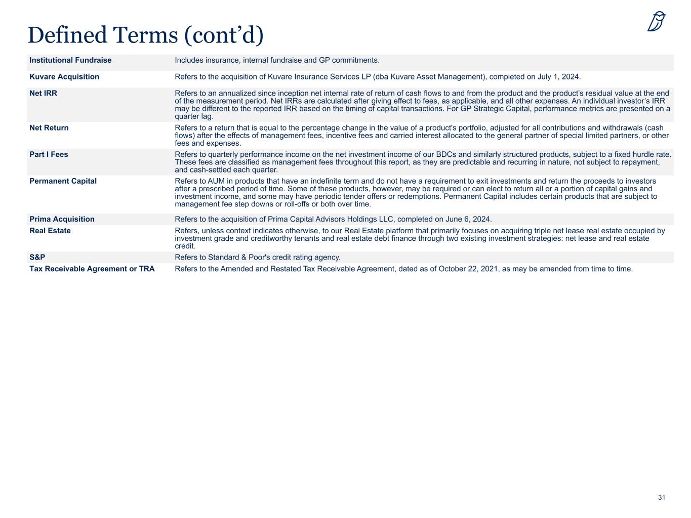 31 Defined Terms (cont’d) Institutional Fundraise Includes insurance, internal fundraise and GP commitments. Kuvare Acquisition Refers to the acquisition of Kuvare Insurance Services LP (dba Kuvare Asset Management), completed on July 1, 2024. Net IRR Refers to an annualized since inception net internal rate of return of cash flows to and from the product and the product’s residual value at the end of the measurement period. Net IRRs are calculated after giving effect to fees, as applicable, and all other expenses. An individual investor’s IRR may be different to the reported IRR based on the timing of capital transactions. For GP Strategic Capital, performance metrics are presented on a quarter lag. Net Return Refers to a return that is equal to the percentage change in the value of a product's portfolio, adjusted for all contributions and withdrawals (cash flows) after the effects of management fees, incentive fees and carried interest allocated to the general partner of special limited partners, or other fees and expenses. Part I Fees Refers to quarterly performance income on the net investment income of our BDCs and similarly structured products, subject to a fixed hurdle rate. These fees are classified as management fees throughout this report, as they are predictable and recurring in nature, not subject to repayment, and cash-settled each quarter. Permanent Capital Refers to AUM in products that have an indefinite term and do not have a requirement to exit investments and return the proceeds to investors after a prescribed period of time. Some of these products, however, may be required or can elect to return all or a portion of capital gains and investment income, and some may have periodic tender offers or redemptions. Permanent Capital includes certain products that are subject to management fee step downs or roll-offs or both over time. Prima Acquisition Refers to the acquisition of Prima Capital Advisors Holdings LLC, completed on June 6, 2024. Real Estate Refers, unless context indicates otherwise, to our Real Estate platform that primarily focuses on acquiring triple net lease real estate occupied by investment grade and creditworthy tenants and real estate debt finance through two existing investment strategies: net lease and real estate credit. S&P Refers to Standard & Poor's credit rating agency. Tax Receivable Agreement or TRA Refers to the Amended and Restated Tax Receivable Agreement, dated as of October 22, 2021, as may be amended from time to time.