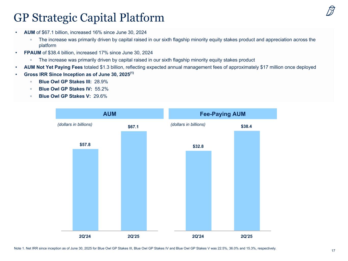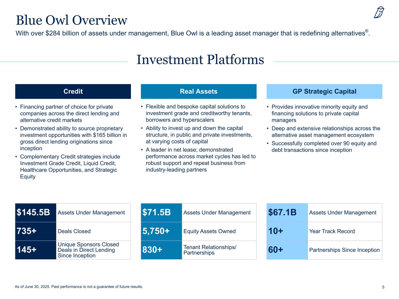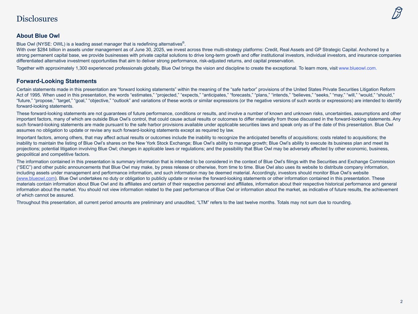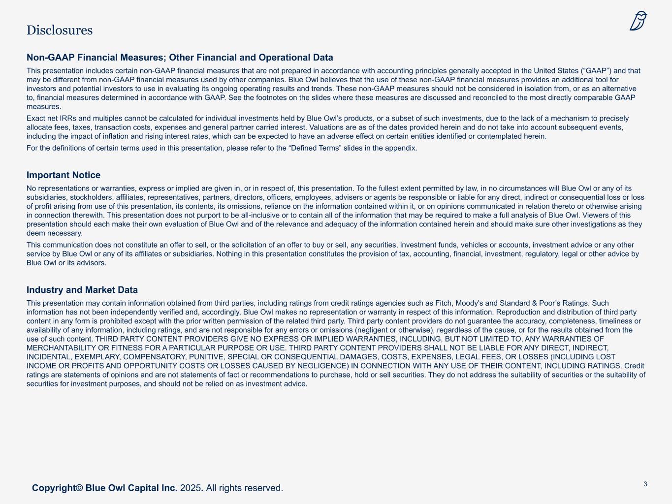 2 About Blue Owl Blue Owl (NYSE: OWL) is a leading asset manager that is redefining alternatives®. With over $284 billion in assets under management as of June 30, 2025, we invest across three multi-strategy platforms: Credit, Real Assets and GP Strategic Capital. Anchored by a strong permanent capital base, we provide businesses with private capital solutions to drive long-term growth and offer institutional investors, individual investors, and insurance companies differentiated alternative investment opportunities that aim to deliver strong performance, risk-adjusted returns, and capital preservation. Together with approximately 1,300 experienced professionals globally, Blue Owl brings the vision and discipline to create the exceptional. To learn more, visit www.blueowl.com. Forward-Looking Statements Certain statements made in this presentation are “forward looking statements” within the meaning of the “safe harbor” provisions of the United States Private Securities Litigation Reform Act of 1995. When used in this presentation, the words “estimates,” “projected,” “expects,” “anticipates,” “forecasts,” “plans,” “intends,” “believes,” “seeks,” “may,” “will,” “would,” “should,” “future,” “propose,” “target,” “goal,” “objective,” “outlook” and variations of these words or similar expressions (or the negative versions of such words or expressions) are intended to identify forward-looking statements. These forward-looking statements are not guarantees of future performance, conditions or results, and involve a number of known and unknown risks, uncertainties, assumptions and other important factors, many of which are outside Blue Owl’s control, that could cause actual results or outcomes to differ materially from those discussed in the forward-looking statements. Any such forward-looking statements are made pursuant to the safe harbor provisions available under applicable securities laws and speak only as of the date of this presentation. Blue Owl assumes no obligation to update or revise any such forward-looking statements except as required by law. Important factors, among others, that may affect actual results or outcomes include the inability to recognize the anticipated benefits of acquisitions; costs related to acquisitions; the inability to maintain the listing of Blue Owl’s shares on the New York Stock Exchange; Blue Owl’s ability to manage growth; Blue Owl’s ability to execute its business plan and meet its projections; potential litigation involving Blue Owl; changes in applicable laws or regulations; and the possibility that Blue Owl may be adversely affected by other economic, business, geopolitical and competitive factors. The information contained in this presentation is summary information that is intended to be considered in the context of Blue Owl’s filings with the Securities and Exchange Commission (“SEC”) and other public announcements that Blue Owl may make, by press release or otherwise, from time to time. Blue Owl also uses its website to distribute company information, including assets under management and performance information, and such information may be deemed material. Accordingly, investors should monitor Blue Owl’s website (www.blueowl.com). Blue Owl undertakes no duty or obligation to publicly update or revise the forward-looking statements or other information contained in this presentation. These materials contain information about Blue Owl and its affiliates and certain of their respective personnel and affiliates, information about their respective historical performance and general information about the market. You should not view information related to the past performance of Blue Owl or information about the market, as indicative of future results, the achievement of which cannot be assured. Throughout this presentation, all current period amounts are preliminary and unaudited, “LTM” refers to the last twelve months. Totals may not sum due to rounding. Disclosures