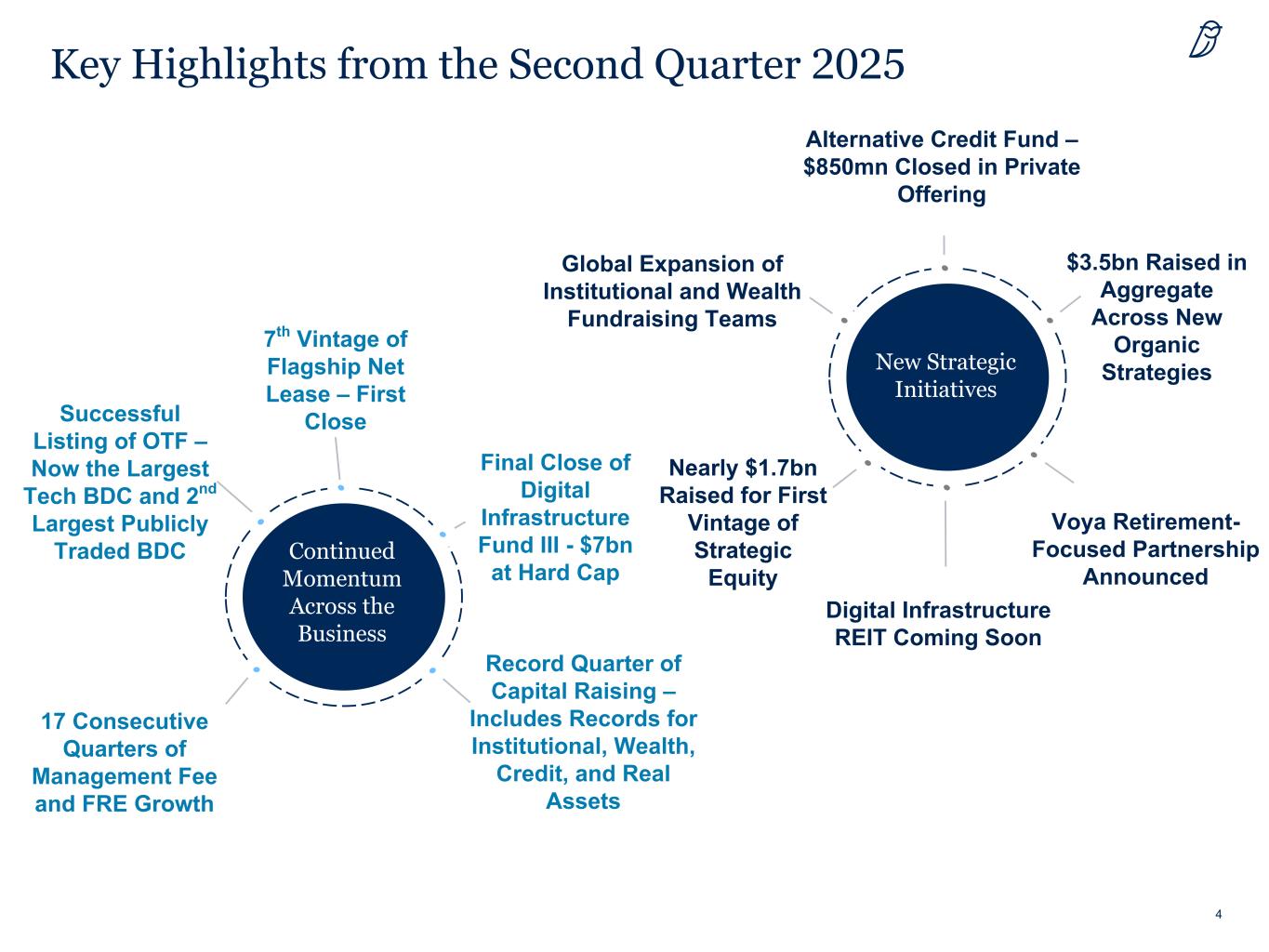 3 Disclosures Non-GAAP Financial Measures; Other Financial and Operational Data This presentation includes certain non-GAAP financial measures that are not prepared in accordance with accounting principles generally accepted in the United States (“GAAP”) and that may be different from non-GAAP financial measures used by other companies. Blue Owl believes that the use of these non-GAAP financial measures provides an additional tool for investors and potential investors to use in evaluating its ongoing operating results and trends. These non-GAAP measures should not be considered in isolation from, or as an alternative to, financial measures determined in accordance with GAAP. See the footnotes on the slides where these measures are discussed and reconciled to the most directly comparable GAAP measures. Exact net IRRs and multiples cannot be calculated for individual investments held by Blue Owl’s products, or a subset of such investments, due to the lack of a mechanism to precisely allocate fees, taxes, transaction costs, expenses and general partner carried interest. Valuations are as of the dates provided herein and do not take into account subsequent events, including the impact of inflation and rising interest rates, which can be expected to have an adverse effect on certain entities identified or contemplated herein. For the definitions of certain terms used in this presentation, please refer to the “Defined Terms” slides in the appendix. Important Notice No representations or warranties, express or implied are given in, or in respect of, this presentation. To the fullest extent permitted by law, in no circumstances will Blue Owl or any of its subsidiaries, stockholders, affiliates, representatives, partners, directors, officers, employees, advisers or agents be responsible or liable for any direct, indirect or consequential loss or loss of profit arising from use of this presentation, its contents, its omissions, reliance on the information contained within it, or on opinions communicated in relation thereto or otherwise arising in connection therewith. This presentation does not purport to be all-inclusive or to contain all of the information that may be required to make a full analysis of Blue Owl. Viewers of this presentation should each make their own evaluation of Blue Owl and of the relevance and adequacy of the information contained herein and should make sure other investigations as they deem necessary. This communication does not constitute an offer to sell, or the solicitation of an offer to buy or sell, any securities, investment funds, vehicles or accounts, investment advice or any other service by Blue Owl or any of its affiliates or subsidiaries. Nothing in this presentation constitutes the provision of tax, accounting, financial, investment, regulatory, legal or other advice by Blue Owl or its advisors. Industry and Market Data This presentation may contain information obtained from third parties, including ratings from credit ratings agencies such as Fitch, Moody's and Standard & Poor’s Ratings. Such information has not been independently verified and, accordingly, Blue Owl makes no representation or warranty in respect of this information. Reproduction and distribution of third party content in any form is prohibited except with the prior written permission of the related third party. Third party content providers do not guarantee the accuracy, completeness, timeliness or availability of any information, including ratings, and are not responsible for any errors or omissions (negligent or otherwise), regardless of the cause, or for the results obtained from the use of such content. THIRD PARTY CONTENT PROVIDERS GIVE NO EXPRESS OR IMPLIED WARRANTIES, INCLUDING, BUT NOT LIMITED TO, ANY WARRANTIES OF MERCHANTABILITY OR FITNESS FOR A PARTICULAR PURPOSE OR USE. THIRD PARTY CONTENT PROVIDERS SHALL NOT BE LIABLE FOR ANY DIRECT, INDIRECT, INCIDENTAL, EXEMPLARY, COMPENSATORY, PUNITIVE, SPECIAL OR CONSEQUENTIAL DAMAGES, COSTS, EXPENSES, LEGAL FEES, OR LOSSES (INCLUDING LOST INCOME OR PROFITS AND OPPORTUNITY COSTS OR LOSSES CAUSED BY NEGLIGENCE) IN CONNECTION WITH ANY USE OF THEIR CONTENT, INCLUDING RATINGS. Credit ratings are statements of opinions and are not statements of fact or recommendations to purchase, hold or sell securities. They do not address the suitability of securities or the suitability of securities for investment purposes, and should not be relied on as investment advice. Copyright© Blue Owl Capital Inc. 2025. All rights reserved.