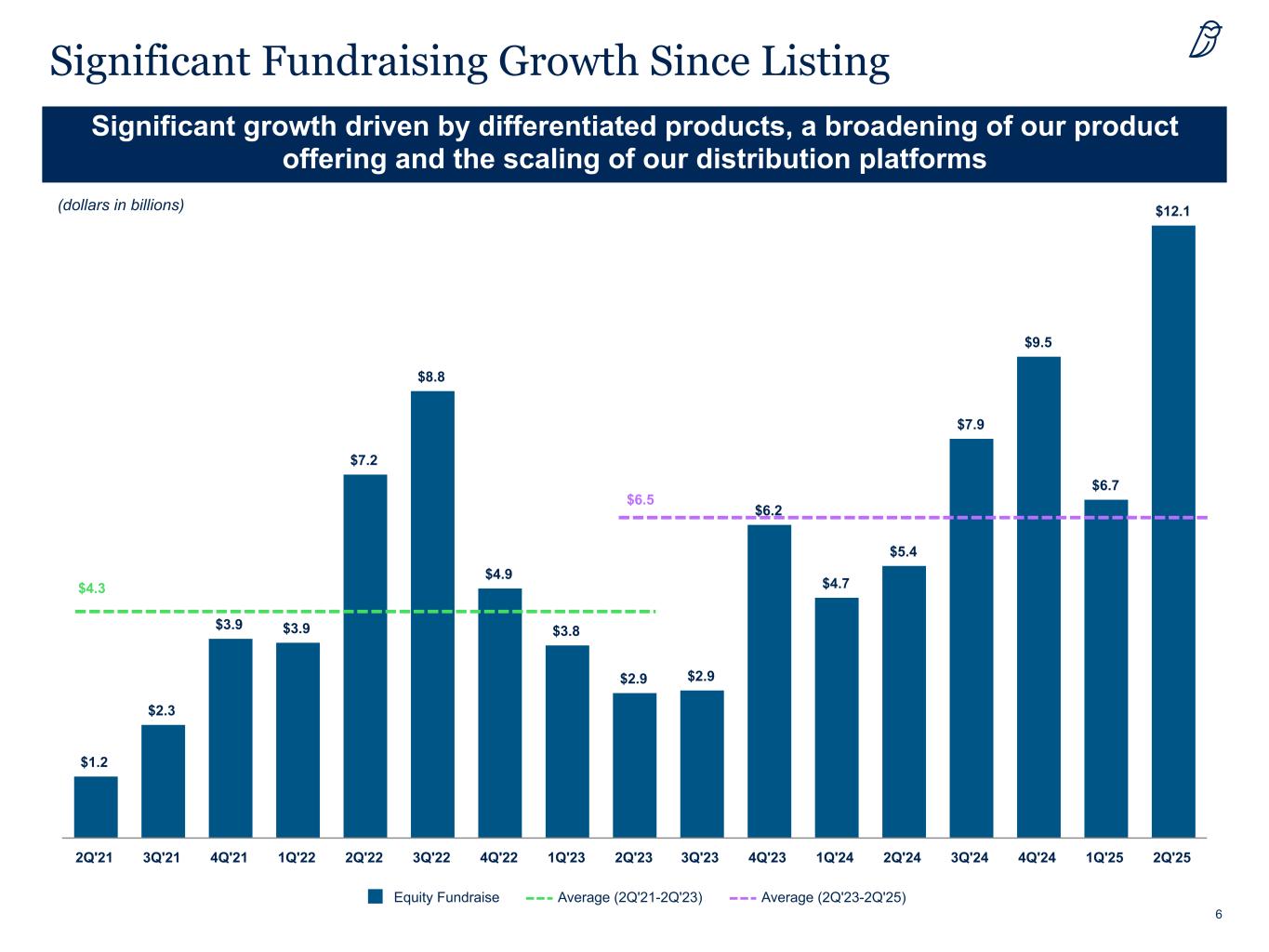 6 Significant growth driven by differentiated products, a broadening of our product offering and the scaling of our distribution platforms Significant Fundraising Growth Since Listing $1.2 $2.3 $3.9 $3.9 $7.2 $8.8 $4.9 $3.8 $2.9 $2.9 $6.2 $4.7 $5.4 $7.9 $9.5 $6.7 $12.1 Equity Fundraise Average (2Q'21-2Q'23) Average (2Q'23-2Q'25) 2Q'21 3Q'21 4Q'21 1Q'22 2Q'22 3Q'22 4Q'22 1Q'23 2Q'23 3Q'23 4Q'23 1Q'24 2Q'24 3Q'24 4Q'24 1Q'25 2Q'25 (dollars in billions) $4.3 $6.5