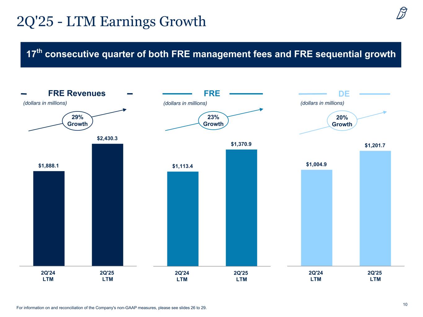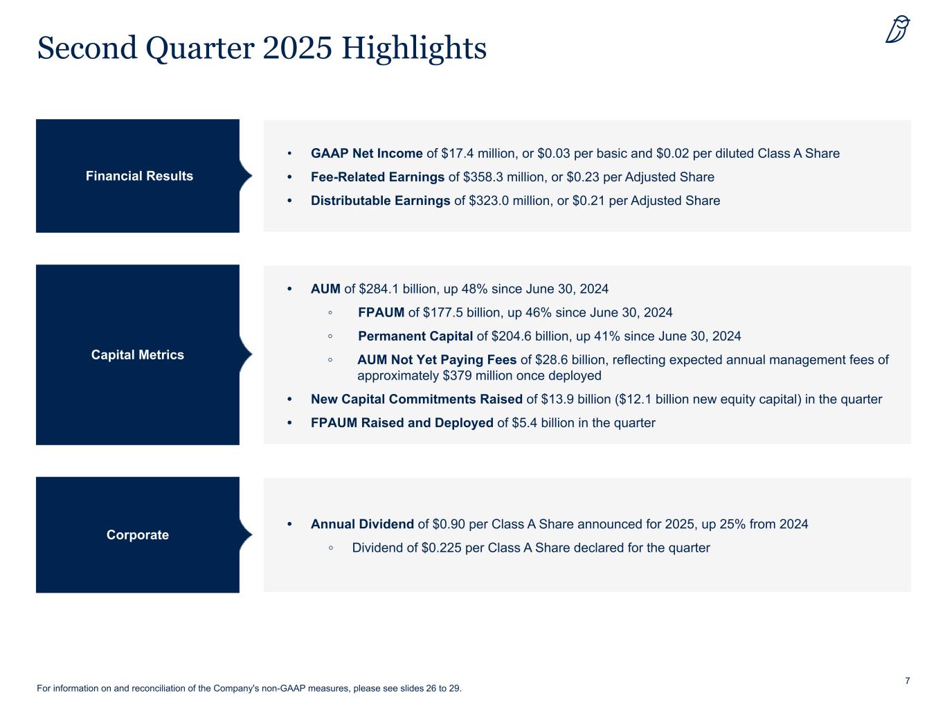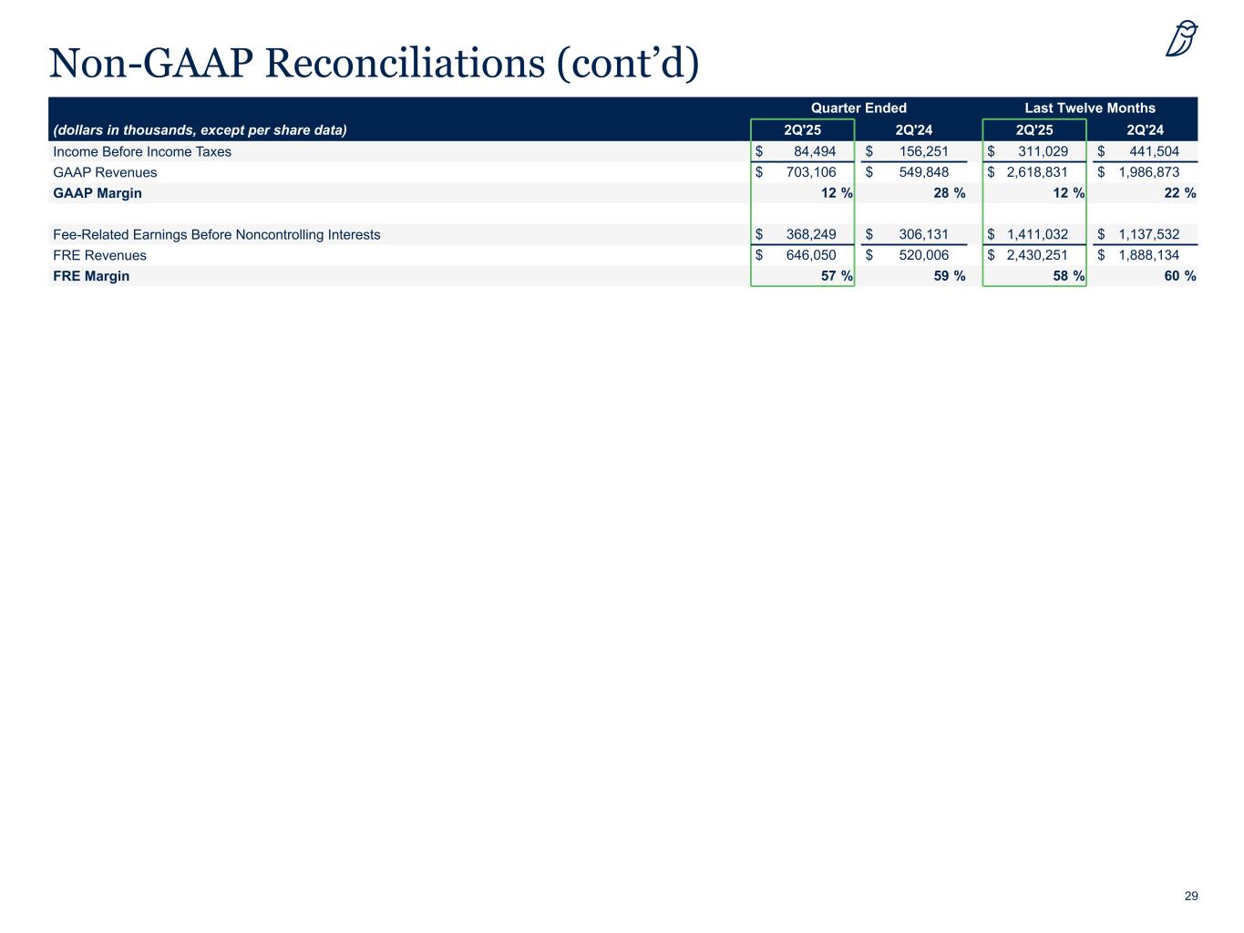 28 Non-GAAP Reconciliations (cont’d) Quarter Ended Last Twelve Months (dollars in thousands, except per share data) 2Q'25 1Q'25 4Q'24 3Q'24 2Q'24 2Q'25 2Q'24 Weighted-Average Adjusted Shares Class A Shares(1) 637,712,824 614,422,518 590,446,378 563,549,711 518,018,685 Common Units and Vested Incentive Units 918,707,507 933,259,441 914,037,132 913,241,168 923,316,935 Total Weighted-Average Adjusted Shares 1,556,420,331 1,547,681,959 1,504,483,510 1,476,790,879 1,441,335,620 Earnings per Class A Share - Basic $ 0.03 $ 0.01 $ 0.03 $ 0.05 $ 0.06 Earnings per Class A Share - Diluted $ 0.02 $ 0.00 $ 0.03 $ 0.04 $ 0.06 Fee-Related Earnings per Adjusted Share $ 0.23 $ 0.22 $ 0.23 $ 0.22 $ 0.21 Distributable Earnings per Adjusted Share $ 0.21 $ 0.17 $ 0.21 $ 0.20 $ 0.19 GAAP Revenues $ 703,106 $ 683,486 $ 631,361 $ 600,878 $ 549,848 $ 2,618,831 $ 1,986,873 Strategic Revenue-Share Purchase consideration amortization 11,117 11,116 11,117 11,116 10,660 44,466 42,639 DE performance revenues (860) (2,257) (409) — — (3,526) (1,839) IPI Acquisition-related catch-up fees payable to sellers (14,334) (19,319) — — — (33,653) — Reimbursed expenses (52,979) (52,834) (46,387) (43,667) (40,502) (195,867) (139,539) FRE Revenues $ 646,050 $ 620,192 $ 595,682 $ 568,327 $ 520,006 $ 2,430,251 $ 1,888,134 GAAP Compensation and Benefits $ 326,300 $ 325,940 $ 294,482 $ 271,107 $ 227,103 $ 1,217,829 $ 916,637 DE performance revenues compensation (732) (1,918) (143) — — (2,793) (644) Equity-based compensation - other (75,166) (75,192) (70,261) (58,898) (40,155) (279,517) (177,046) Equity-based compensation - acquisition-related (19,914) (21,501) (21,629) (2,077) (2,163) (65,121) (47,233) Equity-based compensation - Business Combination grants (17,051) (11,485) (17,432) (16,632) (17,649) (62,600) (69,864) Acquisition-related cash amortization (979) (2,629) — — — (3,608) (13,135) Capital-related compensation (915) (1,201) (1,532) (732) (681) (4,380) (3,966) Reimbursed expenses (22,601) (24,092) (21,392) (20,852) (18,253) (88,937) (69,830) FRE Compensation and Benefits $ 188,942 $ 187,922 $ 162,093 $ 171,916 $ 148,202 $ 710,873 $ 534,919 GAAP General, Administrative and Other Expenses $ 188,052 $ 190,779 $ 121,396 $ 121,329 $ 93,458 $ 621,556 $ 305,399 Equity-based compensation - acquisition-related (56,923) (61,498) — — — (118,421) — Transaction Expenses (9,343) (25,186) (11,455) (43,186) (11,613) (89,170) (29,326) Expense support (2,549) 1,930 (1,930) 3,860 6,077 1,311 9,319 Reimbursed expenses (30,378) (28,742) (24,995) (22,815) (22,249) (106,930) (69,709) FRE General, Administrative and Other Expenses $ 88,859 $ 77,283 $ 83,016 $ 59,188 $ 65,673 $ 308,346 $ 215,683 Note 1. Excludes 11,972,391, 11,431,589, 10,924,696, 11,700,172 and 12,082,140 respectively, fully vested restricted stock units that do not participate in dividends until settled but that are included in the denominator for GAAP basic earnings per share.