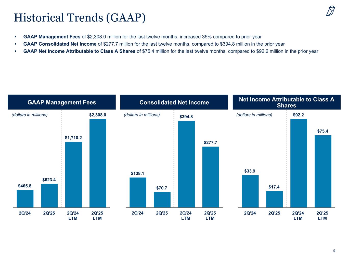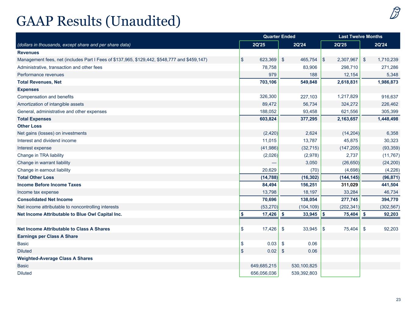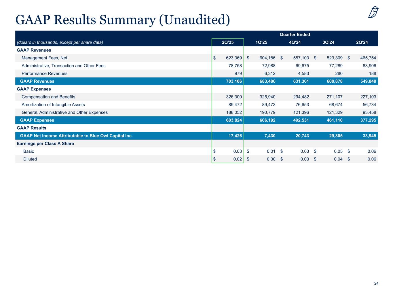 24 Quarter Ended (dollars in thousands, except per share data) 2Q'25 1Q'25 4Q'24 3Q'24 2Q'24 GAAP Revenues Management Fees, Net $ 623,369 $ 604,186 $ 557,103 $ 523,309 $ 465,754 Administrative, Transaction and Other Fees 78,758 72,988 69,675 77,289 83,906 Performance Revenues 979 6,312 4,583 280 188 GAAP Revenues 703,106 683,486 631,361 600,878 549,848 GAAP Expenses Compensation and Benefits 326,300 325,940 294,482 271,107 227,103 Amortization of Intangible Assets 89,472 89,473 76,653 68,674 56,734 General, Administrative and Other Expenses 188,052 190,779 121,396 121,329 93,458 GAAP Expenses 603,824 606,192 492,531 461,110 377,295 GAAP Results GAAP Net Income Attributable to Blue Owl Capital Inc. 17,426 7,430 20,743 29,805 33,945 Earnings per Class A Share Basic $ 0.03 $ 0.01 $ 0.03 $ 0.05 $ 0.06 Diluted $ 0.02 $ 0.00 $ 0.03 $ 0.04 $ 0.06 GAAP Results Summary (Unaudited)