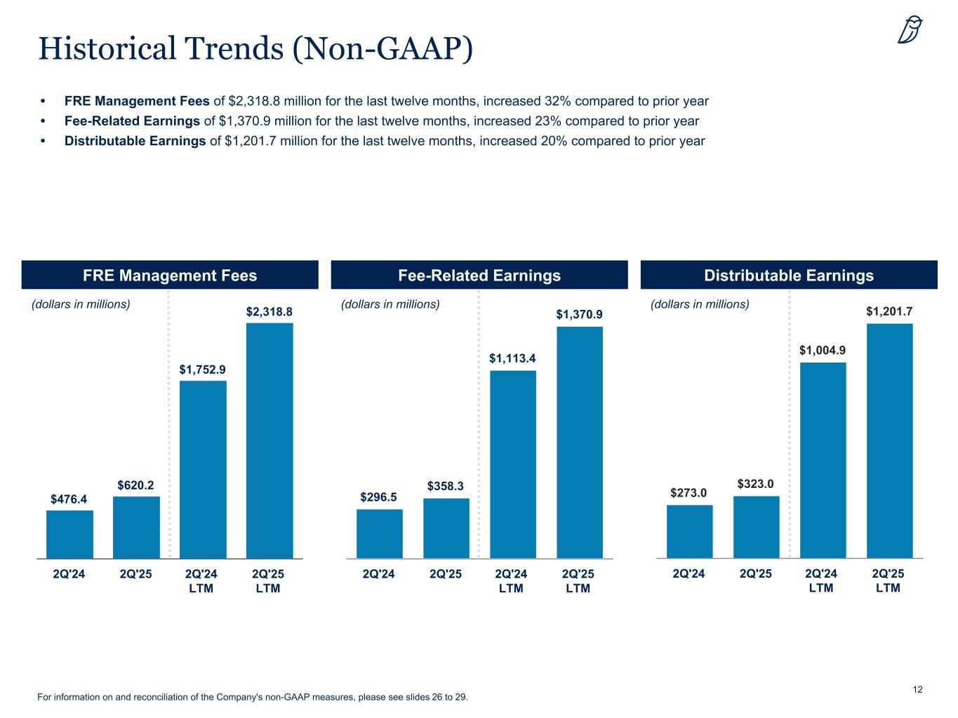 11 Non-GAAP Results (Unaudited) Quarter Ended Last Twelve Months (dollars in thousands, except per share data) 2Q'25 2Q'24 % Change 2Q'25 2Q'24 % Change FRE Revenues Credit (including Part I Fees of $135,459, $127,135, $541,519 and $451,045) $ 368,016 $ 288,310 28% $ 1,397,873 $ 1,034,283 35% Real Assets 91,093 42,209 116% 285,430 149,509 91% GP Strategic Capital (including Part I Fees of $2,506, $2,307, $7,258 and $8,102) 161,043 145,895 10% 635,477 569,086 12% FRE Management Fees, Net 620,152 476,414 30% 2,318,780 1,752,878 32% FRE Administrative, Transaction and Other Fees 25,779 43,404 (41%) 102,843 131,747 (22%) FRE Performance Revenues 119 188 (37%) 8,628 3,509 146% FRE Revenues 646,050 520,006 24% 2,430,251 1,888,134 29% FRE Expenses FRE Compensation and Benefits 188,942 148,202 27% 710,873 534,919 33% FRE General, Administrative and Other Expenses 88,859 65,673 35% 308,346 215,683 43% FRE Expenses 277,801 213,875 30% 1,019,219 750,602 36% Fee-Related Earnings 358,343 296,475 21% 1,370,927 1,113,394 23% Distributable Earnings 323,014 272,965 18% 1,201,714 1,004,872 20% Adjusted Per Share Information Fee-Related Earnings per Adjusted Share $ 0.23 $ 0.21 Distributable Earnings per Adjusted Share $ 0.21 $ 0.19 Supplemental Information Credit $ 391,077 $ 330,201 18% $ 1,493,637 $ 1,161,433 29% Real Assets 91,720 42,278 117% 293,015 151,630 93% GP Strategic Capital 163,253 147,527 11% 643,599 575,071 12% FRE Revenues 646,050 520,006 24% 2,430,251 1,888,134 29% FRE Margin 57% 59% 58% 60% FRE Management Fees as % from Permanent Capital 85% 91% 87% 92% For information on and reconciliation of the Company's non-GAAP measures, please see slides 26 to 29.