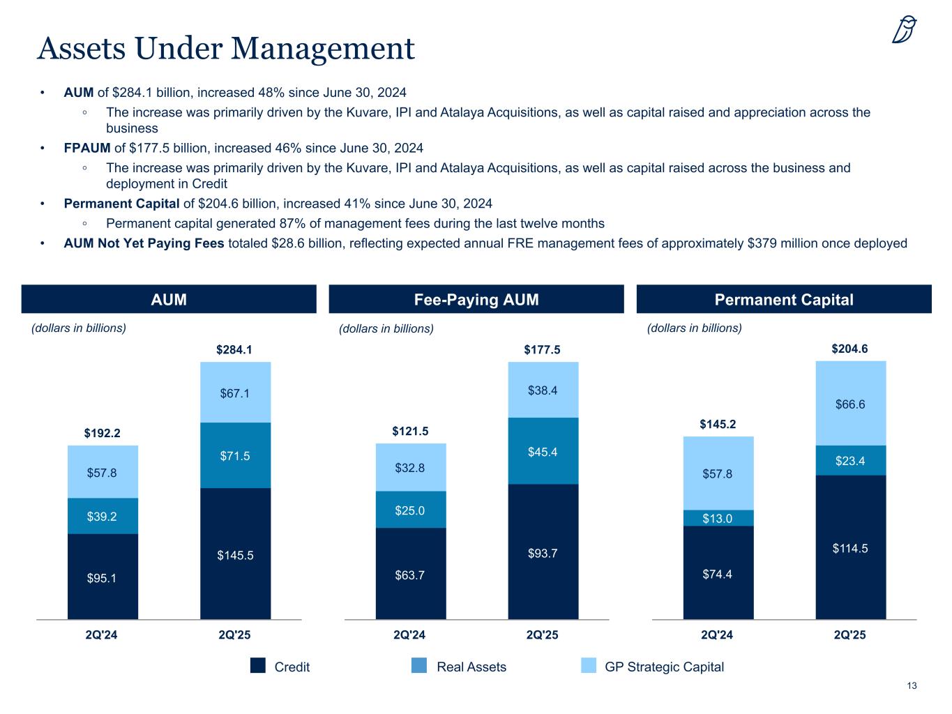 12 Historical Trends (Non-GAAP) • FRE Management Fees of $2,318.8 million for the last twelve months, increased 32% compared to prior year • Fee-Related Earnings of $1,370.9 million for the last twelve months, increased 23% compared to prior year • Distributable Earnings of $1,201.7 million for the last twelve months, increased 20% compared to prior year FRE Management Fees Distributable EarningsFee-Related Earnings (dollars in millions) (dollars in millions) (dollars in millions) $273.0 $323.0 $1,004.9 $1,201.7 2Q'24 2Q'25 2Q'24 LTM 2Q'25 LTM $296.5 $358.3 $1,113.4 $1,370.9 2Q'24 2Q'25 2Q'24 LTM 2Q'25 LTM $476.4 $620.2 $1,752.9 $2,318.8 2Q'24 2Q'25 2Q'24 LTM 2Q'25 LTM For information on and reconciliation of the Company's non-GAAP measures, please see slides 26 to 29.