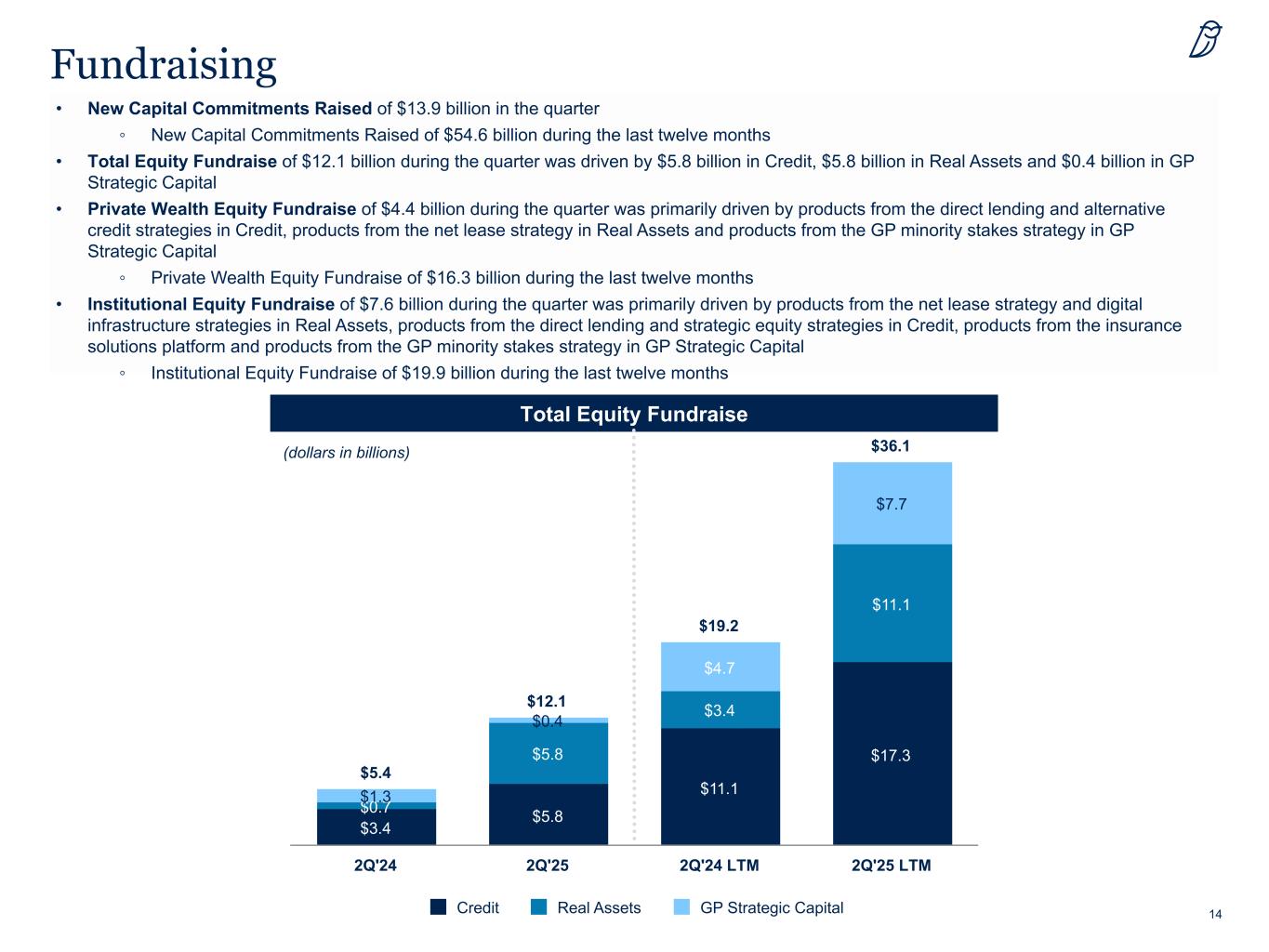 13 Assets Under Management • AUM of $284.1 billion, increased 48% since June 30, 2024 ◦ The increase was primarily driven by the Kuvare, IPI and Atalaya Acquisitions, as well as capital raised and appreciation across the business • FPAUM of $177.5 billion, increased 46% since June 30, 2024 ◦ The increase was primarily driven by the Kuvare, IPI and Atalaya Acquisitions, as well as capital raised across the business and deployment in Credit • Permanent Capital of $204.6 billion, increased 41% since June 30, 2024 ◦ Permanent capital generated 87% of management fees during the last twelve months • AUM Not Yet Paying Fees totaled $28.6 billion, reflecting expected annual FRE management fees of approximately $379 million once deployed AUM Fee-Paying AUM Permanent Capital Credit GP Strategic CapitalReal Assets (dollars in billions) (dollars in billions) (dollars in billions) $192.2 $284.1 $95.1 $145.5 $39.2 $71.5 $57.8 $67.1 2Q'24 2Q'25 $121.5 $177.5 $63.7 $93.7 $25.0 $45.4 $32.8 $38.4 2Q'24 2Q'25 $145.2 $204.6 $74.4 $114.5 $13.0 $23.4 $57.8 $66.6 2Q'24 2Q'25