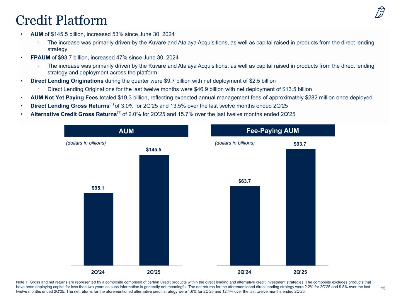 14 Fundraising • New Capital Commitments Raised of $13.9 billion in the quarter ◦ New Capital Commitments Raised of $54.6 billion during the last twelve months • Total Equity Fundraise of $12.1 billion during the quarter was driven by $5.8 billion in Credit, $5.8 billion in Real Assets and $0.4 billion in GP Strategic Capital • Private Wealth Equity Fundraise of $4.4 billion during the quarter was primarily driven by products from the direct lending and alternative credit strategies in Credit, products from the net lease strategy in Real Assets and products from the GP minority stakes strategy in GP Strategic Capital ◦ Private Wealth Equity Fundraise of $16.3 billion during the last twelve months • Institutional Equity Fundraise of $7.6 billion during the quarter was primarily driven by products from the net lease strategy and digital infrastructure strategies in Real Assets, products from the direct lending and strategic equity strategies in Credit, products from the insurance solutions platform and products from the GP minority stakes strategy in GP Strategic Capital ◦ Institutional Equity Fundraise of $19.9 billion during the last twelve months Total Equity Fundraise (dollars in billions) $5.4 $12.1 $19.2 $36.1 $3.4 $5.8 $11.1 $17.3 $0.7 $5.8 $3.4 $11.1 $1.3 $0.4 $4.7 $7.7 Credit Real Assets GP Strategic Capital 2Q'24 2Q'25 2Q'24 LTM 2Q'25 LTM