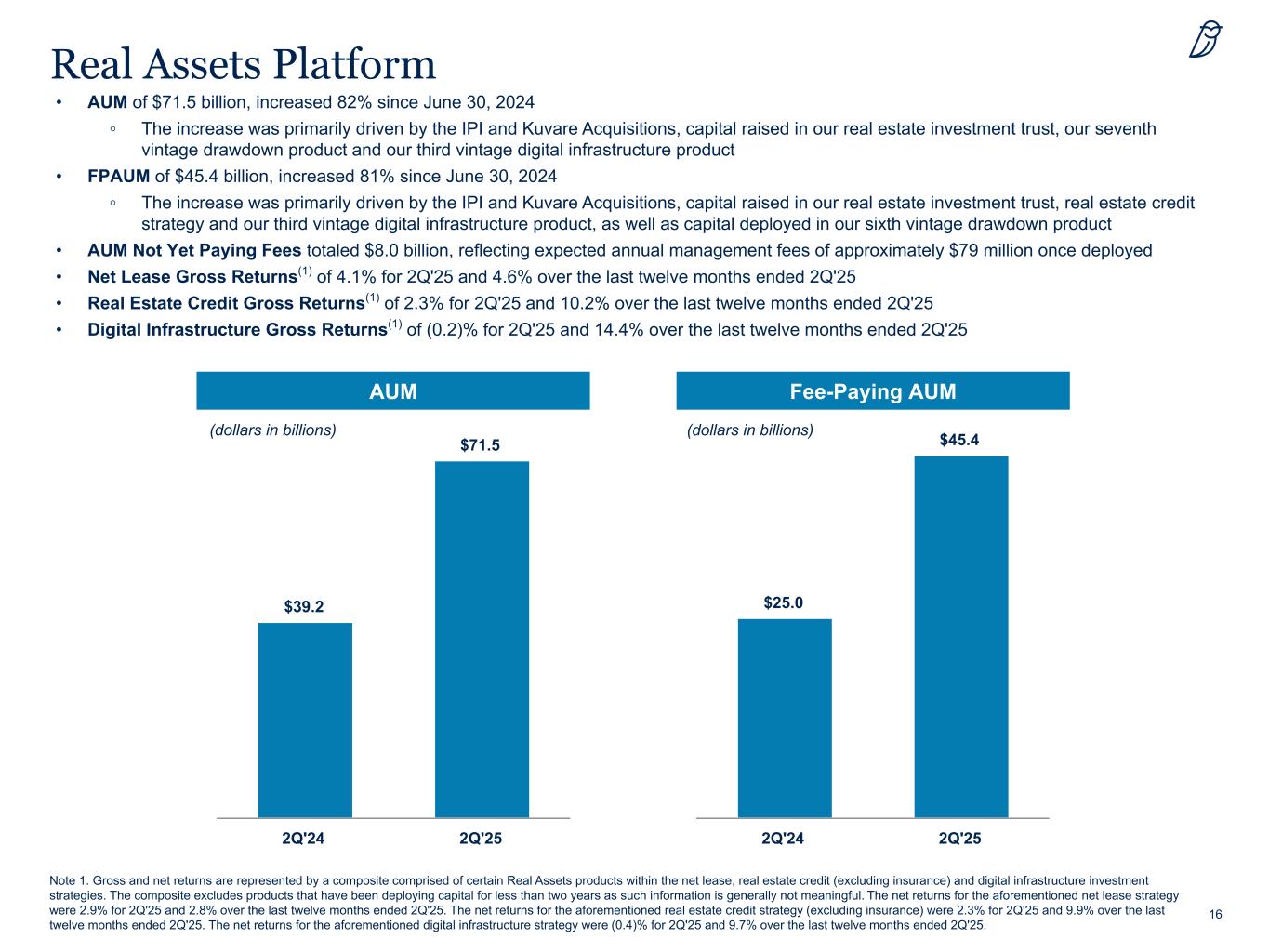 15 Credit Platform • AUM of $145.5 billion, increased 53% since June 30, 2024 ◦ The increase was primarily driven by the Kuvare and Atalaya Acquisitions, as well as capital raised in products from the direct lending strategy • FPAUM of $93.7 billion, increased 47% since June 30, 2024 ◦ The increase was primarily driven by the Kuvare and Atalaya Acquisitions, as well as capital raised in products from the direct lending strategy and deployment across the platform • Direct Lending Originations during the quarter were $9.7 billion with net deployment of $2.5 billion ◦ Direct Lending Originations for the last twelve months were $46.9 billion with net deployment of $13.5 billion • AUM Not Yet Paying Fees totaled $19.3 billion, reflecting expected annual management fees of approximately $282 million once deployed • Direct Lending Gross Returns(1) of 3.0% for 2Q'25 and 13.5% over the last twelve months ended 2Q'25 • Alternative Credit Gross Returns(1) of 2.0% for 2Q'25 and 15.7% over the last twelve months ended 2Q'25 AUM (dollars in billions) (dollars in billions) Fee-Paying AUM Note 1. Gross and net returns are represented by a composite comprised of certain Credit products within the direct lending and alternative credit investment strategies. The composite excludes products that have been deploying capital for less than two years as such information is generally not meaningful. The net returns for the aforementioned direct lending strategy were 2.2% for 2Q'25 and 9.8% over the last twelve months ended 2Q'25. The net returns for the aforementioned alternative credit strategy were 1.6% for 2Q'25 and 12.4% over the last twelve months ended 2Q'25. $95.1 $145.5 2Q'24 2Q'25 $63.7 $93.7 2Q'24 2Q'25
