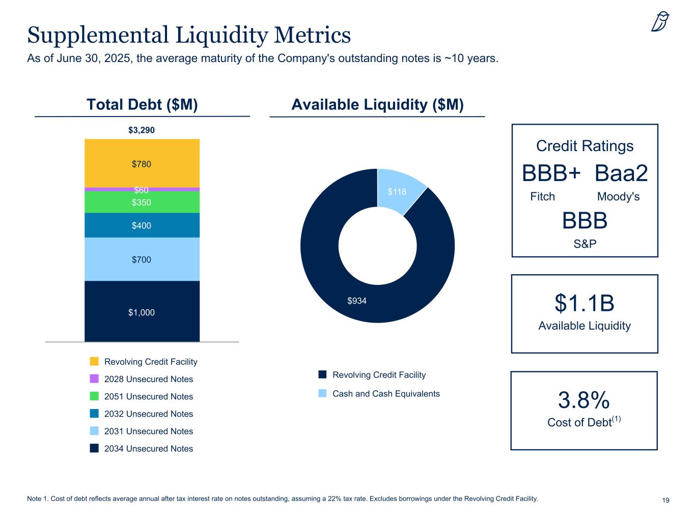 19 As of June 30, 2025, the average maturity of the Company's outstanding notes is ~10 years. Note 1. Cost of debt reflects average annual after tax interest rate on notes outstanding, assuming a 22% tax rate. Excludes borrowings under the Revolving Credit Facility. Supplemental Liquidity Metrics Credit Ratings BBB+ Baa2 Fitch Moody's BBB S&P Total Debt ($M) Available Liquidity ($M) 3.8% Cost of Debt(1) $759 $118 $934 Revolving Credit Facility Cash and Cash Equivalents $3,290 $1,000 $700 $400 $350 $60 $780 Revolving Credit Facility 2028 Unsecured Notes 2051 Unsecured Notes 2032 Unsecured Notes 2031 Unsecured Notes 2034 Unsecured Notes $1.1B Available Liquidity
