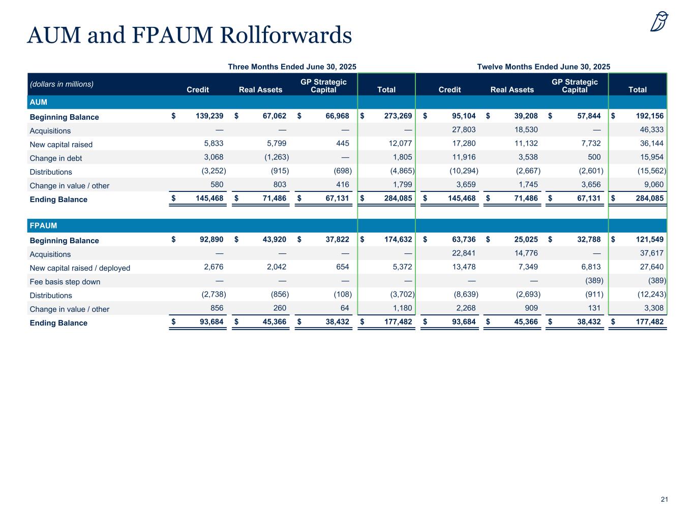 21 AUM and FPAUM Rollforwards Three Months Ended June 30, 2025 Twelve Months Ended June 30, 2025 (dollars in millions) Credit Real Assets GP Strategic Capital Total Credit Real Assets GP Strategic Capital Total AUM Beginning Balance $ 139,239 $ 67,062 $ 66,968 $ 273,269 $ 95,104 $ 39,208 $ 57,844 $ 192,156 Acquisitions — — — — 27,803 18,530 — 46,333 New capital raised 5,833 5,799 445 12,077 17,280 11,132 7,732 36,144 Change in debt 3,068 (1,263) — 1,805 11,916 3,538 500 15,954 Distributions (3,252) (915) (698) (4,865) (10,294) (2,667) (2,601) (15,562) Change in value / other 580 803 416 1,799 3,659 1,745 3,656 9,060 Ending Balance $ 145,468 $ 71,486 $ 67,131 $ 284,085 $ 145,468 $ 71,486 $ 67,131 $ 284,085 FPAUM Beginning Balance $ 92,890 $ 43,920 $ 37,822 $ 174,632 $ 63,736 $ 25,025 $ 32,788 $ 121,549 Acquisitions — — — — 22,841 14,776 — 37,617 New capital raised / deployed 2,676 2,042 654 5,372 13,478 7,349 6,813 27,640 Fee basis step down — — — — — — (389) (389) Distributions (2,738) (856) (108) (3,702) (8,639) (2,693) (911) (12,243) Change in value / other 856 260 64 1,180 2,268 909 131 3,308 Ending Balance $ 93,684 $ 45,366 $ 38,432 $ 177,482 $ 93,684 $ 45,366 $ 38,432 $ 177,482