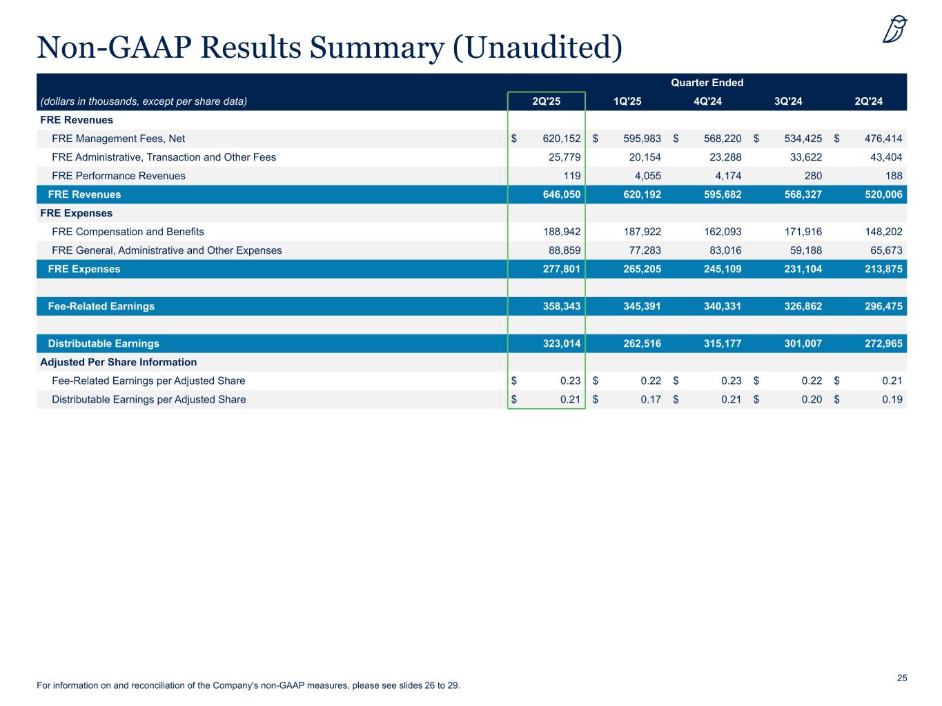 25 Quarter Ended (dollars in thousands, except per share data) 2Q'25 1Q'25 4Q'24 3Q'24 2Q'24 FRE Revenues FRE Management Fees, Net $ 620,152 $ 595,983 $ 568,220 $ 534,425 $ 476,414 FRE Administrative, Transaction and Other Fees 25,779 20,154 23,288 33,622 43,404 FRE Performance Revenues 119 4,055 4,174 280 188 FRE Revenues 646,050 620,192 595,682 568,327 520,006 FRE Expenses FRE Compensation and Benefits 188,942 187,922 162,093 171,916 148,202 FRE General, Administrative and Other Expenses 88,859 77,283 83,016 59,188 65,673 FRE Expenses 277,801 265,205 245,109 231,104 213,875 Fee-Related Earnings 358,343 345,391 340,331 326,862 296,475 Distributable Earnings 323,014 262,516 315,177 301,007 272,965 Adjusted Per Share Information Fee-Related Earnings per Adjusted Share $ 0.23 $ 0.22 $ 0.23 $ 0.22 $ 0.21 Distributable Earnings per Adjusted Share $ 0.21 $ 0.17 $ 0.21 $ 0.20 $ 0.19 Non-GAAP Results Summary (Unaudited) For information on and reconciliation of the Company's non-GAAP measures, please see slides 26 to 29.