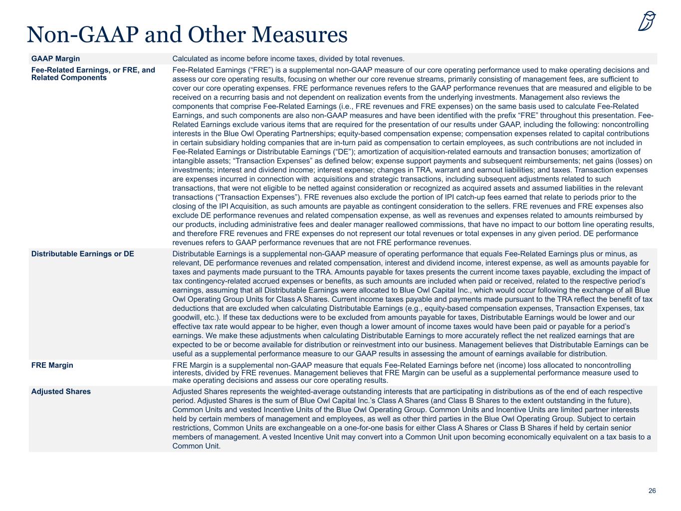 26 Non-GAAP and Other Measures GAAP Margin Calculated as income before income taxes, divided by total revenues. Fee-Related Earnings, or FRE, and Related Components Fee-Related Earnings (“FRE”) is a supplemental non-GAAP measure of our core operating performance used to make operating decisions and assess our core operating results, focusing on whether our core revenue streams, primarily consisting of management fees, are sufficient to cover our core operating expenses. FRE performance revenues refers to the GAAP performance revenues that are measured and eligible to be received on a recurring basis and not dependent on realization events from the underlying investments. Management also reviews the components that comprise Fee-Related Earnings (i.e., FRE revenues and FRE expenses) on the same basis used to calculate Fee-Related Earnings, and such components are also non-GAAP measures and have been identified with the prefix “FRE” throughout this presentation. Fee- Related Earnings exclude various items that are required for the presentation of our results under GAAP, including the following: noncontrolling interests in the Blue Owl Operating Partnerships; equity-based compensation expense; compensation expenses related to capital contributions in certain subsidiary holding companies that are in-turn paid as compensation to certain employees, as such contributions are not included in Fee-Related Earnings or Distributable Earnings (“DE”); amortization of acquisition-related earnouts and transaction bonuses; amortization of intangible assets; “Transaction Expenses” as defined below; expense support payments and subsequent reimbursements; net gains (losses) on investments; interest and dividend income; interest expense; changes in TRA, warrant and earnout liabilities; and taxes. Transaction expenses are expenses incurred in connection with acquisitions and strategic transactions, including subsequent adjustments related to such transactions, that were not eligible to be netted against consideration or recognized as acquired assets and assumed liabilities in the relevant transactions (“Transaction Expenses”). FRE revenues also exclude the portion of IPI catch-up fees earned that relate to periods prior to the closing of the IPI Acquisition, as such amounts are payable as contingent consideration to the sellers. FRE revenues and FRE expenses also exclude DE performance revenues and related compensation expense, as well as revenues and expenses related to amounts reimbursed by our products, including administrative fees and dealer manager reallowed commissions, that have no impact to our bottom line operating results, and therefore FRE revenues and FRE expenses do not represent our total revenues or total expenses in any given period. DE performance revenues refers to GAAP performance revenues that are not FRE performance revenues. Distributable Earnings or DE Distributable Earnings is a supplemental non-GAAP measure of operating performance that equals Fee-Related Earnings plus or minus, as relevant, DE performance revenues and related compensation, interest and dividend income, interest expense, as well as amounts payable for taxes and payments made pursuant to the TRA. Amounts payable for taxes presents the current income taxes payable, excluding the impact of tax contingency-related accrued expenses or benefits, as such amounts are included when paid or received, related to the respective period’s earnings, assuming that all Distributable Earnings were allocated to Blue Owl Capital Inc., which would occur following the exchange of all Blue Owl Operating Group Units for Class A Shares. Current income taxes payable and payments made pursuant to the TRA reflect the benefit of tax deductions that are excluded when calculating Distributable Earnings (e.g., equity-based compensation expenses, Transaction Expenses, tax goodwill, etc.). If these tax deductions were to be excluded from amounts payable for taxes, Distributable Earnings would be lower and our effective tax rate would appear to be higher, even though a lower amount of income taxes would have been paid or payable for a period’s earnings. We make these adjustments when calculating Distributable Earnings to more accurately reflect the net realized earnings that are expected to be or become available for distribution or reinvestment into our business. Management believes that Distributable Earnings can be useful as a supplemental performance measure to our GAAP results in assessing the amount of earnings available for distribution. FRE Margin FRE Margin is a supplemental non-GAAP measure that equals Fee-Related Earnings before net (income) loss allocated to noncontrolling interests, divided by FRE revenues. Management believes that FRE Margin can be useful as a supplemental performance measure used to make operating decisions and assess our core operating results. Adjusted Shares Adjusted Shares represents the weighted-average outstanding interests that are participating in distributions as of the end of each respective period. Adjusted Shares is the sum of Blue Owl Capital Inc.’s Class A Shares (and Class B Shares to the extent outstanding in the future), Common Units and vested Incentive Units of the Blue Owl Operating Group. Common Units and Incentive Units are limited partner interests held by certain members of management and employees, as well as other third parties in the Blue Owl Operating Group. Subject to certain restrictions, Common Units are exchangeable on a one-for-one basis for either Class A Shares or Class B Shares if held by certain senior members of management. A vested Incentive Unit may convert into a Common Unit upon becoming economically equivalent on a tax basis to a Common Unit.