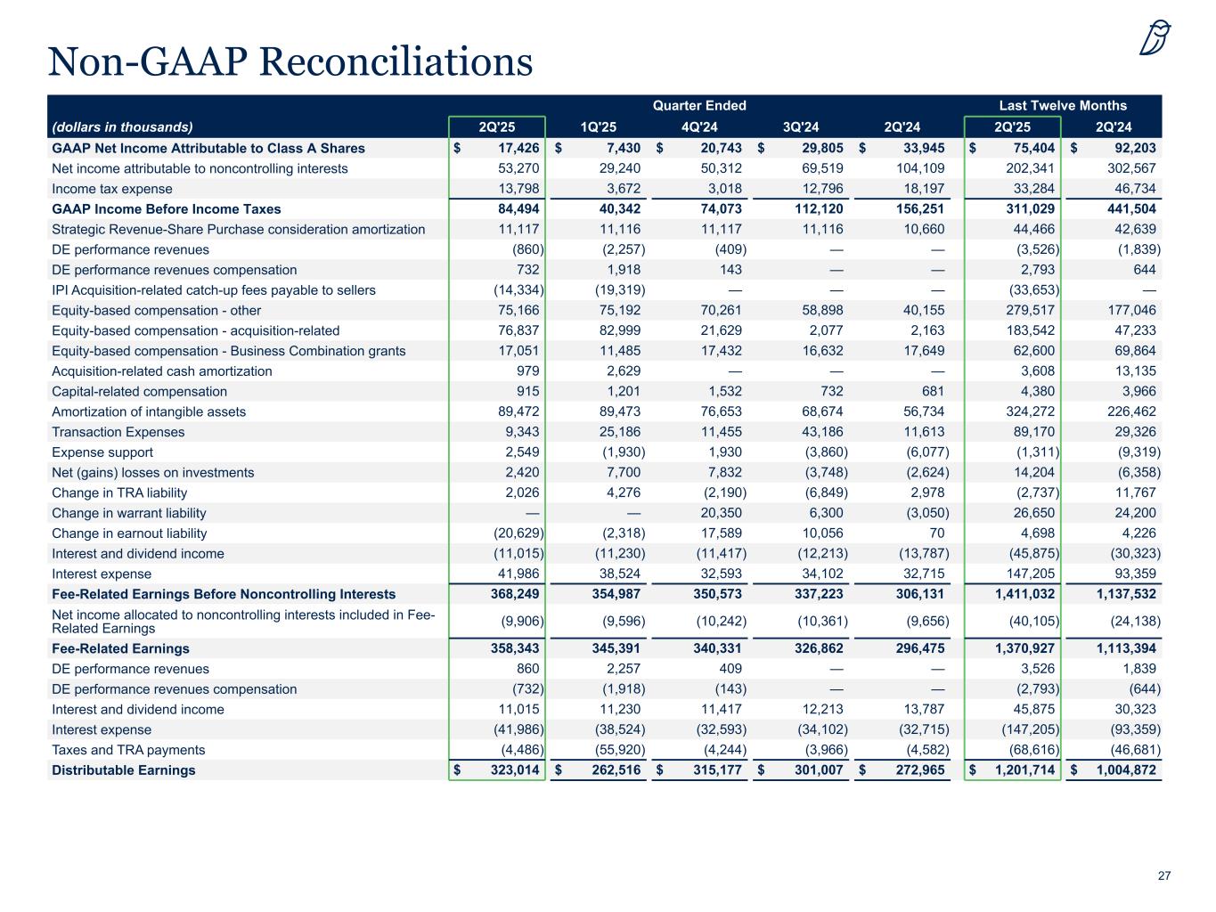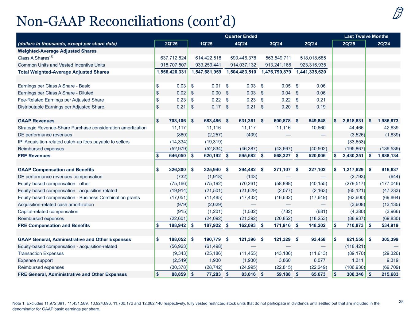 27 Non-GAAP Reconciliations Quarter Ended Last Twelve Months (dollars in thousands) 2Q'25 1Q'25 4Q'24 3Q'24 2Q'24 2Q'25 2Q'24 GAAP Net Income Attributable to Class A Shares $ 17,426 $ 7,430 $ 20,743 $ 29,805 $ 33,945 $ 75,404 $ 92,203 Net income attributable to noncontrolling interests 53,270 29,240 50,312 69,519 104,109 202,341 302,567 Income tax expense 13,798 3,672 3,018 12,796 18,197 33,284 46,734 GAAP Income Before Income Taxes 84,494 40,342 74,073 112,120 156,251 311,029 441,504 Strategic Revenue-Share Purchase consideration amortization 11,117 11,116 11,117 11,116 10,660 44,466 42,639 DE performance revenues (860) (2,257) (409) — — (3,526) (1,839) DE performance revenues compensation 732 1,918 143 — — 2,793 644 IPI Acquisition-related catch-up fees payable to sellers (14,334) (19,319) — — — (33,653) — Equity-based compensation - other 75,166 75,192 70,261 58,898 40,155 279,517 177,046 Equity-based compensation - acquisition-related 76,837 82,999 21,629 2,077 2,163 183,542 47,233 Equity-based compensation - Business Combination grants 17,051 11,485 17,432 16,632 17,649 62,600 69,864 Acquisition-related cash amortization 979 2,629 — — — 3,608 13,135 Capital-related compensation 915 1,201 1,532 732 681 4,380 3,966 Amortization of intangible assets 89,472 89,473 76,653 68,674 56,734 324,272 226,462 Transaction Expenses 9,343 25,186 11,455 43,186 11,613 89,170 29,326 Expense support 2,549 (1,930) 1,930 (3,860) (6,077) (1,311) (9,319) Net (gains) losses on investments 2,420 7,700 7,832 (3,748) (2,624) 14,204 (6,358) Change in TRA liability 2,026 4,276 (2,190) (6,849) 2,978 (2,737) 11,767 Change in warrant liability — — 20,350 6,300 (3,050) 26,650 24,200 Change in earnout liability (20,629) (2,318) 17,589 10,056 70 4,698 4,226 Interest and dividend income (11,015) (11,230) (11,417) (12,213) (13,787) (45,875) (30,323) Interest expense 41,986 38,524 32,593 34,102 32,715 147,205 93,359 Fee-Related Earnings Before Noncontrolling Interests 368,249 354,987 350,573 337,223 306,131 1,411,032 1,137,532 Net income allocated to noncontrolling interests included in Fee- Related Earnings (9,906) (9,596) (10,242) (10,361) (9,656) (40,105) (24,138) Fee-Related Earnings 358,343 345,391 340,331 326,862 296,475 1,370,927 1,113,394 DE performance revenues 860 2,257 409 — — 3,526 1,839 DE performance revenues compensation (732) (1,918) (143) — — (2,793) (644) Interest and dividend income 11,015 11,230 11,417 12,213 13,787 45,875 30,323 Interest expense (41,986) (38,524) (32,593) (34,102) (32,715) (147,205) (93,359) Taxes and TRA payments (4,486) (55,920) (4,244) (3,966) (4,582) (68,616) (46,681) Distributable Earnings $ 323,014 $ 262,516 $ 315,177 $ 301,007 $ 272,965 $ 1,201,714 $ 1,004,872