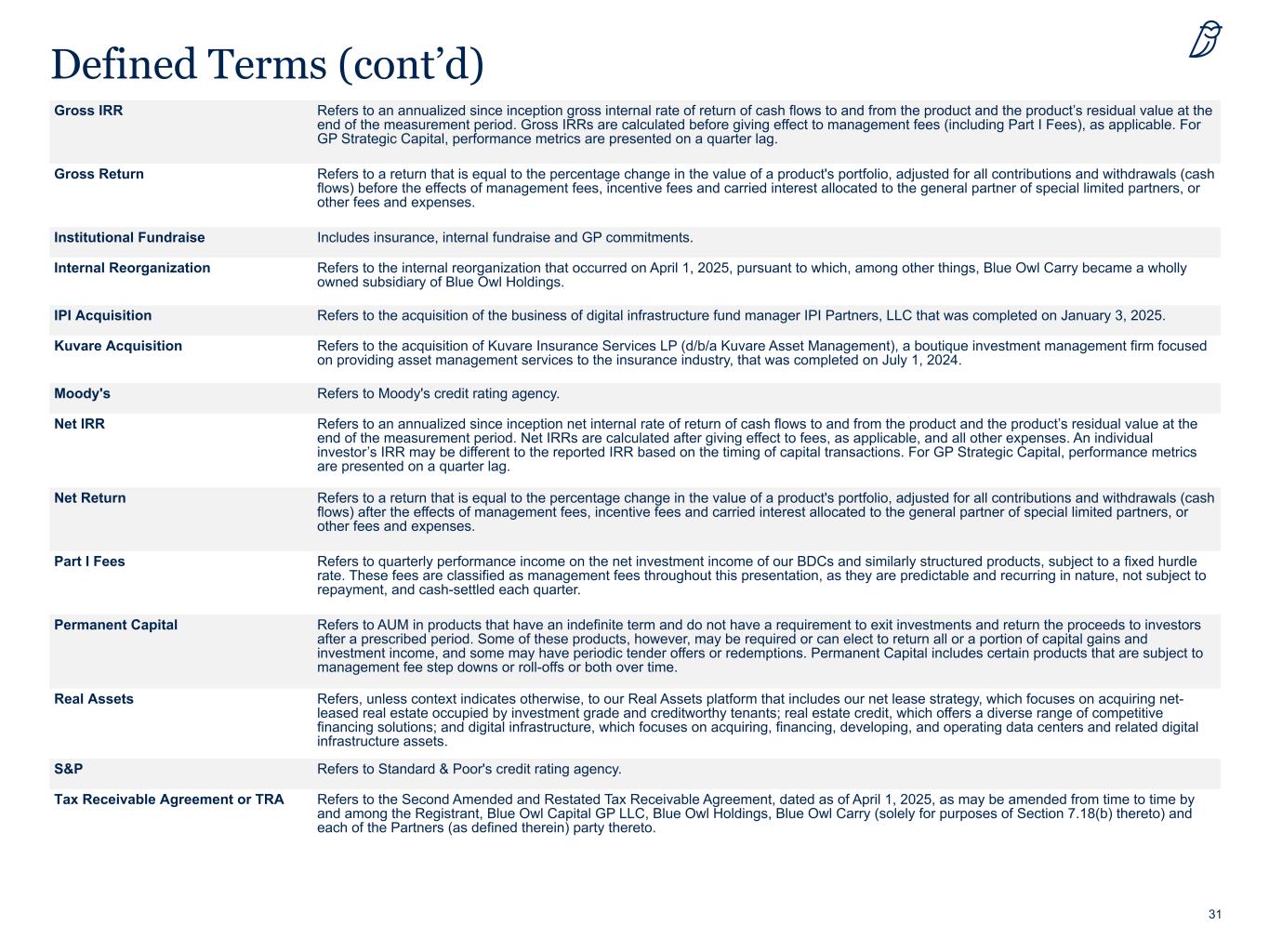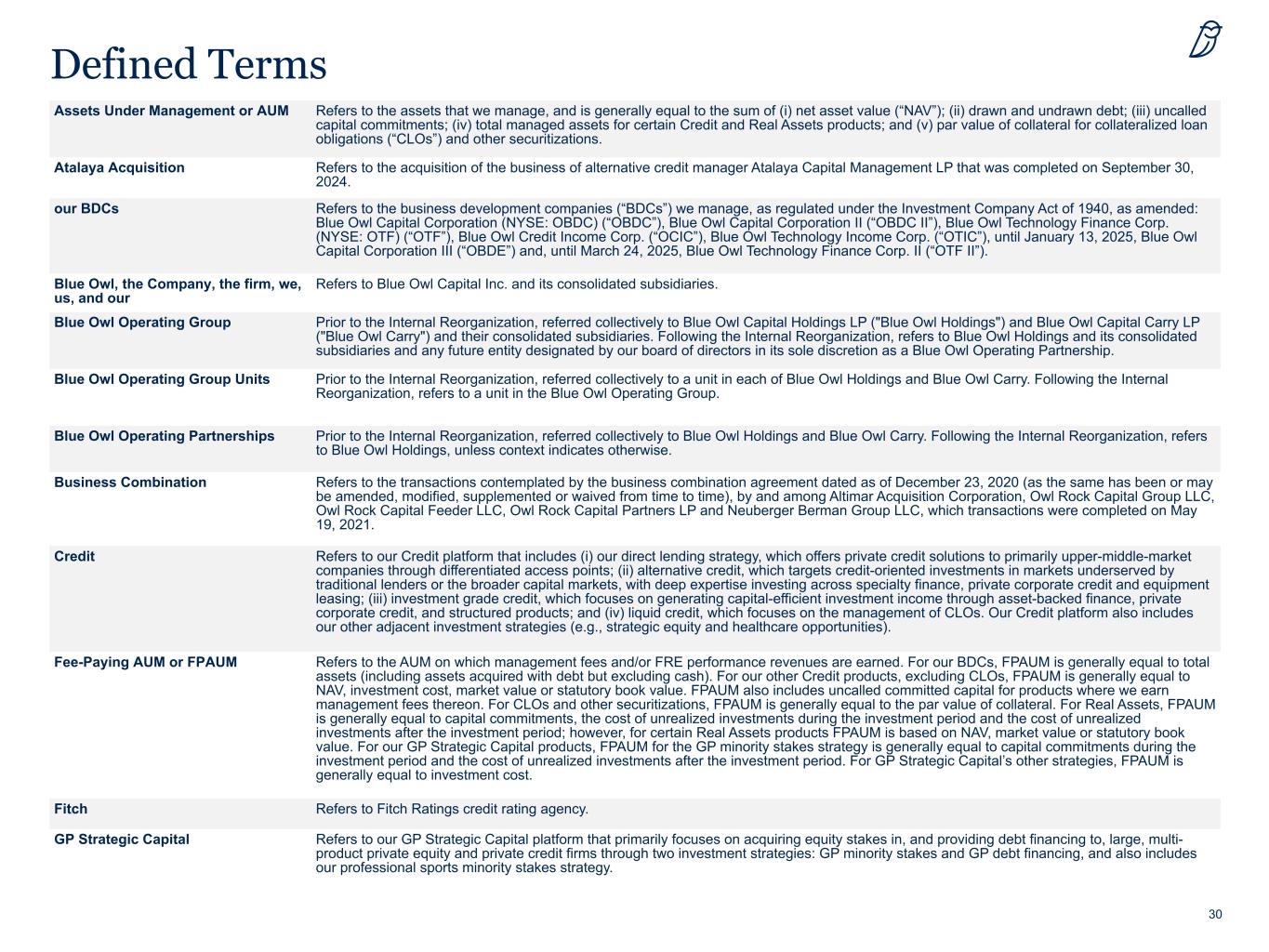 30 Defined Terms Assets Under Management or AUM Refers to the assets that we manage, and is generally equal to the sum of (i) net asset value (“NAV”); (ii) drawn and undrawn debt; (iii) uncalled capital commitments; (iv) total managed assets for certain Credit and Real Assets products; and (v) par value of collateral for collateralized loan obligations (“CLOs”) and other securitizations. Atalaya Acquisition Refers to the acquisition of the business of alternative credit manager Atalaya Capital Management LP that was completed on September 30, 2024. our BDCs Refers to the business development companies (“BDCs”) we manage, as regulated under the Investment Company Act of 1940, as amended: Blue Owl Capital Corporation (NYSE: OBDC) (“OBDC”), Blue Owl Capital Corporation II (“OBDC II”), Blue Owl Technology Finance Corp. (NYSE: OTF) (“OTF”), Blue Owl Credit Income Corp. (“OCIC”), Blue Owl Technology Income Corp. (“OTIC”), until January 13, 2025, Blue Owl Capital Corporation III (“OBDE”) and, until March 24, 2025, Blue Owl Technology Finance Corp. II (“OTF II”). Blue Owl, the Company, the firm, we, us, and our Refers to Blue Owl Capital Inc. and its consolidated subsidiaries. Blue Owl Operating Group Prior to the Internal Reorganization, referred collectively to Blue Owl Capital Holdings LP ("Blue Owl Holdings") and Blue Owl Capital Carry LP ("Blue Owl Carry") and their consolidated subsidiaries. Following the Internal Reorganization, refers to Blue Owl Holdings and its consolidated subsidiaries and any future entity designated by our board of directors in its sole discretion as a Blue Owl Operating Partnership. Blue Owl Operating Group Units Prior to the Internal Reorganization, referred collectively to a unit in each of Blue Owl Holdings and Blue Owl Carry. Following the Internal Reorganization, refers to a unit in the Blue Owl Operating Group. Blue Owl Operating Partnerships Prior to the Internal Reorganization, referred collectively to Blue Owl Holdings and Blue Owl Carry. Following the Internal Reorganization, refers to Blue Owl Holdings, unless context indicates otherwise. Business Combination Refers to the transactions contemplated by the business combination agreement dated as of December 23, 2020 (as the same has been or may be amended, modified, supplemented or waived from time to time), by and among Altimar Acquisition Corporation, Owl Rock Capital Group LLC, Owl Rock Capital Feeder LLC, Owl Rock Capital Partners LP and Neuberger Berman Group LLC, which transactions were completed on May 19, 2021. Credit Refers to our Credit platform that includes (i) our direct lending strategy, which offers private credit solutions to primarily upper-middle-market companies through differentiated access points; (ii) alternative credit, which targets credit-oriented investments in markets underserved by traditional lenders or the broader capital markets, with deep expertise investing across specialty finance, private corporate credit and equipment leasing; (iii) investment grade credit, which focuses on generating capital-efficient investment income through asset-backed finance, private corporate credit, and structured products; and (iv) liquid credit, which focuses on the management of CLOs. Our Credit platform also includes our other adjacent investment strategies (e.g., strategic equity and healthcare opportunities). Fee-Paying AUM or FPAUM Refers to the AUM on which management fees and/or FRE performance revenues are earned. For our BDCs, FPAUM is generally equal to total assets (including assets acquired with debt but excluding cash). For our other Credit products, excluding CLOs, FPAUM is generally equal to NAV, investment cost, market value or statutory book value. FPAUM also includes uncalled committed capital for products where we earn management fees thereon. For CLOs and other securitizations, FPAUM is generally equal to the par value of collateral. For Real Assets, FPAUM is generally equal to capital commitments, the cost of unrealized investments during the investment period and the cost of unrealized investments after the investment period; however, for certain Real Assets products FPAUM is based on NAV, market value or statutory book value. For our GP Strategic Capital products, FPAUM for the GP minority stakes strategy is generally equal to capital commitments during the investment period and the cost of unrealized investments after the investment period. For GP Strategic Capital’s other strategies, FPAUM is generally equal to investment cost. Fitch Refers to Fitch Ratings credit rating agency. GP Strategic Capital Refers to our GP Strategic Capital platform that primarily focuses on acquiring equity stakes in, and providing debt financing to, large, multi- product private equity and private credit firms through two investment strategies: GP minority stakes and GP debt financing, and also includes our professional sports minority stakes strategy.