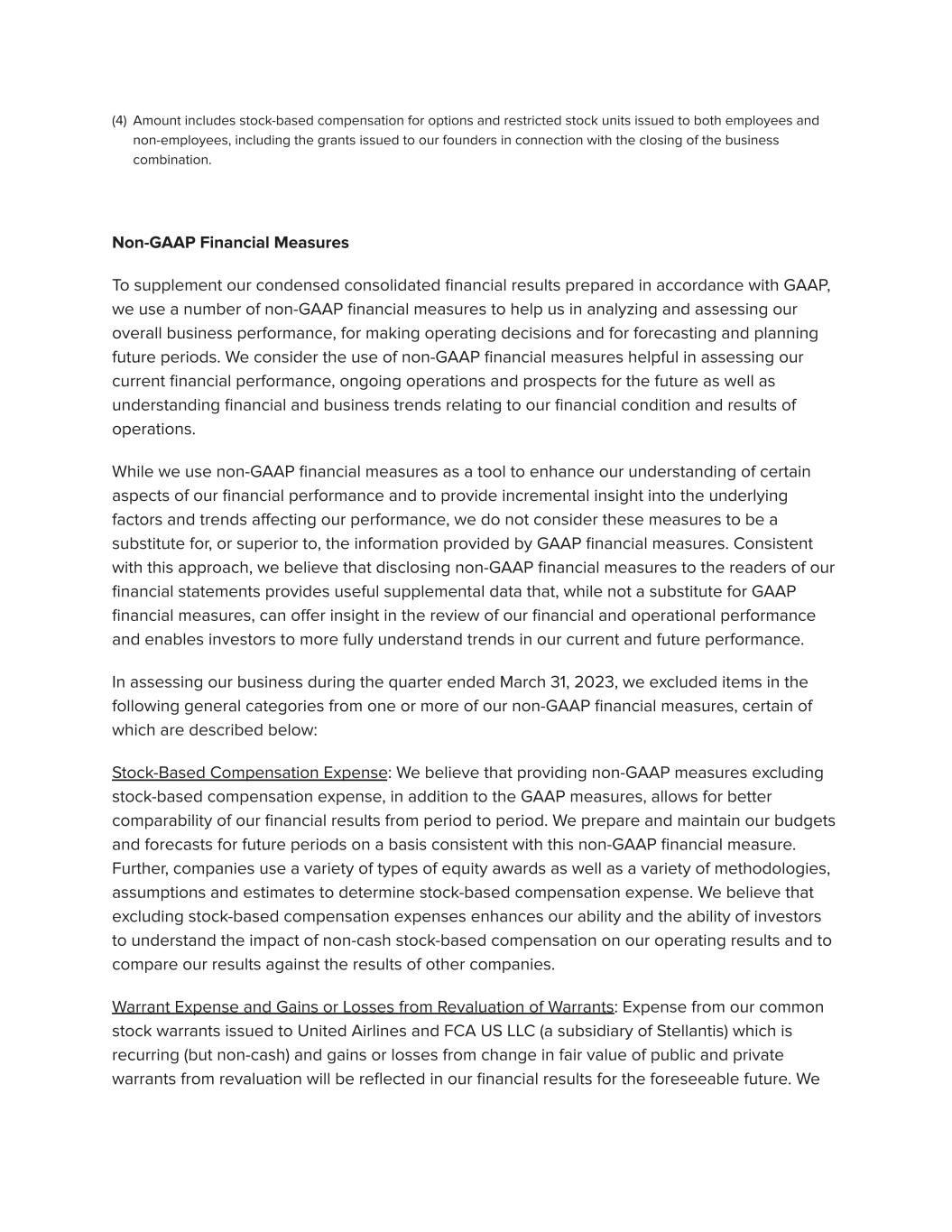 (4) Amount includes stock-based compensation for options and restricted stock units issued to both employees and non-employees, including the grants issued to our founders in connection with the closing of the business combination. Non-GAAP Financial Measures To supplement our condensed consolidated financial results prepared in accordance with GAAP, we use a number of non-GAAP financial measures to help us in analyzing and assessing our overall business performance, for making operating decisions and for forecasting and planning future periods. We consider the use of non-GAAP financial measures helpful in assessing our current financial performance, ongoing operations and prospects for the future as well as understanding financial and business trends relating to our financial condition and results of operations. While we use non-GAAP financial measures as a tool to enhance our understanding of certain aspects of our financial performance and to provide incremental insight into the underlying factors and trends affecting our performance, we do not consider these measures to be a substitute for, or superior to, the information provided by GAAP financial measures. Consistent with this approach, we believe that disclosing non-GAAP financial measures to the readers of our financial statements provides useful supplemental data that, while not a substitute for GAAP financial measures, can offer insight in the review of our financial and operational performance and enables investors to more fully understand trends in our current and future performance. In assessing our business during the quarter ended March 31, 2023, we excluded items in the following general categories from one or more of our non-GAAP financial measures, certain of which are described below: Stock-Based Compensation Expense: We believe that providing non-GAAP measures excluding stock-based compensation expense, in addition to the GAAP measures, allows for better comparability of our financial results from period to period. We prepare and maintain our budgets and forecasts for future periods on a basis consistent with this non-GAAP financial measure. Further, companies use a variety of types of equity awards as well as a variety of methodologies, assumptions and estimates to determine stock-based compensation expense. We believe that excluding stock-based compensation expenses enhances our ability and the ability of investors to understand the impact of non-cash stock-based compensation on our operating results and to compare our results against the results of other companies. Warrant Expense and Gains or Losses from Revaluation of Warrants: Expense from our common stock warrants issued to United Airlines and FCA US LLC (a subsidiary of Stellantis) which is recurring (but non-cash) and gains or losses from change in fair value of public and private warrants from revaluation will be reflected in our financial results for the foreseeable future. We