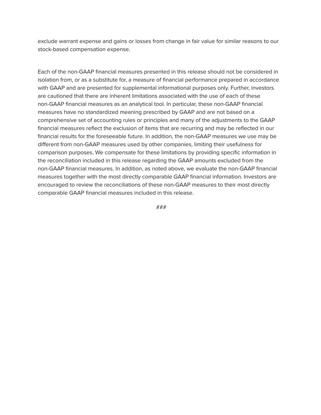 exclude warrant expense and gains or losses from change in fair value for similar reasons to our stock-based compensation expense. Each of the non-GAAP financial measures presented in this release should not be considered in isolation from, or as a substitute for, a measure of financial performance prepared in accordance with GAAP and are presented for supplemental informational purposes only. Further, investors are cautioned that there are inherent limitations associated with the use of each of these non-GAAP financial measures as an analytical tool. In particular, these non-GAAP financial measures have no standardized meaning prescribed by GAAP and are not based on a comprehensive set of accounting rules or principles and many of the adjustments to the GAAP financial measures reflect the exclusion of items that are recurring and may be reflected in our financial results for the foreseeable future. In addition, the non-GAAP measures we use may be different from non-GAAP measures used by other companies, limiting their usefulness for comparison purposes. We compensate for these limitations by providing specific information in the reconciliation included in this release regarding the GAAP amounts excluded from the non-GAAP financial measures. In addition, as noted above, we evaluate the non-GAAP financial measures together with the most directly comparable GAAP financial information. Investors are encouraged to review the reconciliations of these non-GAAP measures to their most directly comparable GAAP financial measures included in this release. ###