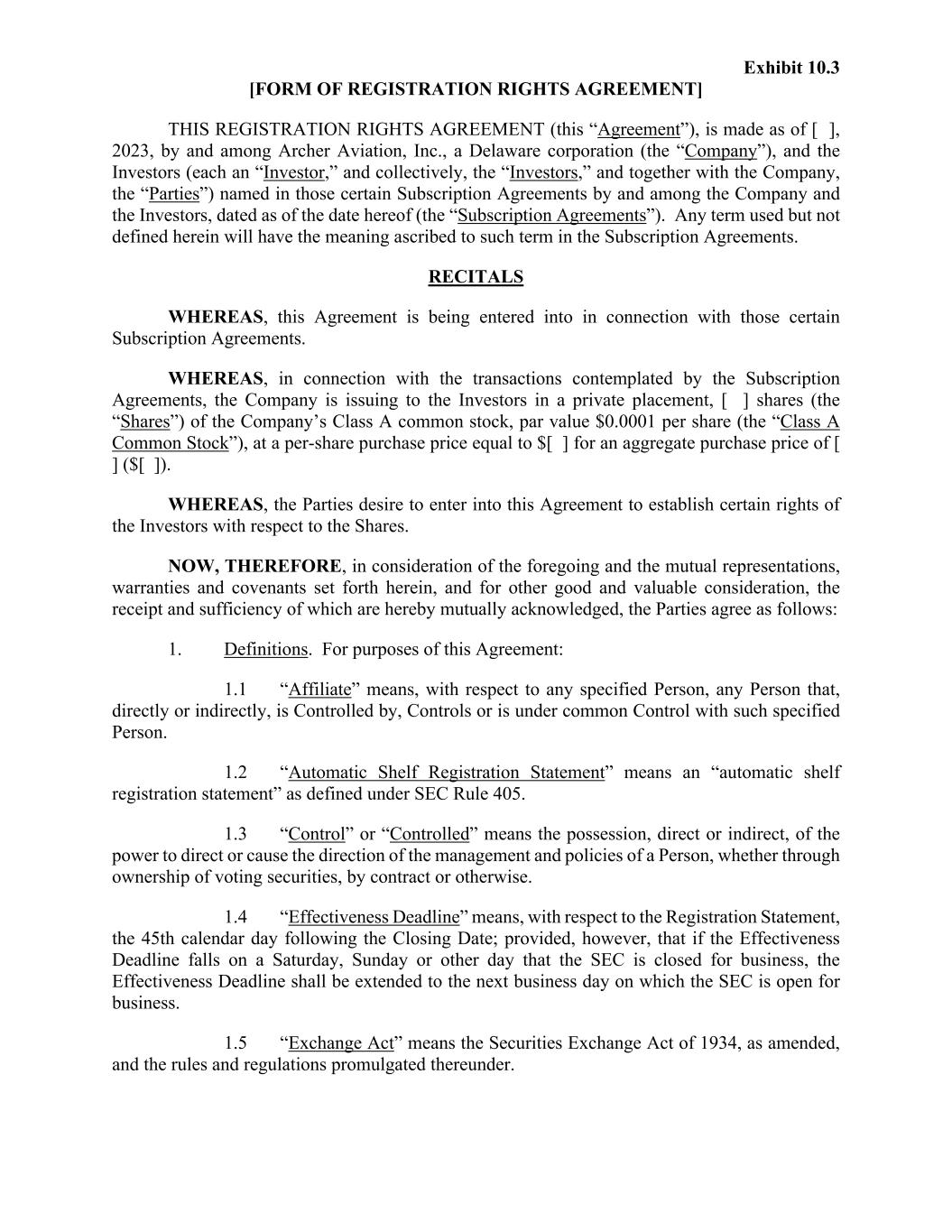 Exhibit 10.3 [FORM OF REGISTRATION RIGHTS AGREEMENT] THIS REGISTRATION RIGHTS AGREEMENT (this “Agreement”), is made as of [ ], 2023, by and among Archer Aviation, Inc., a Delaware corporation (the “Company”), and the Investors (each an “Investor,” and collectively, the “Investors,” and together with the Company, the “Parties”) named in those certain Subscription Agreements by and among the Company and the Investors, dated as of the date hereof (the “Subscription Agreements”). Any term used but not defined herein will have the meaning ascribed to such term in the Subscription Agreements. RECITALS WHEREAS, this Agreement is being entered into in connection with those certain Subscription Agreements. WHEREAS, in connection with the transactions contemplated by the Subscription Agreements, the Company is issuing to the Investors in a private placement, [ ] shares (the “Shares”) of the Company’s Class A common stock, par value $0.0001 per share (the “Class A Common Stock”), at a per-share purchase price equal to $[ ] for an aggregate purchase price of [ ] ($[ ]). WHEREAS, the Parties desire to enter into this Agreement to establish certain rights of the Investors with respect to the Shares. NOW, THEREFORE, in consideration of the foregoing and the mutual representations, warranties and covenants set forth herein, and for other good and valuable consideration, the receipt and sufficiency of which are hereby mutually acknowledged, the Parties agree as follows: 1. Definitions. For purposes of this Agreement: 1.1 “Affiliate” means, with respect to any specified Person, any Person that, directly or indirectly, is Controlled by, Controls or is under common Control with such specified Person. 1.2 “Automatic Shelf Registration Statement” means an “automatic shelf registration statement” as defined under SEC Rule 405. 1.3 “Control” or “Controlled” means the possession, direct or indirect, of the power to direct or cause the direction of the management and policies of a Person, whether through ownership of voting securities, by contract or otherwise. 1.4 “Effectiveness Deadline” means, with respect to the Registration Statement, the 45th calendar day following the Closing Date; provided, however, that if the Effectiveness Deadline falls on a Saturday, Sunday or other day that the SEC is closed for business, the Effectiveness Deadline shall be extended to the next business day on which the SEC is open for business. 1.5 “Exchange Act” means the Securities Exchange Act of 1934, as amended, and the rules and regulations promulgated thereunder.