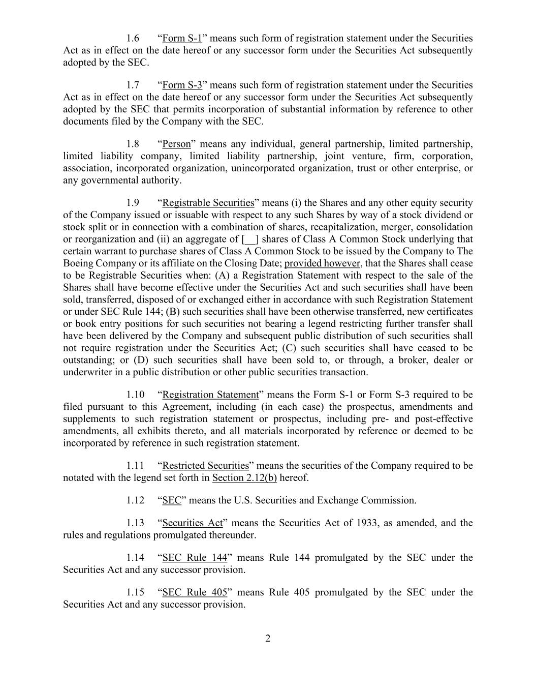 2 1.6 “Form S-1” means such form of registration statement under the Securities Act as in effect on the date hereof or any successor form under the Securities Act subsequently adopted by the SEC. 1.7 “Form S-3” means such form of registration statement under the Securities Act as in effect on the date hereof or any successor form under the Securities Act subsequently adopted by the SEC that permits incorporation of substantial information by reference to other documents filed by the Company with the SEC. 1.8 “Person” means any individual, general partnership, limited partnership, limited liability company, limited liability partnership, joint venture, firm, corporation, association, incorporated organization, unincorporated organization, trust or other enterprise, or any governmental authority. 1.9 “Registrable Securities” means (i) the Shares and any other equity security of the Company issued or issuable with respect to any such Shares by way of a stock dividend or stock split or in connection with a combination of shares, recapitalization, merger, consolidation or reorganization and (ii) an aggregate of [__] shares of Class A Common Stock underlying that certain warrant to purchase shares of Class A Common Stock to be issued by the Company to The Boeing Company or its affiliate on the Closing Date; provided however, that the Shares shall cease to be Registrable Securities when: (A) a Registration Statement with respect to the sale of the Shares shall have become effective under the Securities Act and such securities shall have been sold, transferred, disposed of or exchanged either in accordance with such Registration Statement or under SEC Rule 144; (B) such securities shall have been otherwise transferred, new certificates or book entry positions for such securities not bearing a legend restricting further transfer shall have been delivered by the Company and subsequent public distribution of such securities shall not require registration under the Securities Act; (C) such securities shall have ceased to be outstanding; or (D) such securities shall have been sold to, or through, a broker, dealer or underwriter in a public distribution or other public securities transaction. 1.10 “Registration Statement” means the Form S-1 or Form S-3 required to be filed pursuant to this Agreement, including (in each case) the prospectus, amendments and supplements to such registration statement or prospectus, including pre- and post-effective amendments, all exhibits thereto, and all materials incorporated by reference or deemed to be incorporated by reference in such registration statement. 1.11 “Restricted Securities” means the securities of the Company required to be notated with the legend set forth in Section 2.12(b) hereof. 1.12 “SEC” means the U.S. Securities and Exchange Commission. 1.13 “Securities Act” means the Securities Act of 1933, as amended, and the rules and regulations promulgated thereunder. 1.14 “SEC Rule 144” means Rule 144 promulgated by the SEC under the Securities Act and any successor provision. 1.15 “SEC Rule 405” means Rule 405 promulgated by the SEC under the Securities Act and any successor provision.
