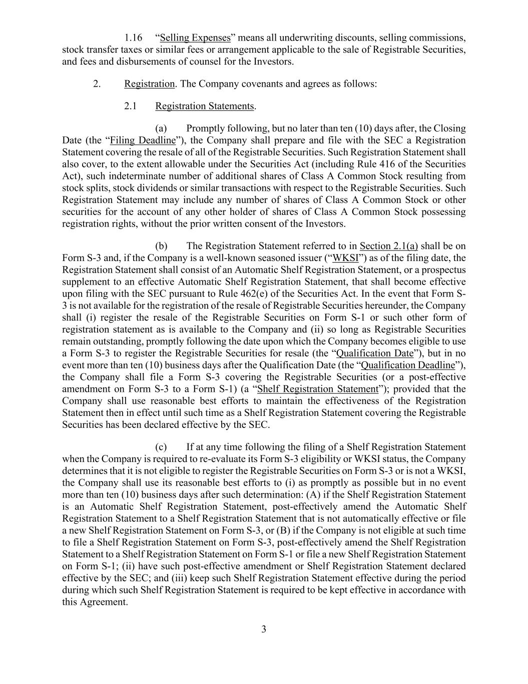 3 1.16 “Selling Expenses” means all underwriting discounts, selling commissions, stock transfer taxes or similar fees or arrangement applicable to the sale of Registrable Securities, and fees and disbursements of counsel for the Investors. 2. Registration. The Company covenants and agrees as follows: 2.1 Registration Statements. (a) Promptly following, but no later than ten (10) days after, the Closing Date (the “Filing Deadline”), the Company shall prepare and file with the SEC a Registration Statement covering the resale of all of the Registrable Securities. Such Registration Statement shall also cover, to the extent allowable under the Securities Act (including Rule 416 of the Securities Act), such indeterminate number of additional shares of Class A Common Stock resulting from stock splits, stock dividends or similar transactions with respect to the Registrable Securities. Such Registration Statement may include any number of shares of Class A Common Stock or other securities for the account of any other holder of shares of Class A Common Stock possessing registration rights, without the prior written consent of the Investors. (b) The Registration Statement referred to in Section 2.1(a) shall be on Form S-3 and, if the Company is a well-known seasoned issuer (“WKSI”) as of the filing date, the Registration Statement shall consist of an Automatic Shelf Registration Statement, or a prospectus supplement to an effective Automatic Shelf Registration Statement, that shall become effective upon filing with the SEC pursuant to Rule 462(e) of the Securities Act. In the event that Form S- 3 is not available for the registration of the resale of Registrable Securities hereunder, the Company shall (i) register the resale of the Registrable Securities on Form S-1 or such other form of registration statement as is available to the Company and (ii) so long as Registrable Securities remain outstanding, promptly following the date upon which the Company becomes eligible to use a Form S-3 to register the Registrable Securities for resale (the “Qualification Date”), but in no event more than ten (10) business days after the Qualification Date (the “Qualification Deadline”), the Company shall file a Form S-3 covering the Registrable Securities (or a post-effective amendment on Form S-3 to a Form S-1) (a “Shelf Registration Statement”); provided that the Company shall use reasonable best efforts to maintain the effectiveness of the Registration Statement then in effect until such time as a Shelf Registration Statement covering the Registrable Securities has been declared effective by the SEC. (c) If at any time following the filing of a Shelf Registration Statement when the Company is required to re-evaluate its Form S-3 eligibility or WKSI status, the Company determines that it is not eligible to register the Registrable Securities on Form S-3 or is not a WKSI, the Company shall use its reasonable best efforts to (i) as promptly as possible but in no event more than ten (10) business days after such determination: (A) if the Shelf Registration Statement is an Automatic Shelf Registration Statement, post-effectively amend the Automatic Shelf Registration Statement to a Shelf Registration Statement that is not automatically effective or file a new Shelf Registration Statement on Form S-3, or (B) if the Company is not eligible at such time to file a Shelf Registration Statement on Form S-3, post-effectively amend the Shelf Registration Statement to a Shelf Registration Statement on Form S-1 or file a new Shelf Registration Statement on Form S-1; (ii) have such post-effective amendment or Shelf Registration Statement declared effective by the SEC; and (iii) keep such Shelf Registration Statement effective during the period during which such Shelf Registration Statement is required to be kept effective in accordance with this Agreement.