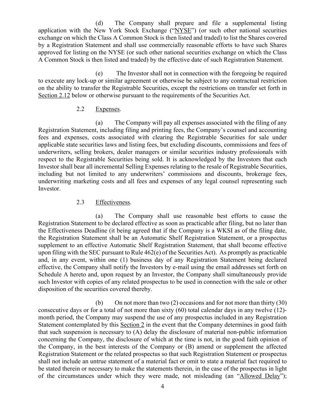 4 (d) The Company shall prepare and file a supplemental listing application with the New York Stock Exchange (“NYSE”) (or such other national securities exchange on which the Class A Common Stock is then listed and traded) to list the Shares covered by a Registration Statement and shall use commercially reasonable efforts to have such Shares approved for listing on the NYSE (or such other national securities exchange on which the Class A Common Stock is then listed and traded) by the effective date of such Registration Statement. (e) The Investor shall not in connection with the foregoing be required to execute any lock-up or similar agreement or otherwise be subject to any contractual restriction on the ability to transfer the Registrable Securities, except the restrictions on transfer set forth in Section 2.12 below or otherwise pursuant to the requirements of the Securities Act. 2.2 Expenses. (a) The Company will pay all expenses associated with the filing of any Registration Statement, including filing and printing fees, the Company’s counsel and accounting fees and expenses, costs associated with clearing the Registrable Securities for sale under applicable state securities laws and listing fees, but excluding discounts, commissions and fees of underwriters, selling brokers, dealer managers or similar securities industry professionals with respect to the Registrable Securities being sold. It is acknowledged by the Investors that each Investor shall bear all incremental Selling Expenses relating to the resale of Registrable Securities, including but not limited to any underwriters’ commissions and discounts, brokerage fees, underwriting marketing costs and all fees and expenses of any legal counsel representing such Investor. 2.3 Effectiveness. (a) The Company shall use reasonable best efforts to cause the Registration Statement to be declared effective as soon as practicable after filing, but no later than the Effectiveness Deadline (it being agreed that if the Company is a WKSI as of the filing date, the Registration Statement shall be an Automatic Shelf Registration Statement, or a prospectus supplement to an effective Automatic Shelf Registration Statement, that shall become effective upon filing with the SEC pursuant to Rule 462(e) of the Securities Act). As promptly as practicable and, in any event, within one (1) business day of any Registration Statement being declared effective, the Company shall notify the Investors by e-mail using the email addresses set forth on Schedule A hereto and, upon request by an Investor, the Company shall simultaneously provide such Investor with copies of any related prospectus to be used in connection with the sale or other disposition of the securities covered thereby. (b) On not more than two (2) occasions and for not more than thirty (30) consecutive days or for a total of not more than sixty (60) total calendar days in any twelve (12)- month period, the Company may suspend the use of any prospectus included in any Registration Statement contemplated by this Section 2 in the event that the Company determines in good faith that such suspension is necessary to (A) delay the disclosure of material non-public information concerning the Company, the disclosure of which at the time is not, in the good faith opinion of the Company, in the best interests of the Company or (B) amend or supplement the affected Registration Statement or the related prospectus so that such Registration Statement or prospectus shall not include an untrue statement of a material fact or omit to state a material fact required to be stated therein or necessary to make the statements therein, in the case of the prospectus in light of the circumstances under which they were made, not misleading (an “Allowed Delay”);
