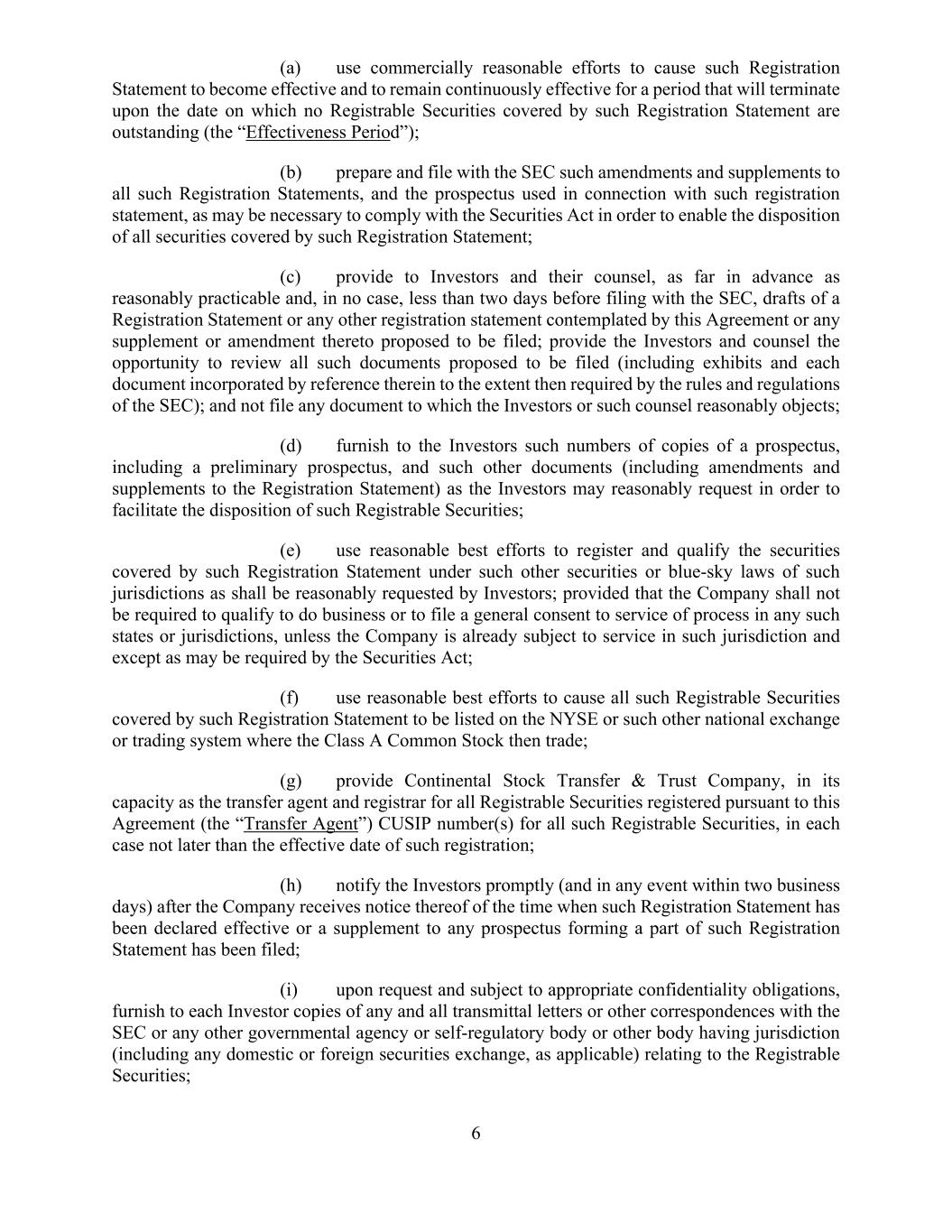 6 (a) use commercially reasonable efforts to cause such Registration Statement to become effective and to remain continuously effective for a period that will terminate upon the date on which no Registrable Securities covered by such Registration Statement are outstanding (the “Effectiveness Period”); (b) prepare and file with the SEC such amendments and supplements to all such Registration Statements, and the prospectus used in connection with such registration statement, as may be necessary to comply with the Securities Act in order to enable the disposition of all securities covered by such Registration Statement; (c) provide to Investors and their counsel, as far in advance as reasonably practicable and, in no case, less than two days before filing with the SEC, drafts of a Registration Statement or any other registration statement contemplated by this Agreement or any supplement or amendment thereto proposed to be filed; provide the Investors and counsel the opportunity to review all such documents proposed to be filed (including exhibits and each document incorporated by reference therein to the extent then required by the rules and regulations of the SEC); and not file any document to which the Investors or such counsel reasonably objects; (d) furnish to the Investors such numbers of copies of a prospectus, including a preliminary prospectus, and such other documents (including amendments and supplements to the Registration Statement) as the Investors may reasonably request in order to facilitate the disposition of such Registrable Securities; (e) use reasonable best efforts to register and qualify the securities covered by such Registration Statement under such other securities or blue-sky laws of such jurisdictions as shall be reasonably requested by Investors; provided that the Company shall not be required to qualify to do business or to file a general consent to service of process in any such states or jurisdictions, unless the Company is already subject to service in such jurisdiction and except as may be required by the Securities Act; (f) use reasonable best efforts to cause all such Registrable Securities covered by such Registration Statement to be listed on the NYSE or such other national exchange or trading system where the Class A Common Stock then trade; (g) provide Continental Stock Transfer & Trust Company, in its capacity as the transfer agent and registrar for all Registrable Securities registered pursuant to this Agreement (the “Transfer Agent”) CUSIP number(s) for all such Registrable Securities, in each case not later than the effective date of such registration; (h) notify the Investors promptly (and in any event within two business days) after the Company receives notice thereof of the time when such Registration Statement has been declared effective or a supplement to any prospectus forming a part of such Registration Statement has been filed; (i) upon request and subject to appropriate confidentiality obligations, furnish to each Investor copies of any and all transmittal letters or other correspondences with the SEC or any other governmental agency or self-regulatory body or other body having jurisdiction (including any domestic or foreign securities exchange, as applicable) relating to the Registrable Securities;